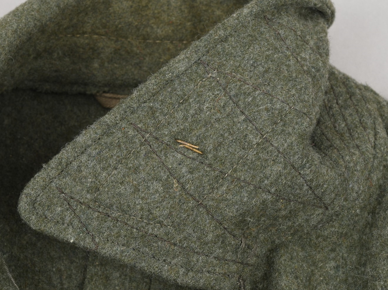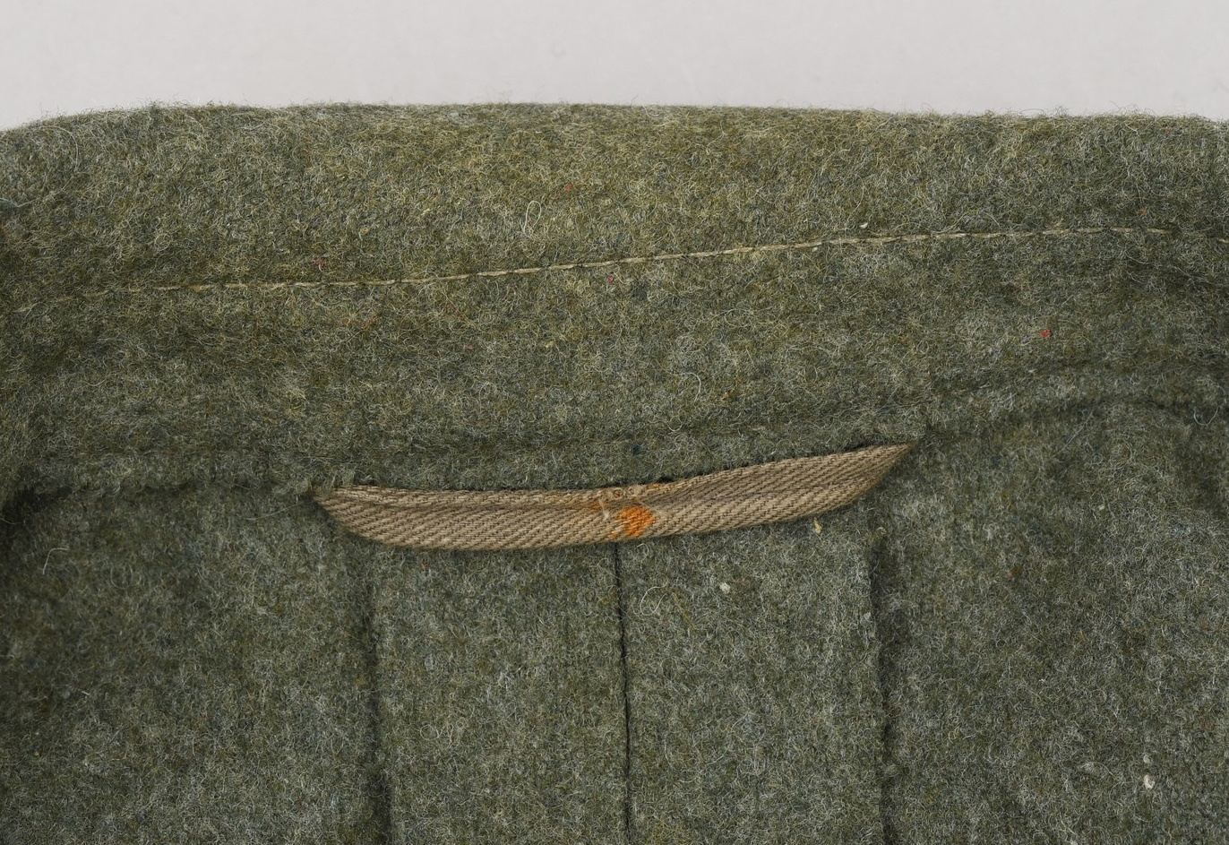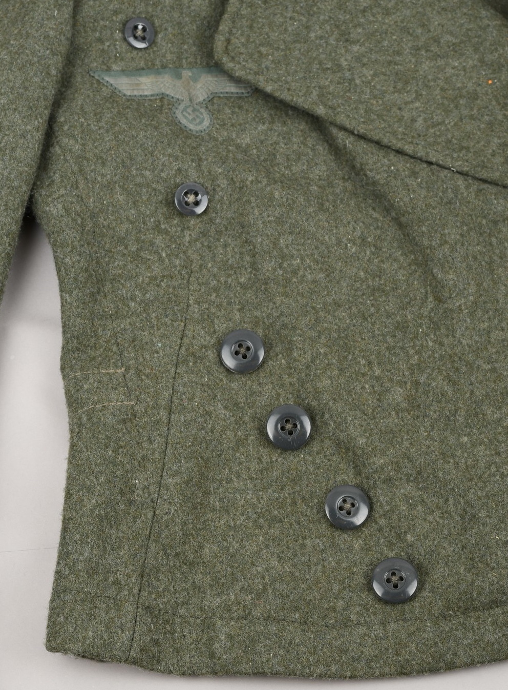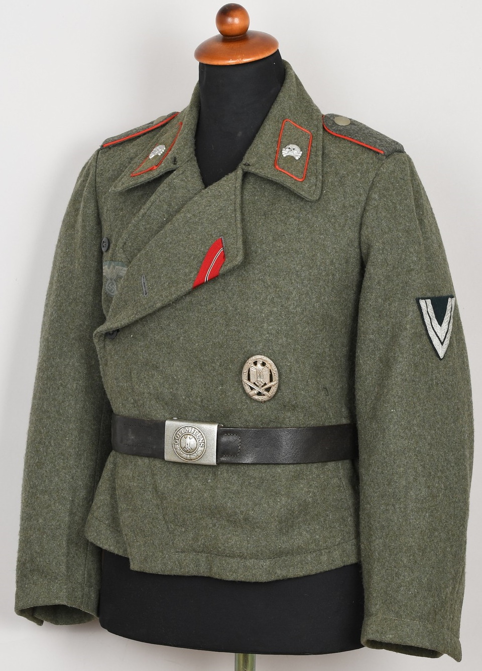 Field-grey wool construction, double breasted tunic with small fold back lapels and a large lay down collar. The left front closure panel of the tunic has four hidden button holes and an additional three, visible button holes on the fold back lapel. The right front closure panel has all four large and two of the three smaller corresponding buttons intact. The edge of the right front closure panel has an additional two, small, buttons underneath the overlapping left closure panel with corresponding, internal, fabric loops for a secure closure with a neat appearance. The tunic also has a single metal hook and eye positioned at the forward neckline for a secure closure. The right breast has an machine woven, national eagle in matte grey threads on a cut-out, woven field-grey rayon base. The eagle is factory hand and machine sewn in place. The reverse of the tunic has a central seam. EM slip on shoulder straps with red rayon piping slided and buttoned in place. The collar has the typical zig-zag reinforcement stitching to the reverse. The collar features collar tabs with red rayon piping and silver washed . The collar features the elongated, field-grey wool collar tabs with the typical, silver washed, Danziger style Totenkopf cyphers pinned in place. The collar tabs are machine sewn to the collar. To the upper left sleeve is a obergefreiters rank chevron on bottle green cloth backing neatly hand sewn in place. East front ribbon is hand sewn to the upper button hole and there is award loops sewn for one award. The interior breast panels are lined in silver/grey rayon cloth. The lining has a patch pocket to the right breast panel and a slash patch pocket to the left breast panel. The interior of the tunic also has two, rayon straps with six stitched eyelets to each, situated at the waistline to secure the belt support hooks. The interior also has a tunnel looped, grey drill cloth fit adjustment drawstring to each of the waistline side panels. Clearly size and Rbnr marking to the inner left lining.