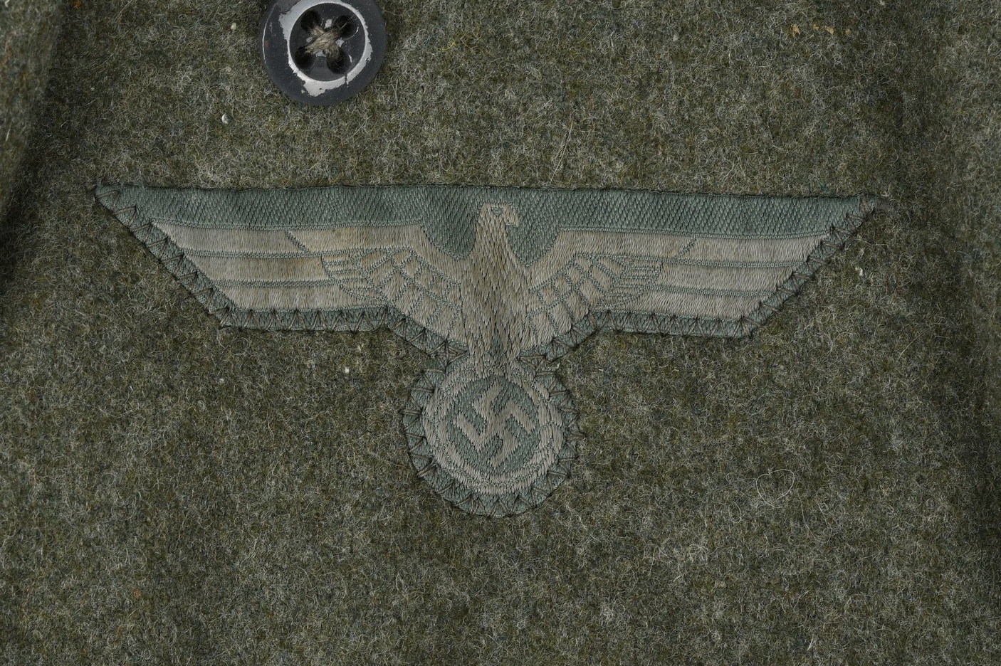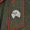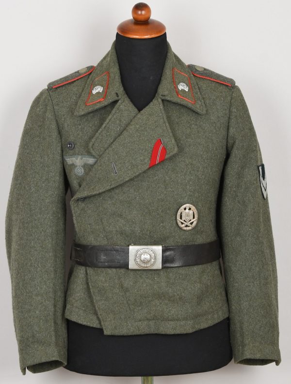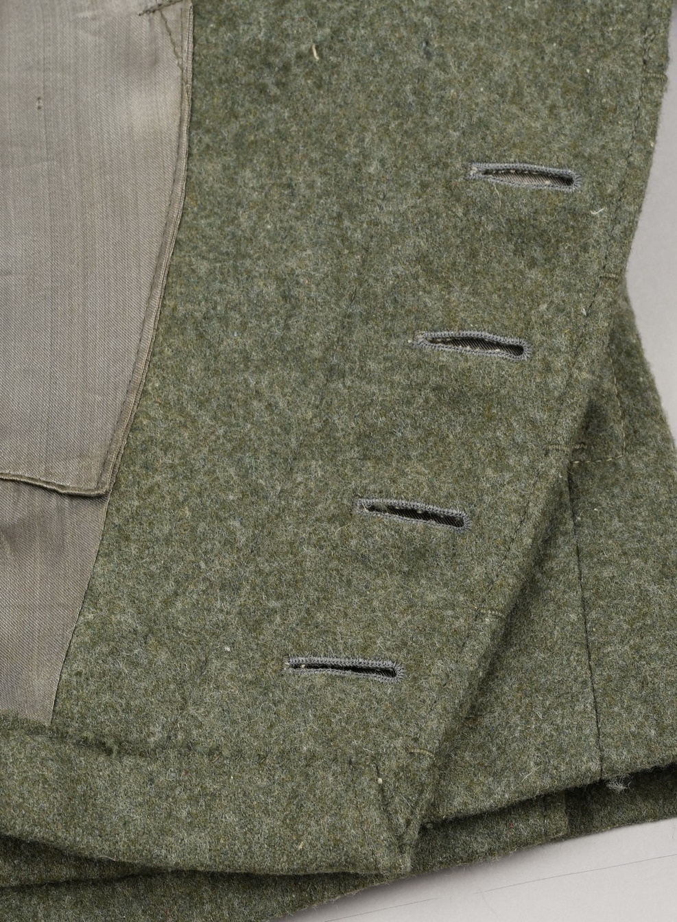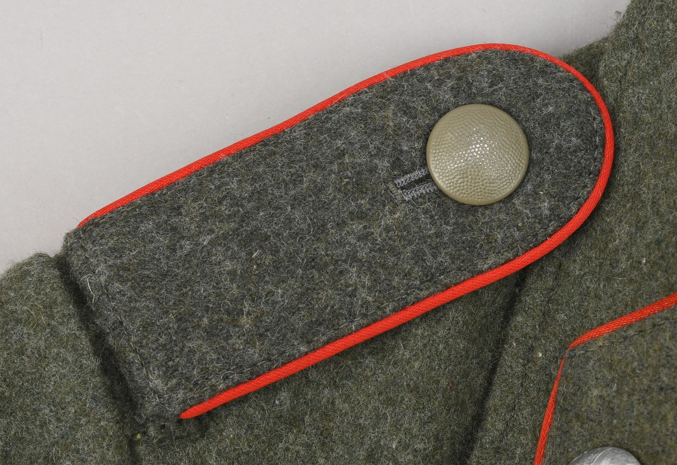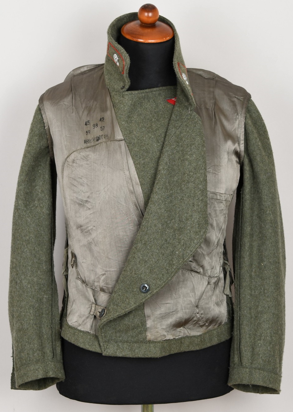 Field-grey wool construction, double breasted tunic with small fold back lapels and a large lay down collar. The left front closure panel of the tunic has four hidden button holes and an additional three, visible button holes on the fold back lapel. The right front closure panel has all four large and two of the three smaller corresponding buttons intact. The edge of the right front closure panel has an additional two, small, buttons underneath the overlapping left closure panel with corresponding, internal, fabric loops for a secure closure with a neat appearance. The tunic also has a single metal hook and eye positioned at the forward neckline for a secure closure. The right breast has an machine woven, national eagle in matte grey threads on a cut-out, woven field-grey rayon base. The eagle is factory hand and machine sewn in place. The reverse of the tunic has a central seam. EM slip on shoulder straps with red rayon piping slided and buttoned in place. The collar has the typical zig-zag reinforcement stitching to the reverse. The collar features collar tabs with red rayon piping and silver washed . The collar features the elongated, field-grey wool collar tabs with the typical, silver washed, Danziger style Totenkopf cyphers pinned in place. The collar tabs are machine sewn to the collar. To the upper left sleeve is a obergefreiters rank chevron on bottle green cloth backing neatly hand sewn in place. East front ribbon is hand sewn to the upper button hole and there is award loops sewn for one award. The interior breast panels are lined in silver/grey rayon cloth. The lining has a patch pocket to the right breast panel and a slash patch pocket to the left breast panel. The interior of the tunic also has two, rayon straps with six stitched eyelets to each, situated at the waistline to secure the belt support hooks. The interior also has a tunnel looped, grey drill cloth fit adjustment drawstring to each of the waistline side panels. Clearly size and Rbnr marking to the inner left lining.