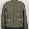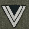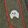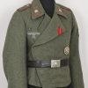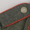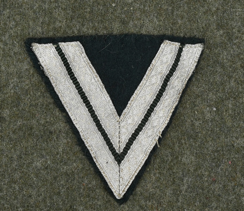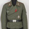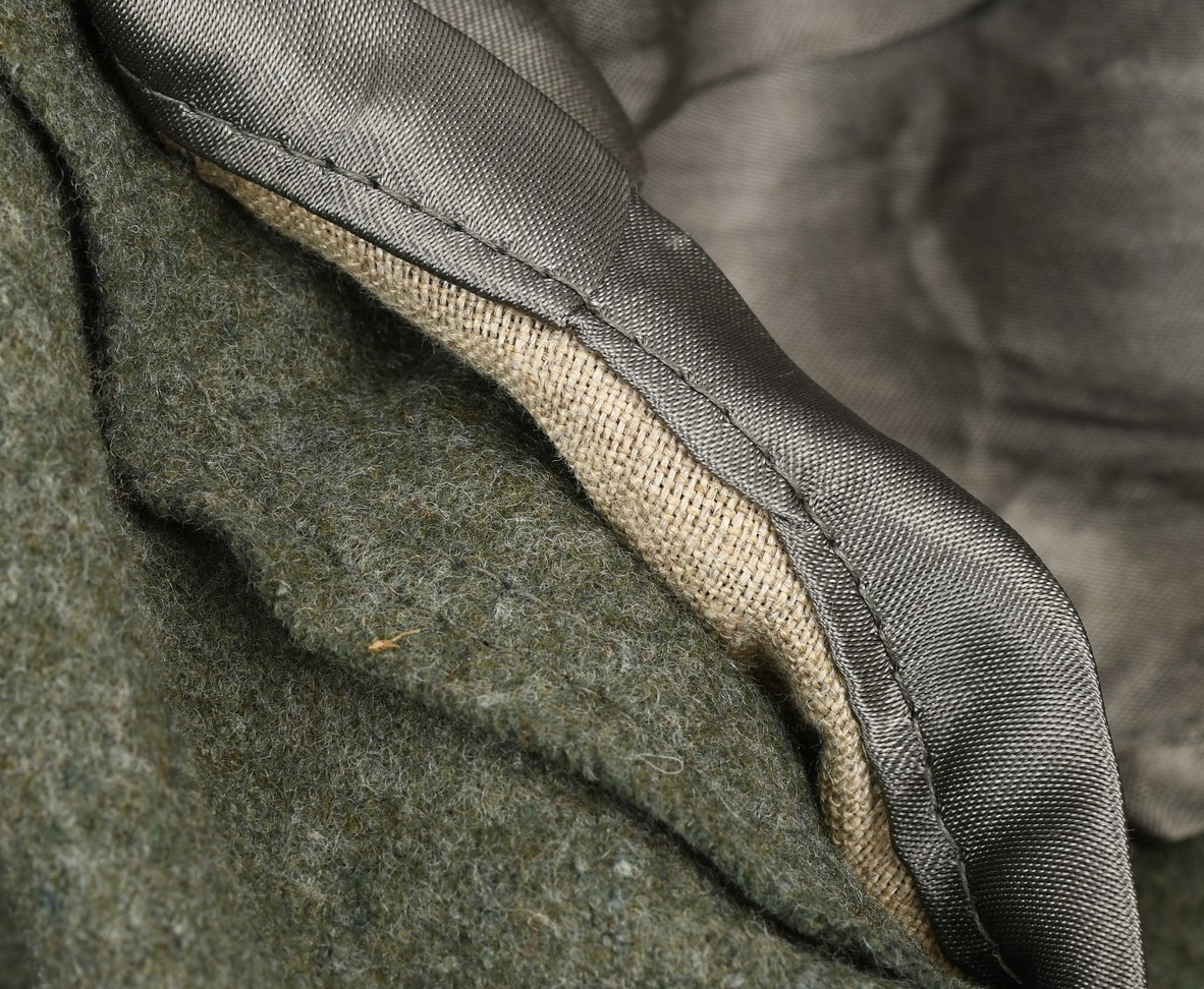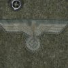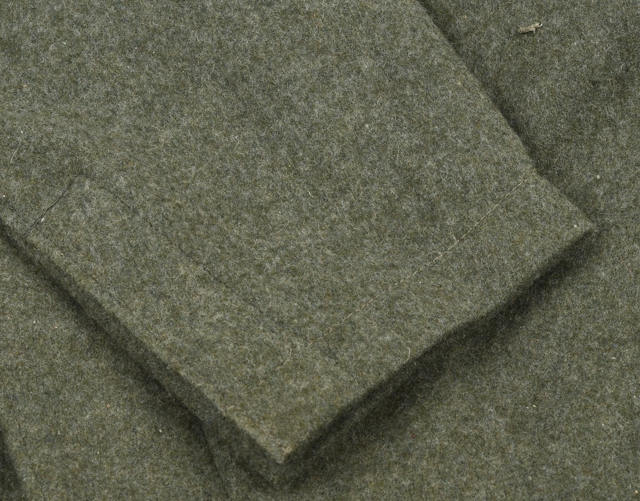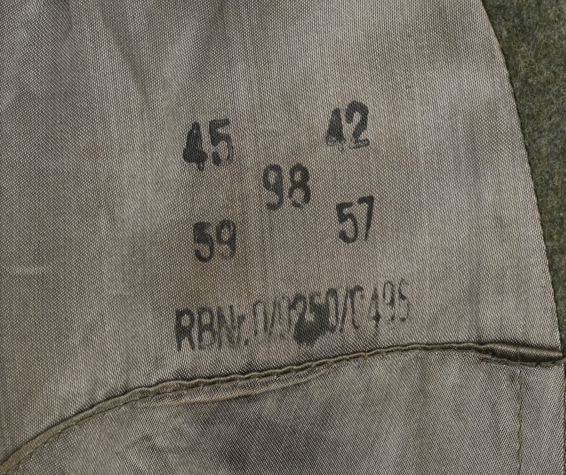 Field-grey wool construction, double breasted tunic with small fold back lapels and a large lay down collar. The left front closure panel of the tunic has four hidden button holes and an additional three, visible button holes on the fold back lapel. The right front closure panel has all four large and two of the three smaller corresponding buttons intact. The edge of the right front closure panel has an additional two, small, buttons underneath the overlapping left closure panel with corresponding, internal, fabric loops for a secure closure with a neat appearance. The tunic also has a single metal hook and eye positioned at the forward neckline for a secure closure. The right breast has an machine woven, national eagle in matte grey threads on a cut-out, woven field-grey rayon base. The eagle is factory hand and machine sewn in place. The reverse of the tunic has a central seam. EM slip on shoulder straps with red rayon piping slided and buttoned in place. The collar has the typical zig-zag reinforcement stitching to the reverse. The collar features collar tabs with red rayon piping and silver washed . The collar features the elongated, field-grey wool collar tabs with the typical, silver washed, Danziger style Totenkopf cyphers pinned in place. The collar tabs are machine sewn to the collar. To the upper left sleeve is a obergefreiters rank chevron on bottle green cloth backing neatly hand sewn in place. East front ribbon is hand sewn to the upper button hole and there is award loops sewn for one award. The interior breast panels are lined in silver/grey rayon cloth. The lining has a patch pocket to the right breast panel and a slash patch pocket to the left breast panel. The interior of the tunic also has two, rayon straps with six stitched eyelets to each, situated at the waistline to secure the belt support hooks. The interior also has a tunnel looped, grey drill cloth fit adjustment drawstring to each of the waistline side panels. Clearly size and Rbnr marking to the inner left lining.