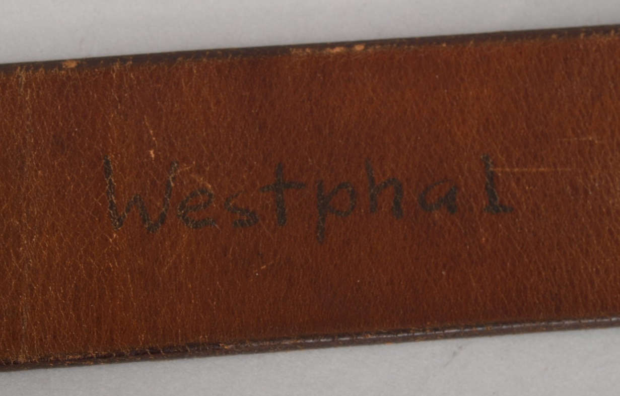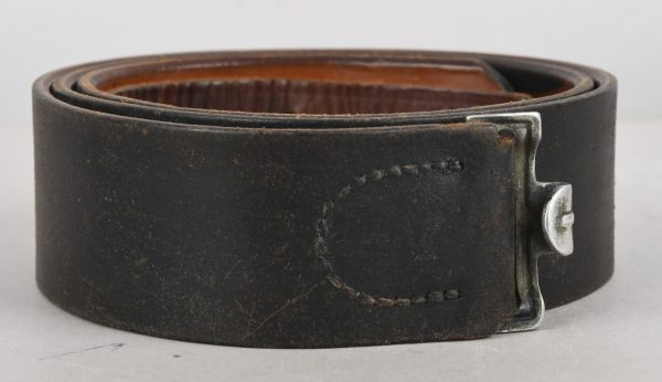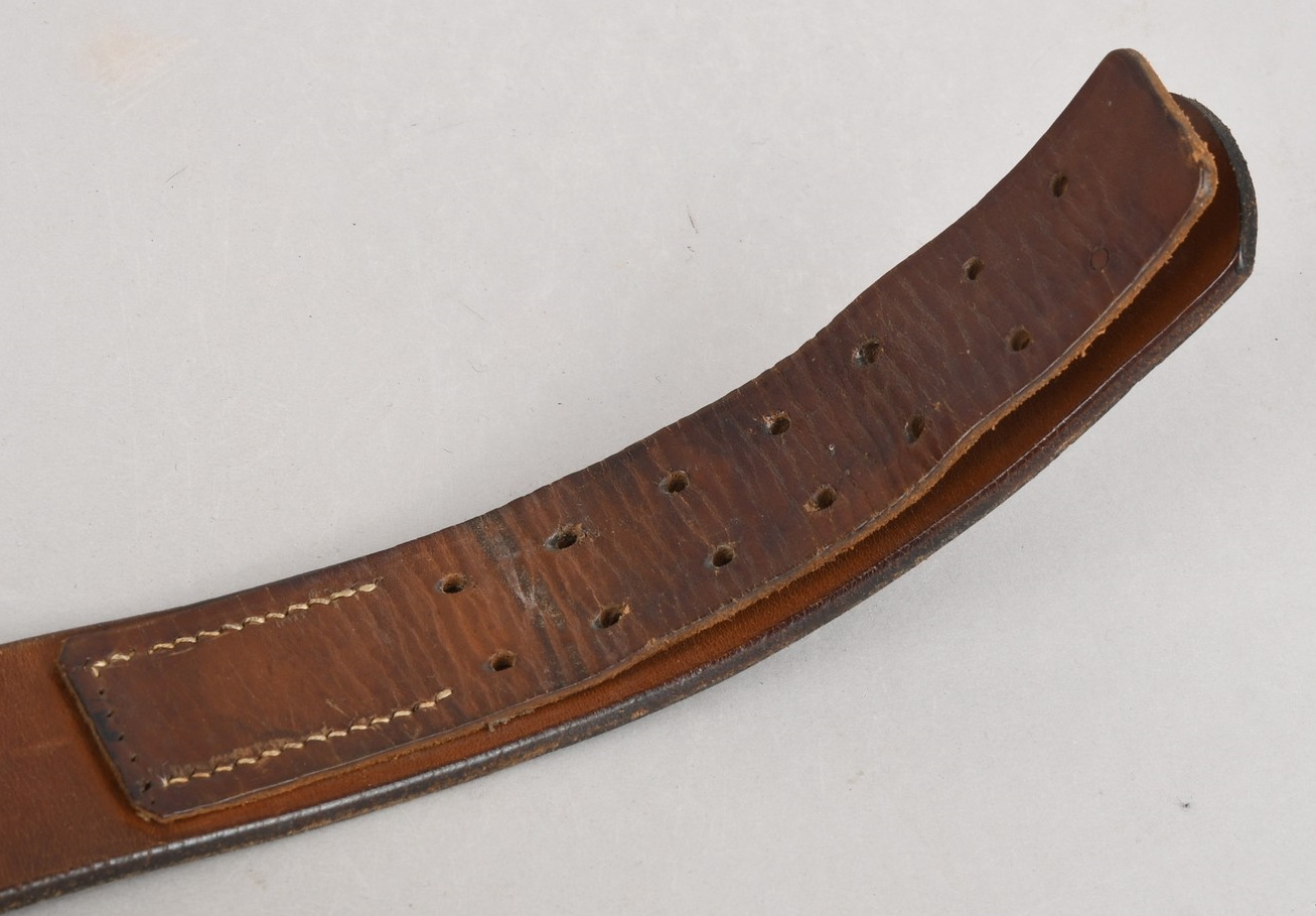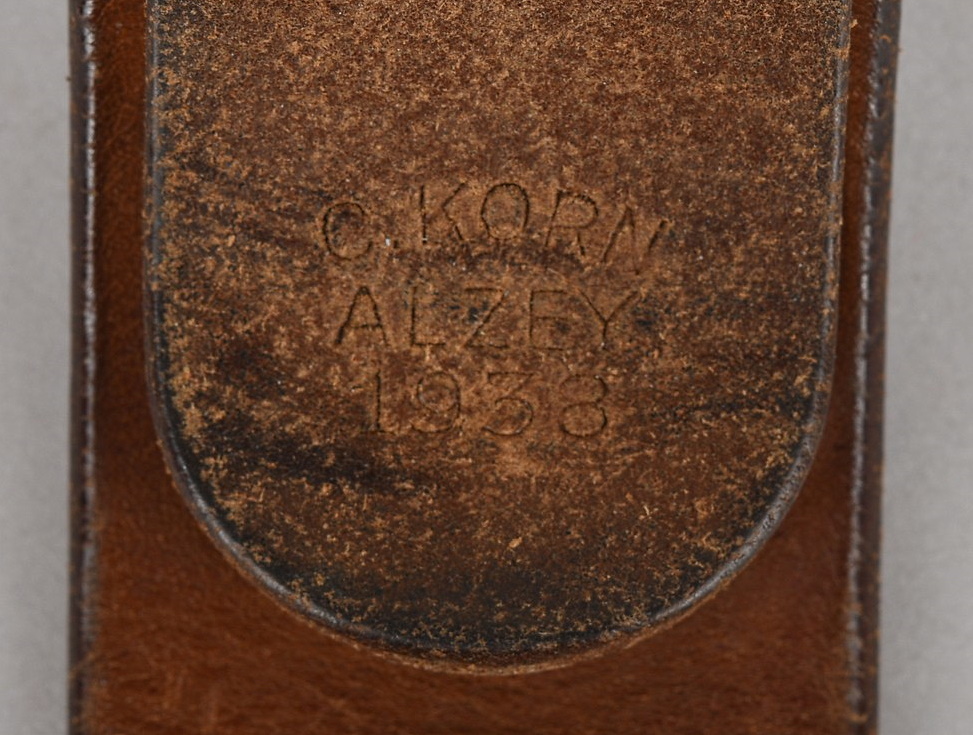 Constructed of blackened leather with ferrous metal buckle catch and retaining tounge intact. The belt is maker marked “C. Korn Alzey 1938”. Total length is 102cm. The belt is in good condition with light signs of age and use.