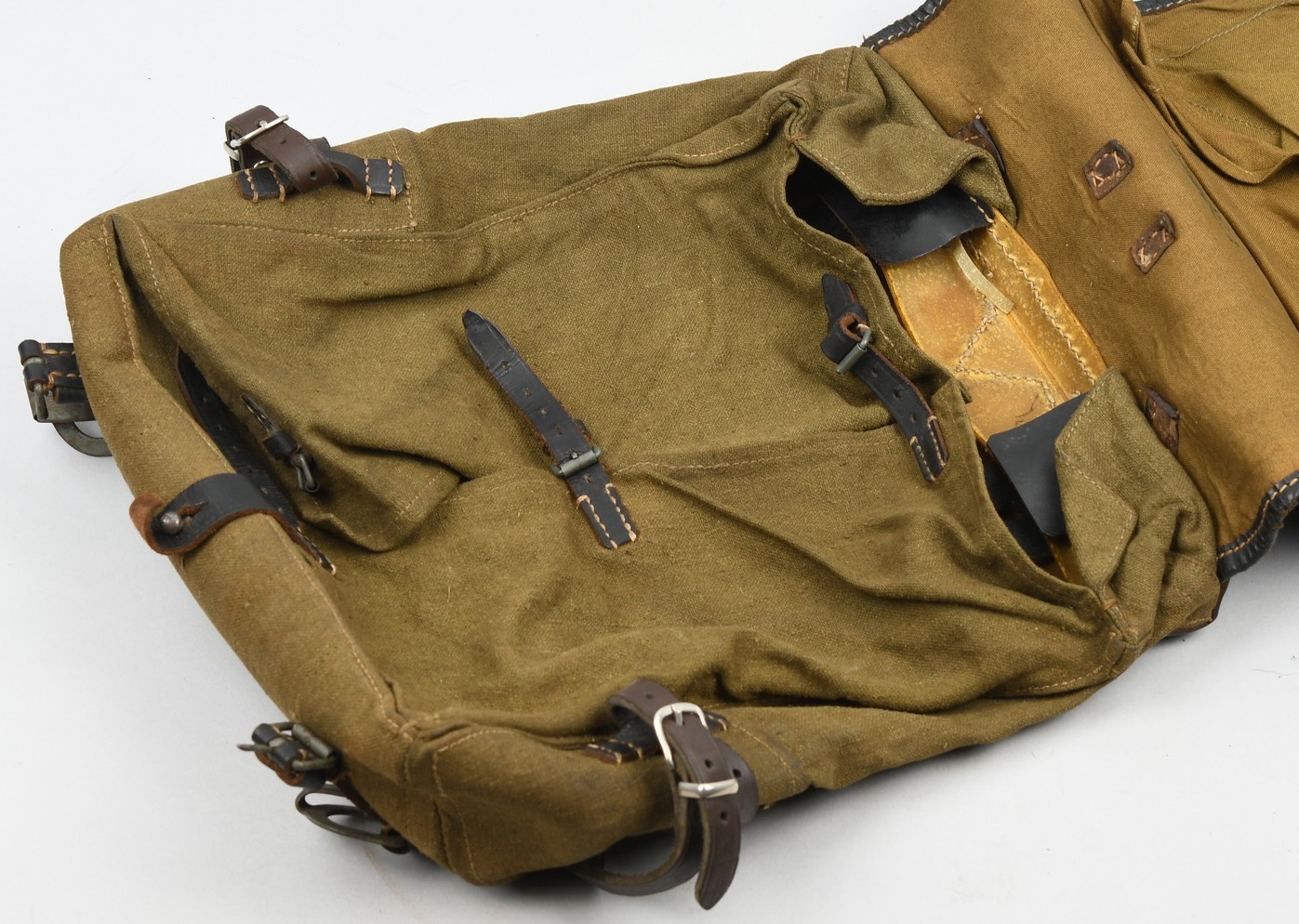 This example is an olive drab canvas pack with leather and cowhide fittings, roughly 30cm wide, 40cm tall and 10cm deep, with a fold-over flap that covers its entire front. Full fur coverage to the main flap. All of the straps, buckles and buttons are complete. Maker marked and dated for 1942 to the leather. The backpack is complete and is in good still used condition, no holes, rips, tears or mendings.
