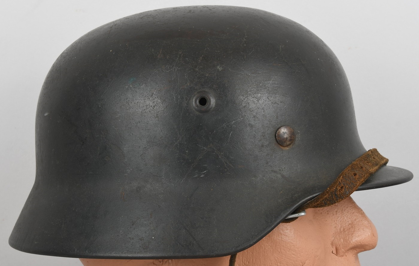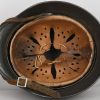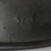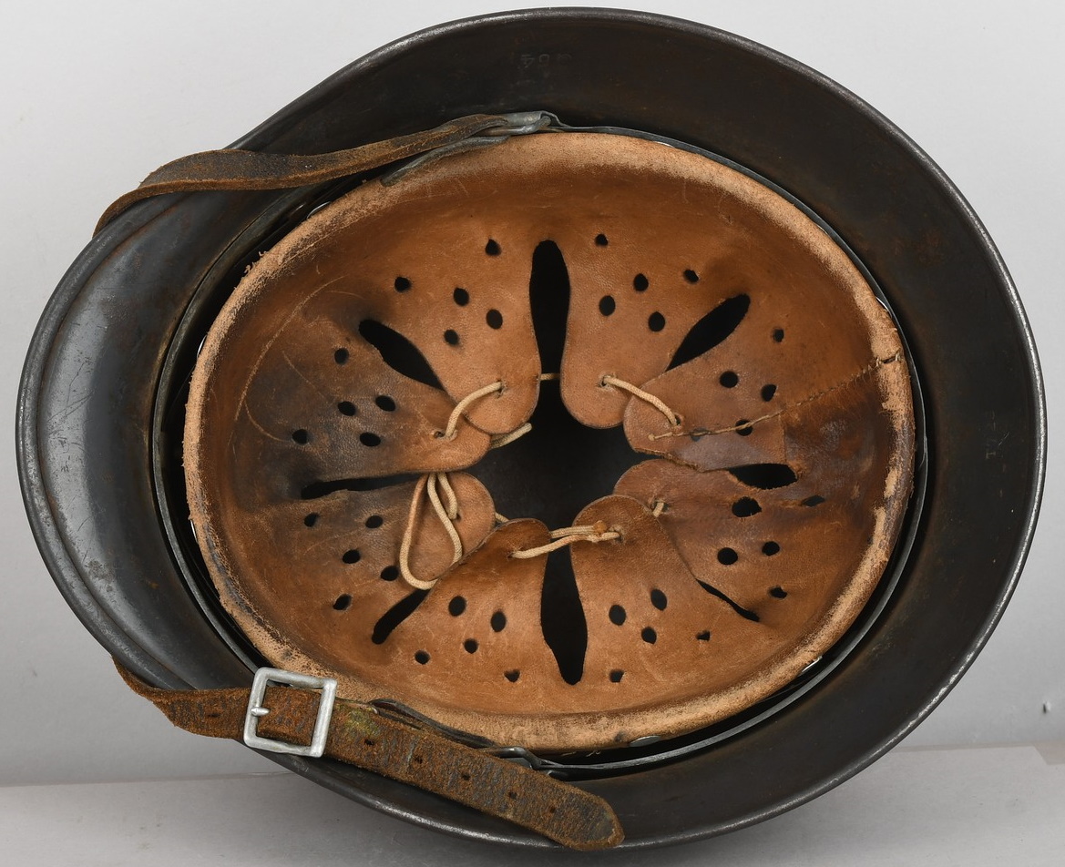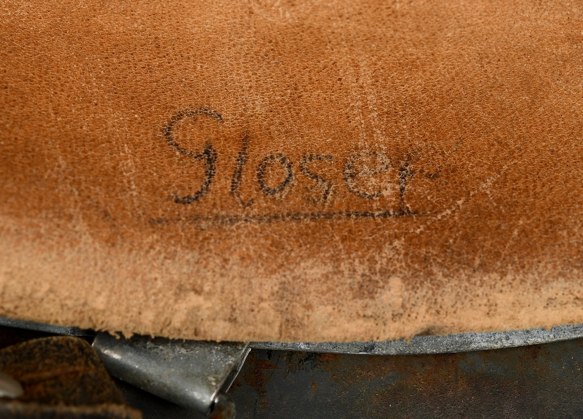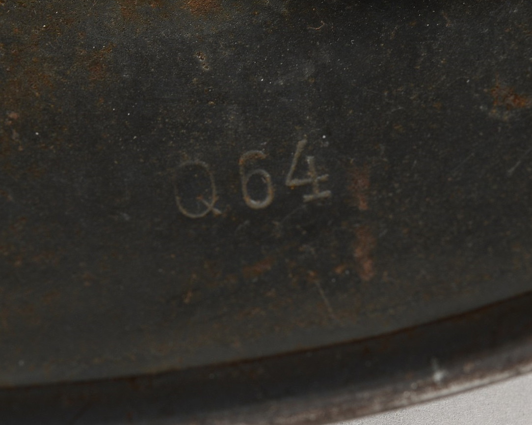 The stamped sheet steel construction helmet retains 95%+ of its dark, field-grey paint. All three liner retaining rivets are intact. The interior of the helmet is complete with all leather liner fingers intact. Original size adjustment string is present. The former owner’s name “Gloser” is hand written to the lining. Left inside is marked “Q64”. 64 is the helmet size and Q stands for company Quist located in Esslingen. The reverse interior neck guard apron is serial number marked “T729”. Original chinstrap is also present. The helmet is in good, still used condition with most of the original dark grey finish still intact. Liner shows a nice dust and light rust build up that we like to see. Leather parts is overall good with some dry parts.