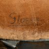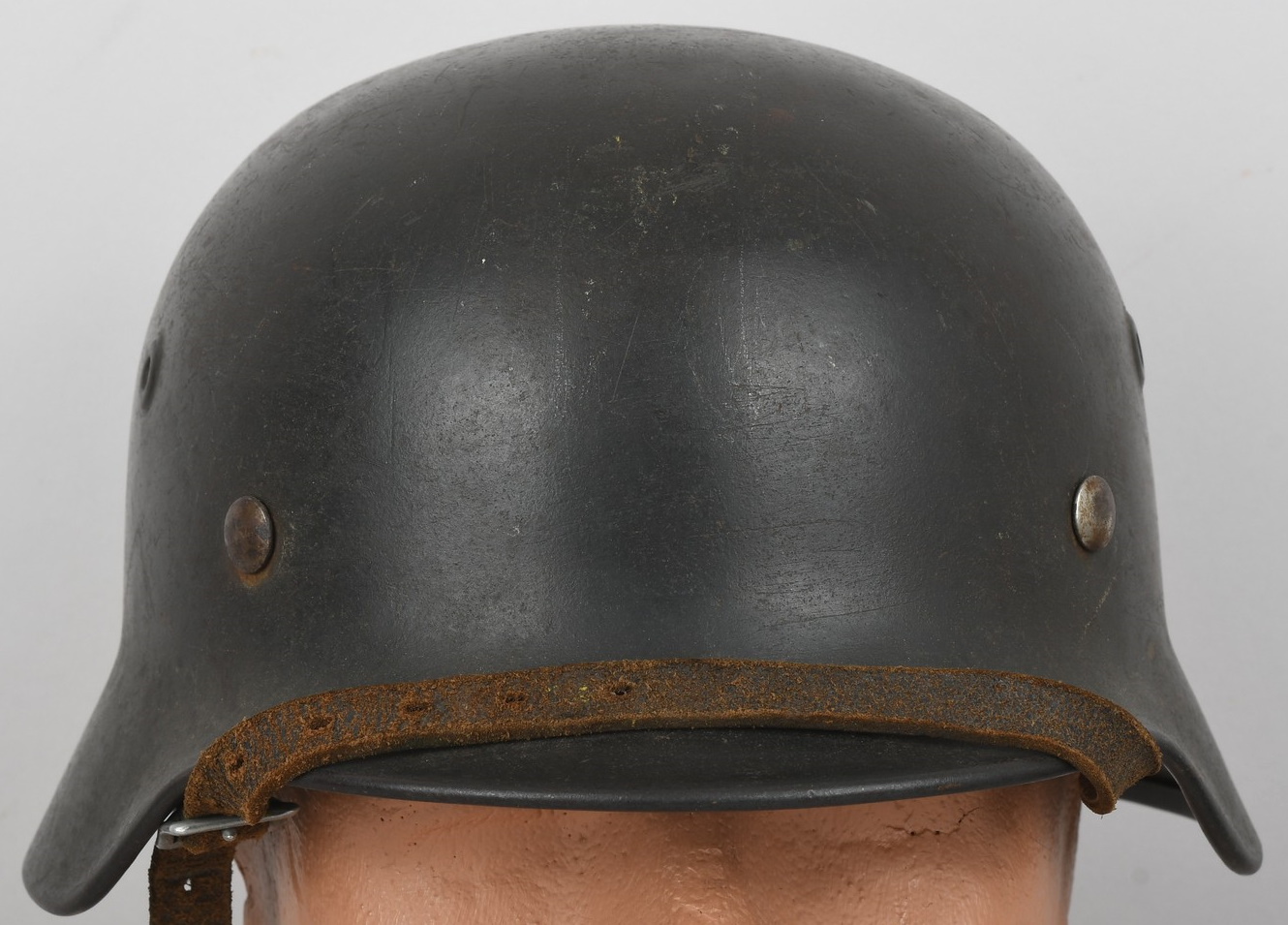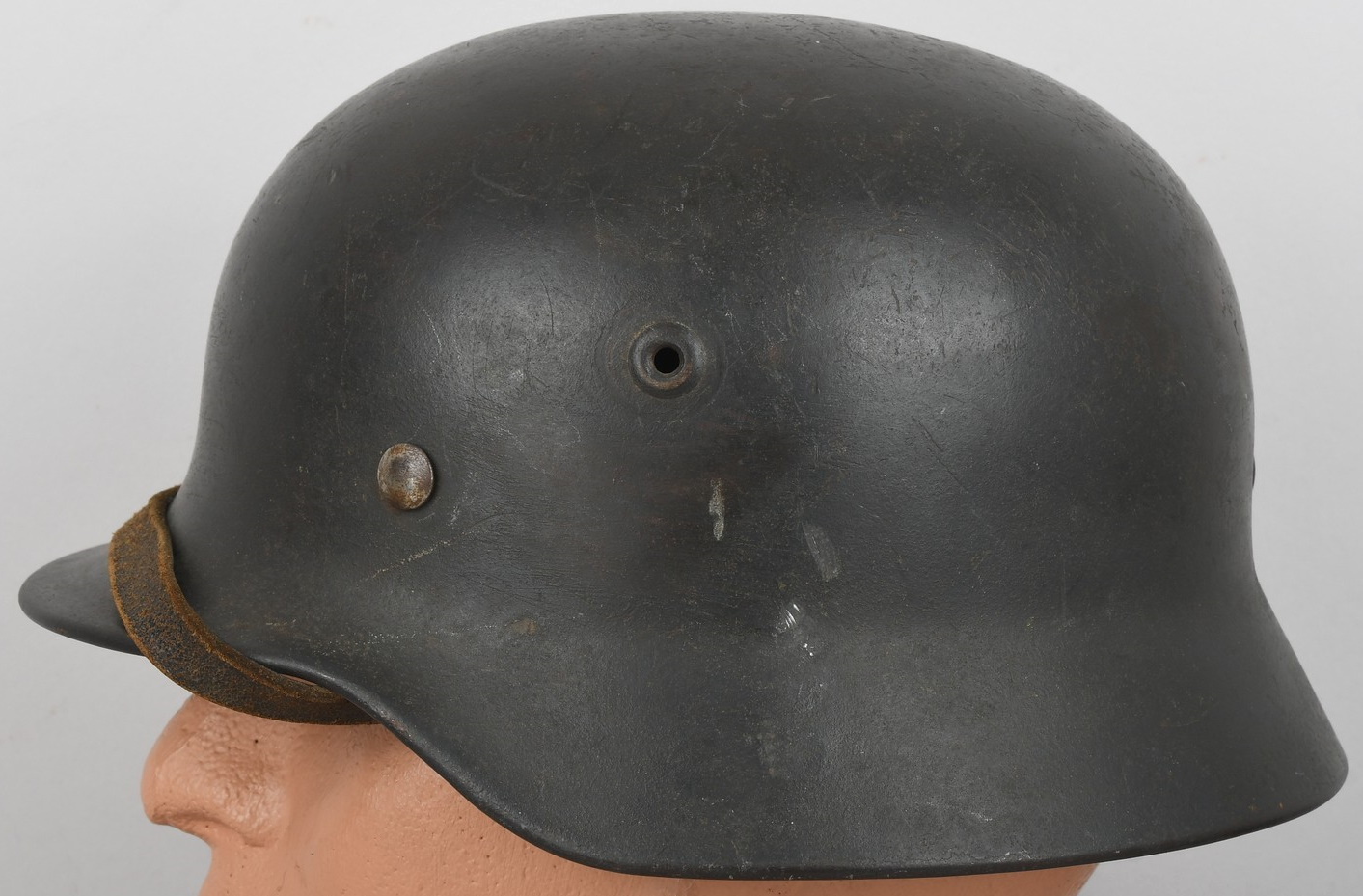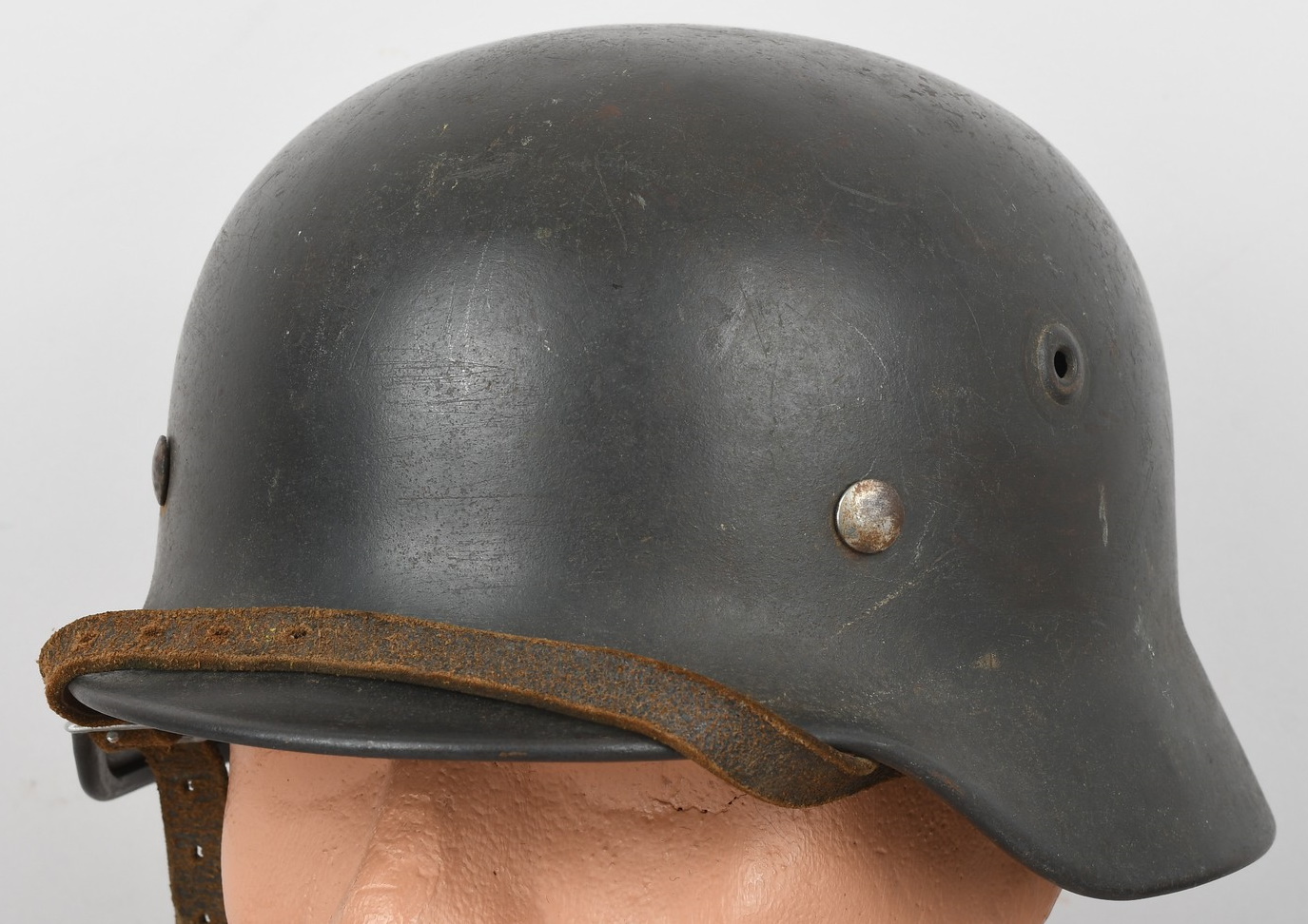 The stamped sheet steel construction helmet retains 95%+ of its dark, field-grey paint. All three liner retaining rivets are intact. The interior of the helmet is complete with all leather liner fingers intact. Original size adjustment string is present. The former owner’s name “Gloser” is hand written to the lining. Left inside is marked “Q64”. 64 is the helmet size and Q stands for company Quist located in Esslingen. The reverse interior neck guard apron is serial number marked “T729”. Original chinstrap is also present. The helmet is in good, still used condition with most of the original dark grey finish still intact. Liner shows a nice dust and light rust build up that we like to see. Leather parts is overall good with some dry parts.