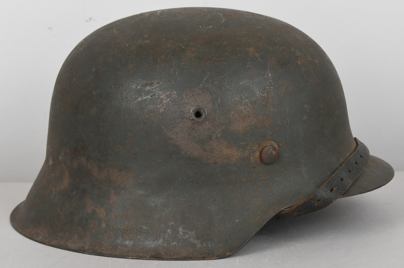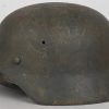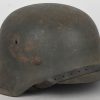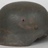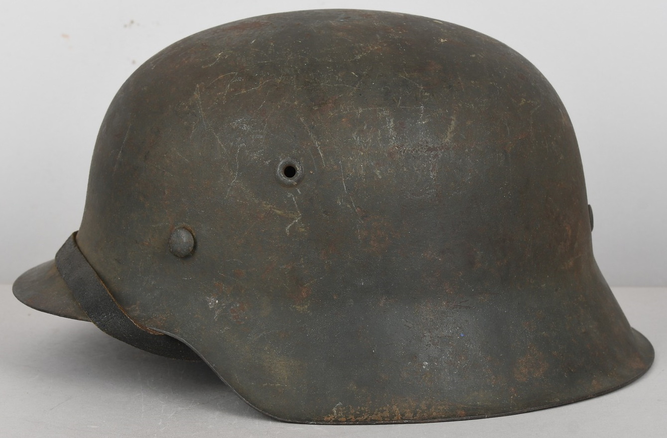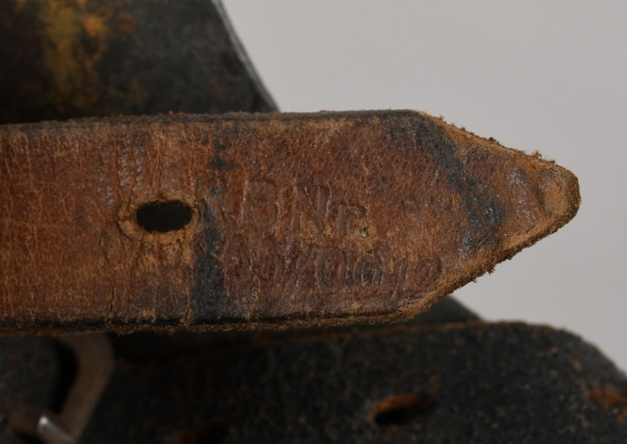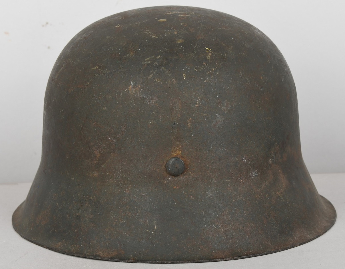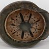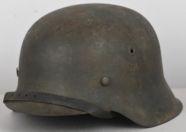 The stamped, sheet steel construction helmet with most of its field-grey paint still intact. All three liner retaining rivets are intact. The interior of the helmet has a tan leather liner with all eight fingers. The helmet is complete with chinstrap is RBNr marked. The helmet shows signs of real use and also some light surface rust from poor storage. The batch and size numbers is no longer visable because of age and wear. The name “Stein” is hand written to the liner. Doom stamp is also clearly visable.