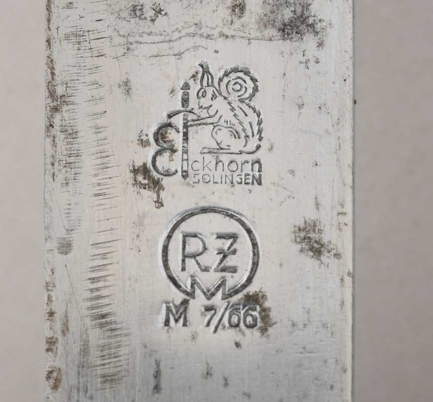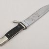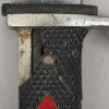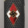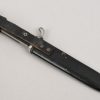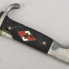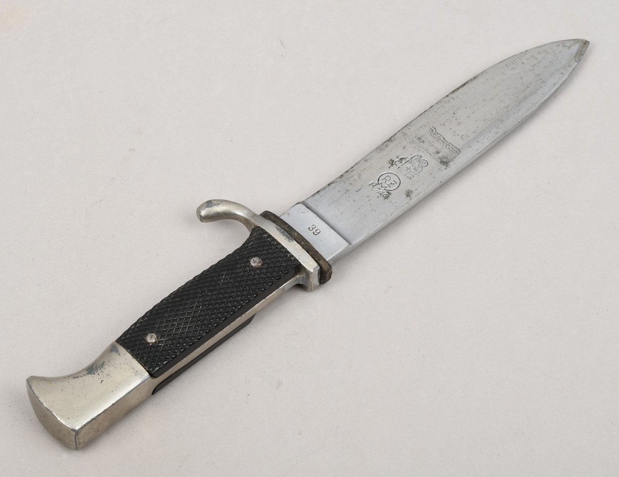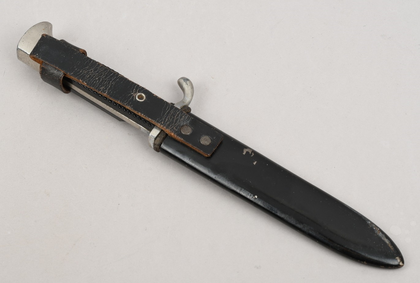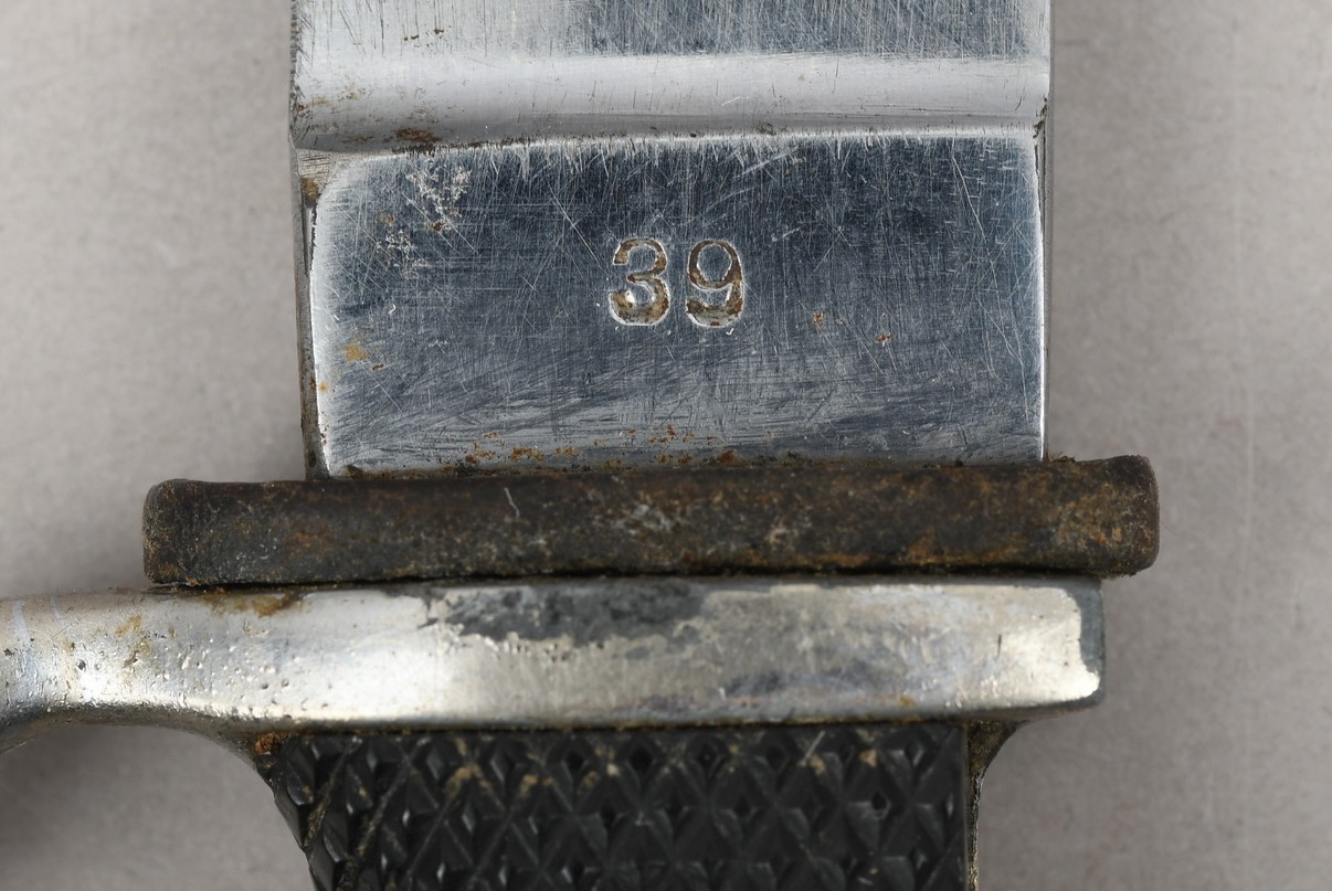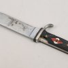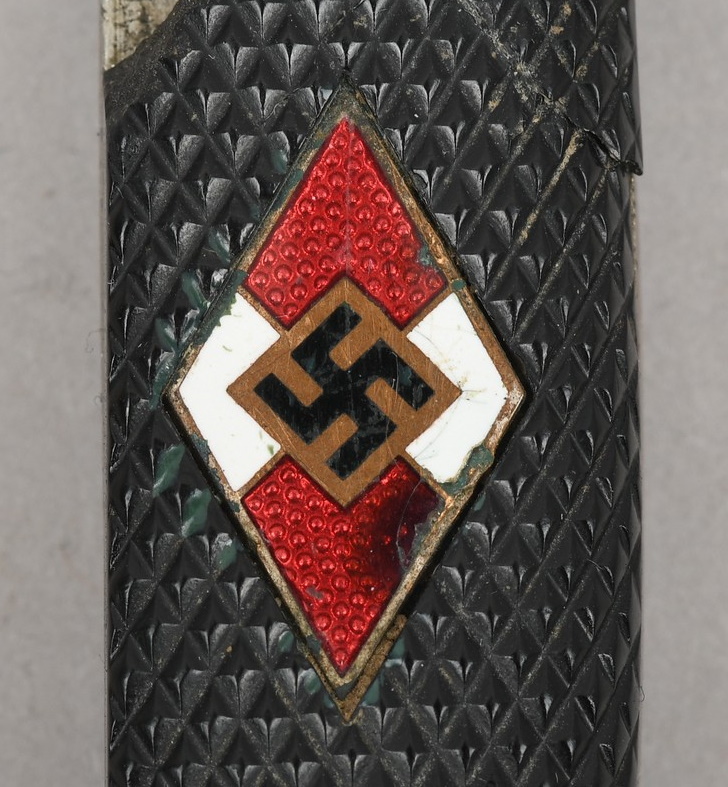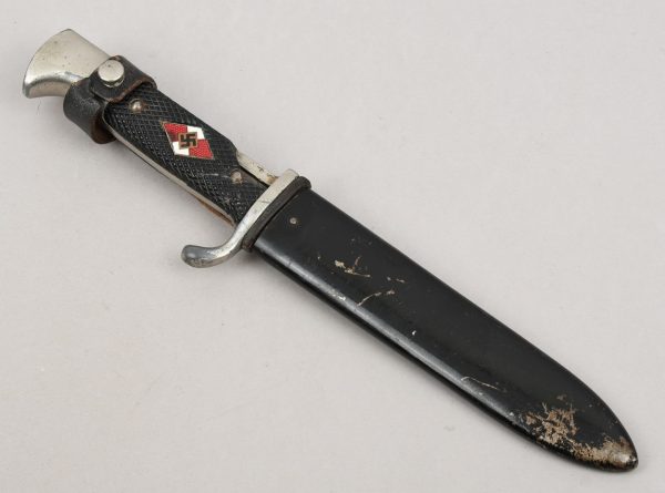 Complete Hitlerjugend knife with original scabbard. Blade shows signs of age and use. The reverse of the blade is marked “RZM M7/65 39” with Eickhorn Solingen name and logo. The original leather buffer is present on the blade. The handle has a part missing to the front side (see pictures). Hitlerjugend diamond emblem intact. The original black finish to the steel scabbard is intact to about 95% with signs of wear. The leather belt attachment is intact but missing a piece to the closure strap.