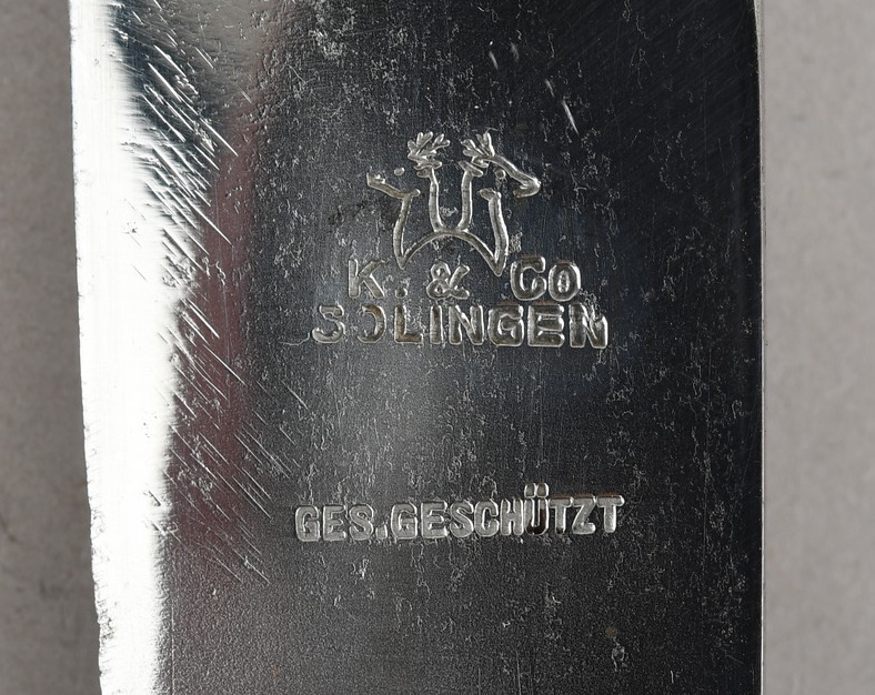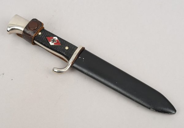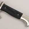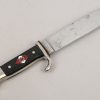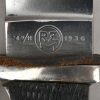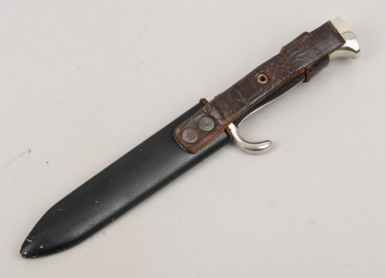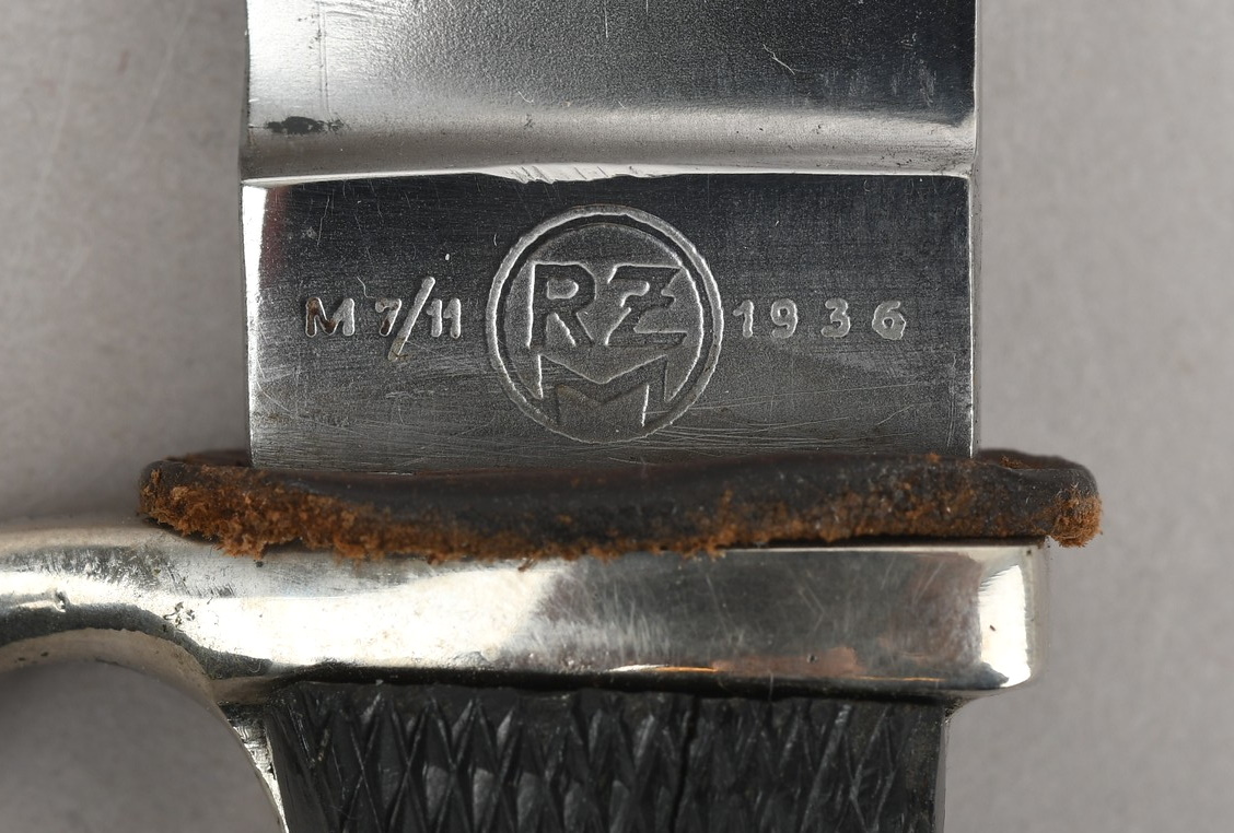 Complete early Hitlerjugend knife, produced 1936 with original scabbard. Blade is clean and has been sharpened. The motto “Blut Und Ehre!” is still clearly visable. The reverse of the blade is maker marked “K & CO Solingen” with logo type. The reverse blade is also marked “Ges.Geschützt (protected bt law)”. The ricasso is also marked “M7/11 RZM 1936”. All together, this is transitional knife, produced 1936. The original leather buffer is present on the blade. The handle on this one shows light signs of use with an intact HJ diamond emblem with no chips to the enamel. The grip plates are in very good condition, and the hilt retains all of the original plating. The black painted steel scabbard has approx 99% of the black paint intact. The leather belt attachment is intact and sound, with a functional retaining strap with intact push button.