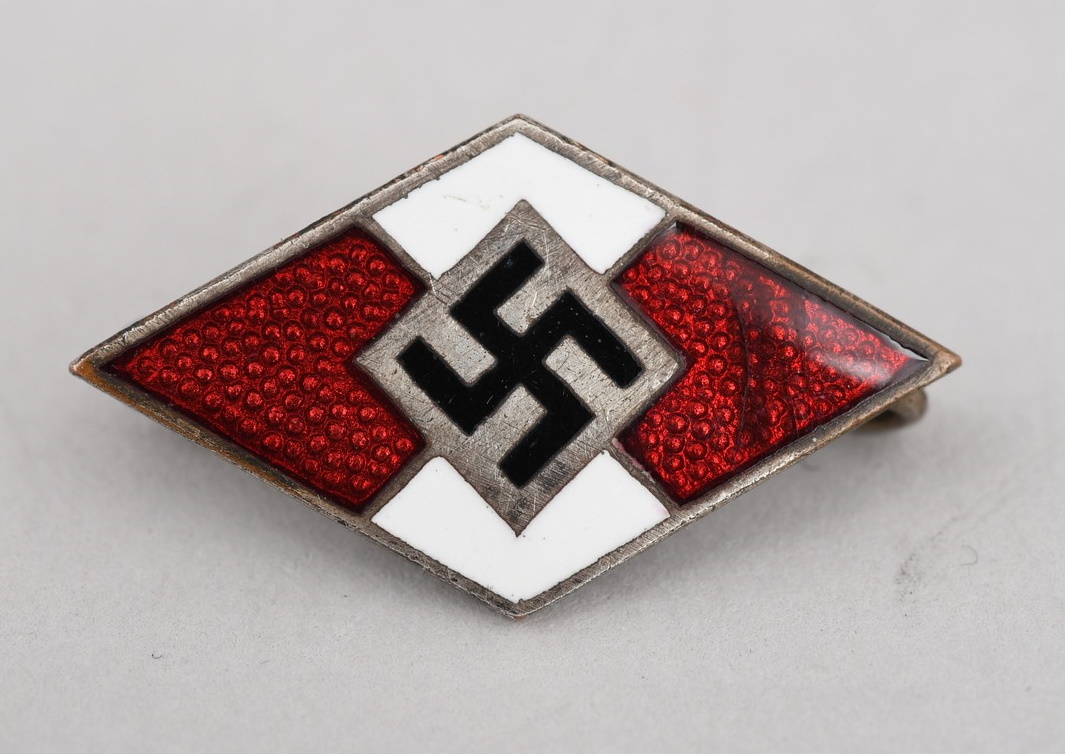Second pattern Hitlerjugend membership badge, as introduced 1933. Die struck, alloy metal with red, white and black enamel work. Reverse with intact pin back device. Reverse is also marked “Ges.gesch” (protected by law). The badge is in good conditon with signs of age.