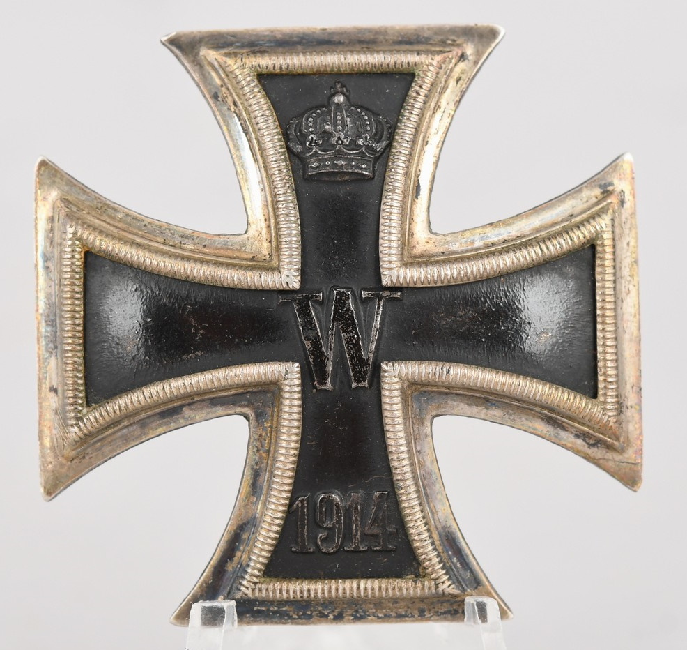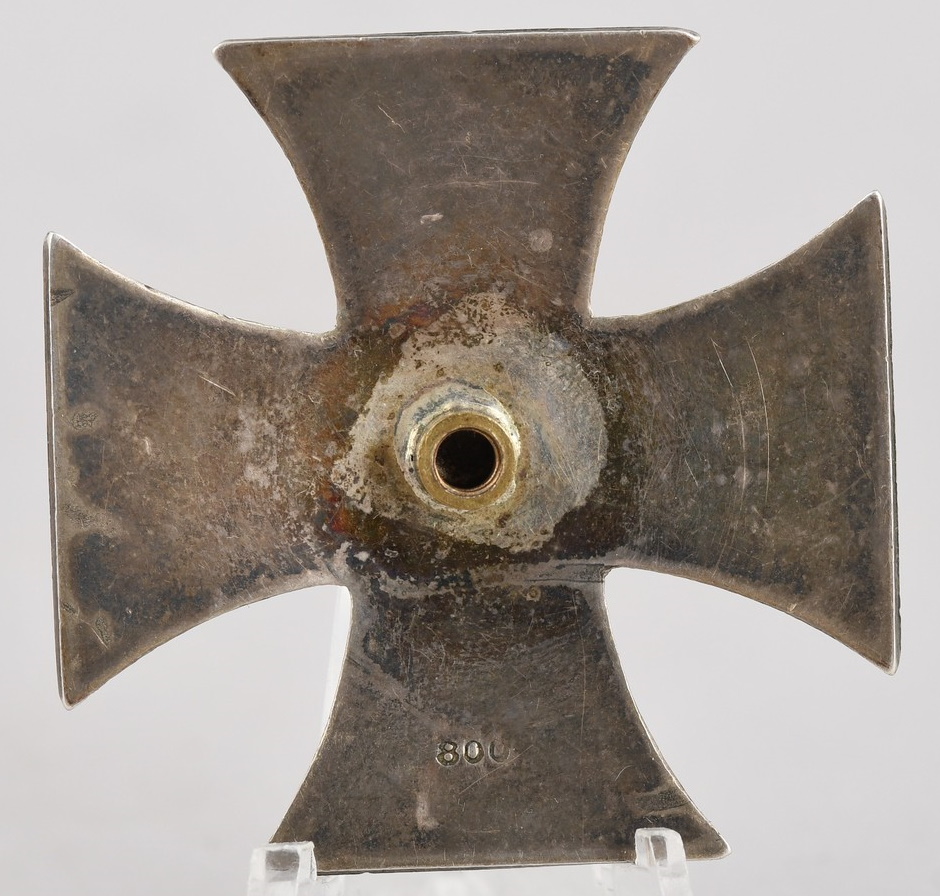 1914 pattern die struck, three piece, iron and silver construction cross with a single piece iron core and a two piece silver frame. Reverse complete with original screw back device. Reverse is marked “800” which is the frames silver content. The cross shows is in very good condition with 99% of the original black paint still intact to the core. The cross also shows a very nice age patina.