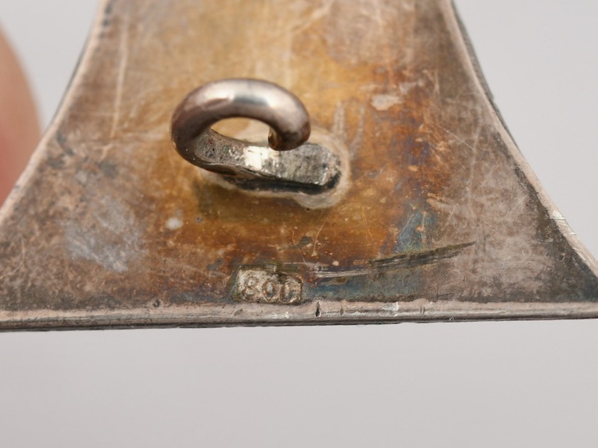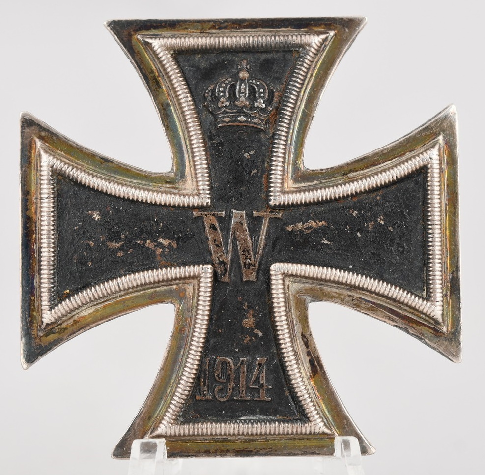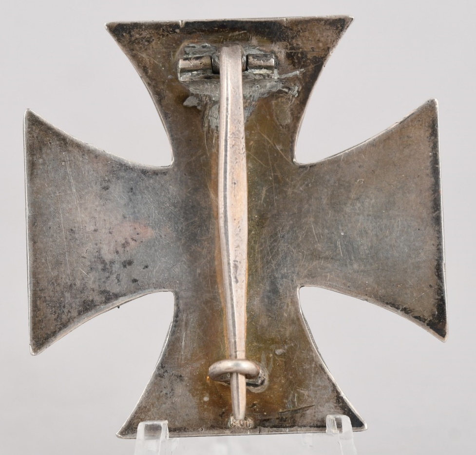 This is the 1914 pattern, die struck, three piece, Iron and alloy construction cross with a single piece iron core and a two piece silver frame’s. The cross is complete with original hinge, pin and catch assembly. The cross is marked 800, which is the silver content in the frames ((800/1000)). The cross is in good condition with aprox 95% of the black paint still intact to the core. The cross shows a nice age patina.
