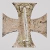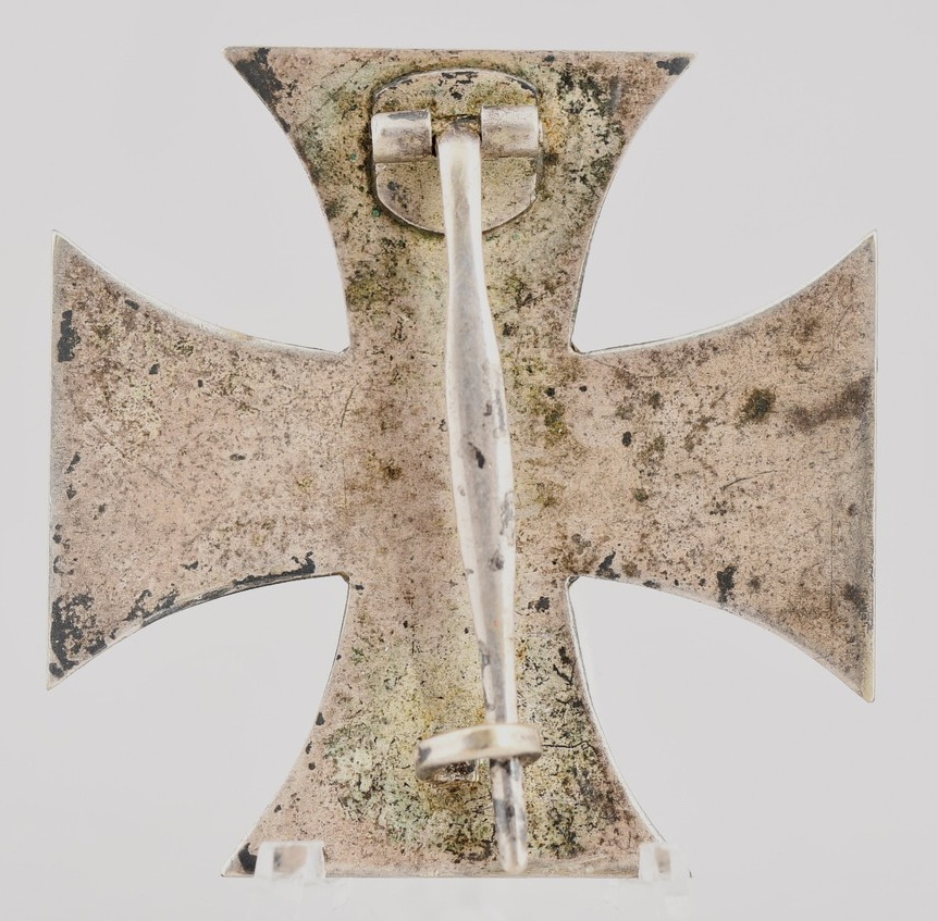 This is the 1914 pattern, die struck, three piece, Iron and alloy construction cross with a single piece iron core and a two piece silver washed alloy frame’s. The cross is complete with original hinge, pin and catch assembly. The cross is not marked but is a “Deumer” production. The cross is in good condition with about 98% of the black paint intact to the Iron Core. The cross shows a nice age patina.