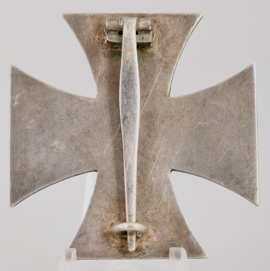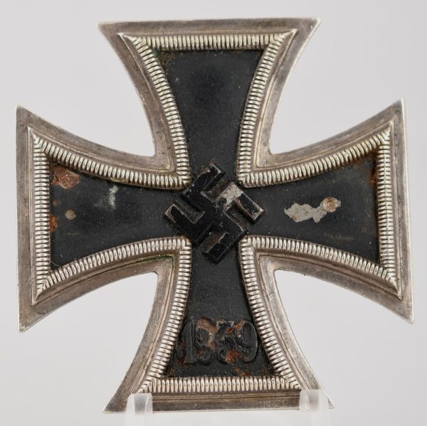 This is the 1939 pattern. Die struck, three piece, iron and alloy construction cross with a single piece iron core and two piece alloy frame. The plain reverse of the award has a soldered hinge, a tapered pin and catch all intact. The cross shows signs of age and use with some paint loss to the obverse and spots of surface rust, especially to the “1939” date.