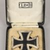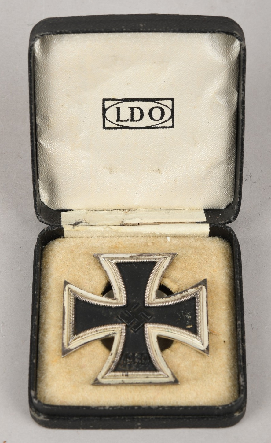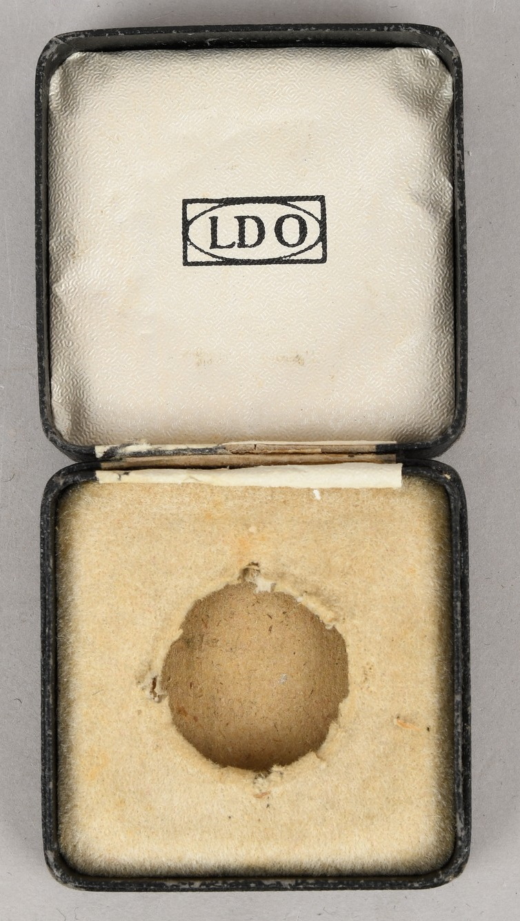 The cross comes housed in its original LDO case of issue, constructed of constructed of a light wooden frame with a faux black leather exterior. The interior with a white LDO embossed rayon lid liner, the hinge cover intact, with a recessed medal bed to accommodate the screw-back. The box is in good condition with light chafe wear.
