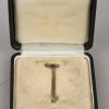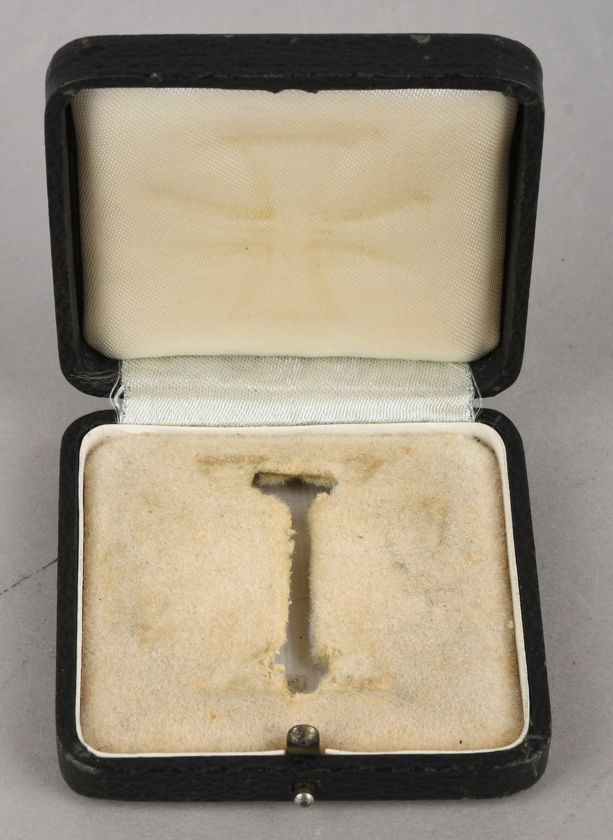 This is the 1939 pattern. Die struck, three piece, iron and alloy construction cross with a single piece iron core and two piece alloy frame. The plain reverse of the award has a soldered hinge, a tapered pin and catch all intact. The cross comes housed in a wood and pressed cardboard construction issue case with a simulated, black leather covering. The interior of the top lid of the case is lined in white satin. Underlying white padding with cut-out to hold the cross firmly in place.