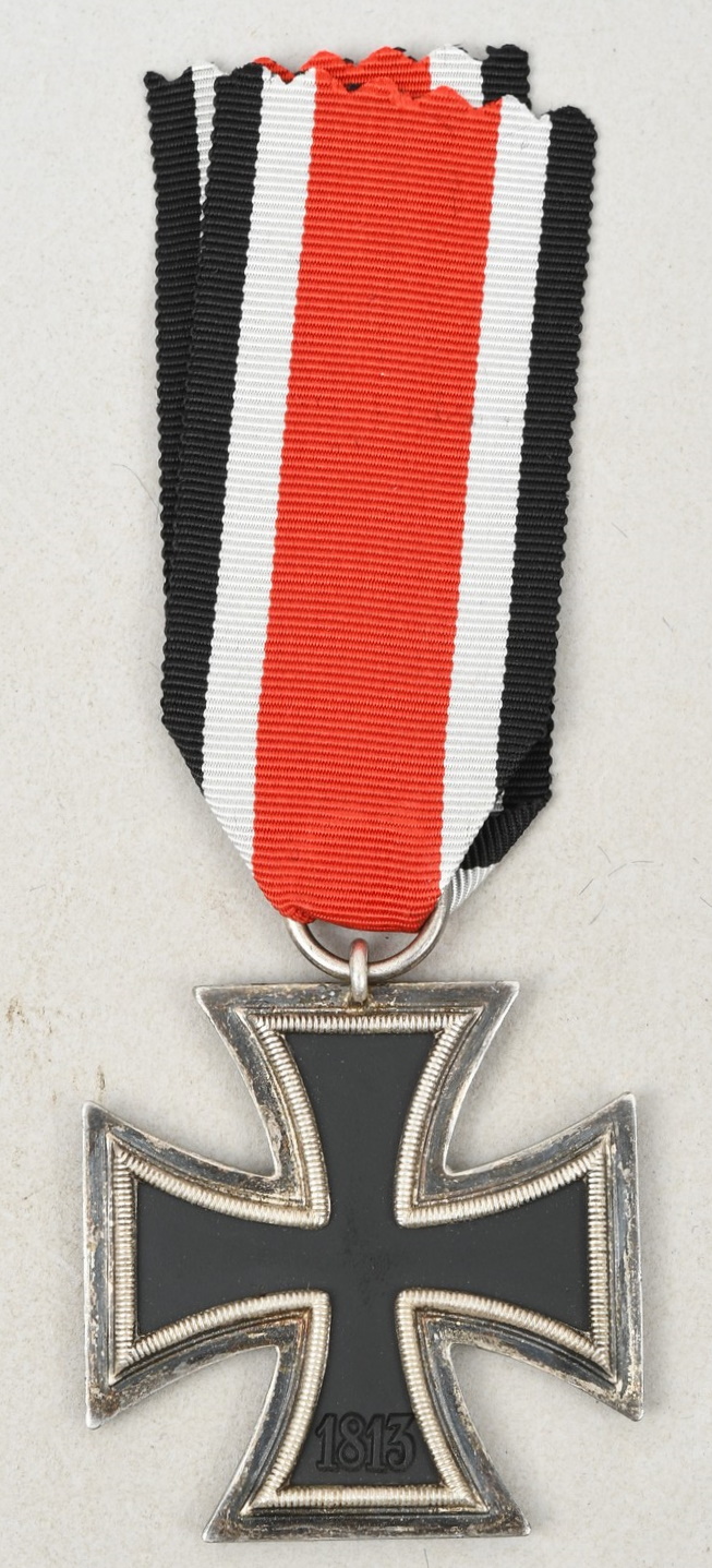 This is a Iron Cross Second Class 1939. Standard issue three piece construction cross with magnetic Iron core. The black Iron core has virtually all of the black paint still intact and shows a nice age patina to the silvered frame. The cross is complete with intact medal ring, suspension ring and long medal ribbon.