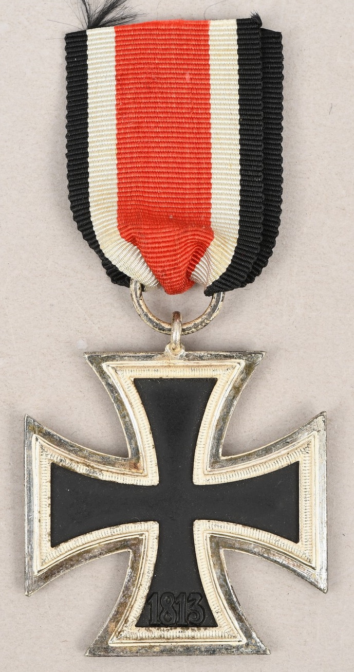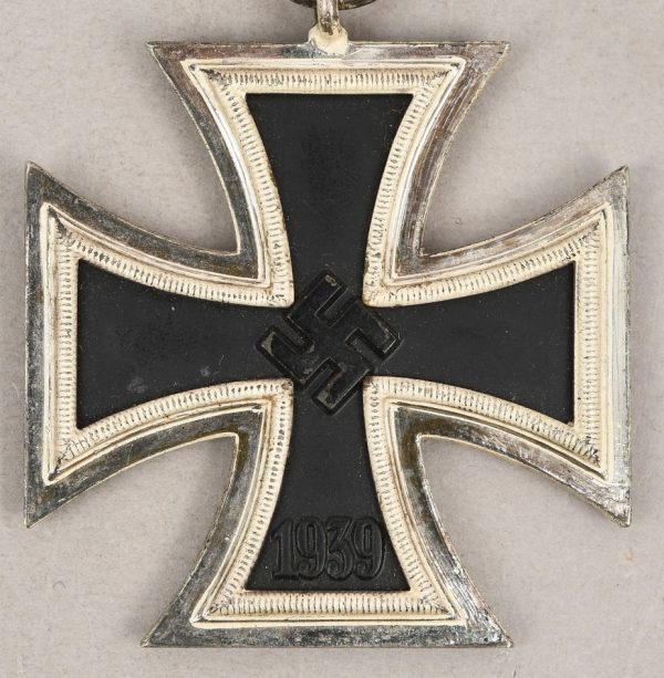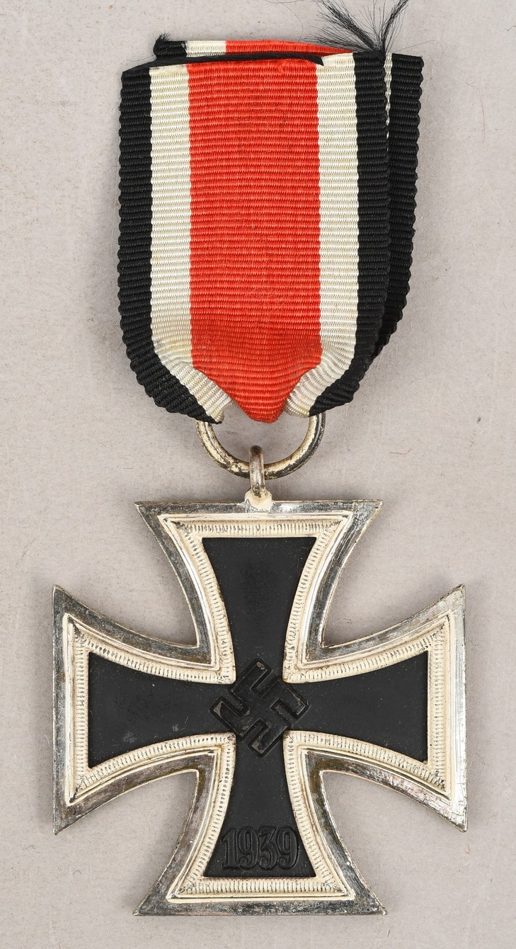 This is a Iron Cross Second Class 1939. Standard issue three piece construction cross with magnetic Iron core. The black Iron core still has about 99% of the black paint still intact and the frames also has the original silver frosting intact. The cross is complete with intact medal ring, suspension ring and long medal ribbon.