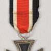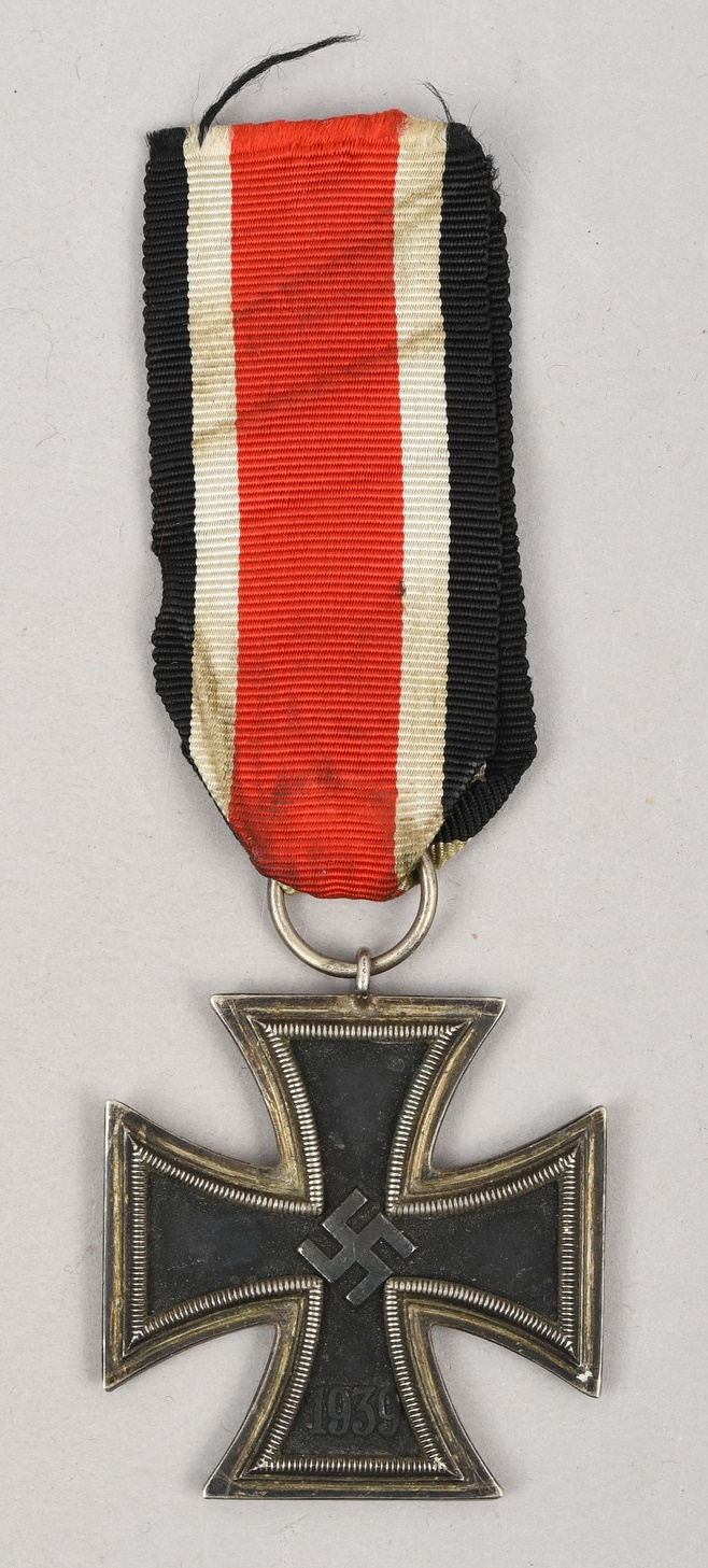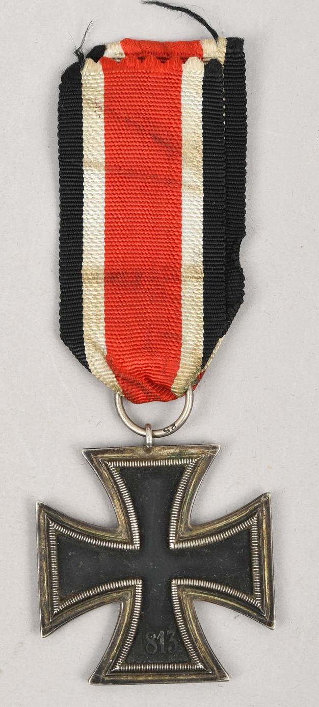This is a Iron Cross Second Class 1939. Standard issue three piece construction cross with magnetic Iron core. The black Iron core has most of the black paint intact although a bit age and use faded. The cross is complete with intact medal ring, suspension ring and long medal ribbon. The suspension ring is maker marked “25” for “Arbeitsgemeinschaft der Graveur-, Gold und Silberschmeide-Innungen, Hanau”. The cross is in good condition with a nice age patina.