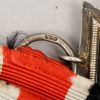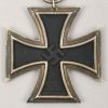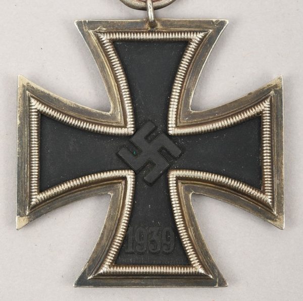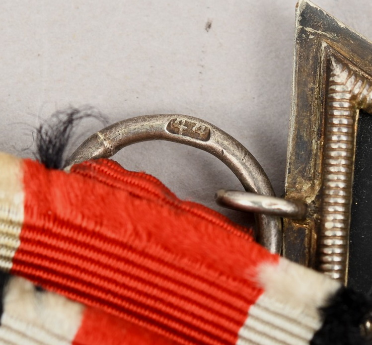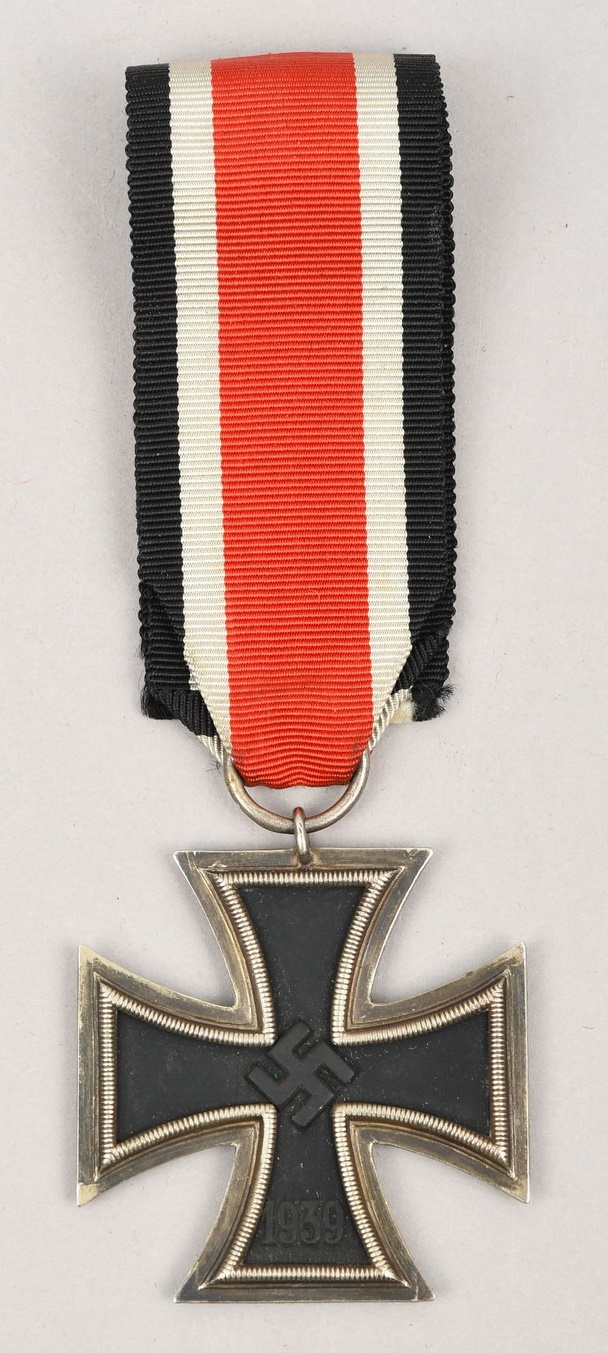 This is a Iron Cross Second Class 1939. Standard issue three piece construction cross with magnetic Iron core. The black Iron core has about 99% of the black paint intact. The cross is complete with intact medal ring, suspension ring and long medal ribbon. The suspension ring is maker marked “44” for “Jakob Bengel Idar-Oberstein”. The cross is in very good condition with a nice age patina.