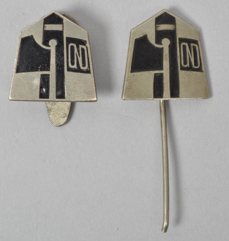 *A silver alloy , shield shaped lapel or button hole pin that has in black the axe with a stylized “OND” to the left. The makers mark is to the reverse. The metal shows darkening, but otherwise, is in nice condition.