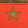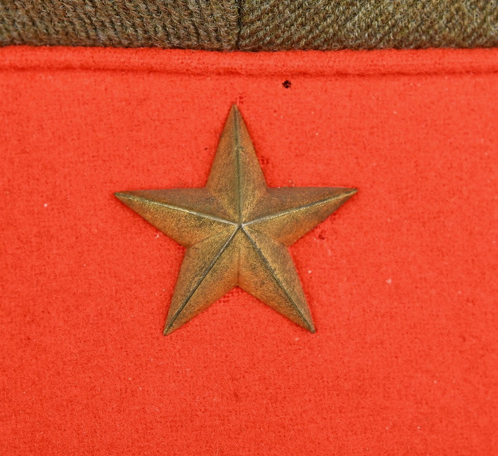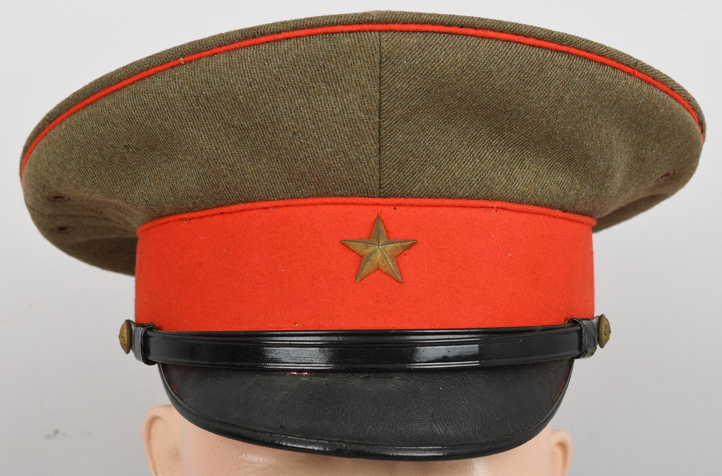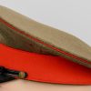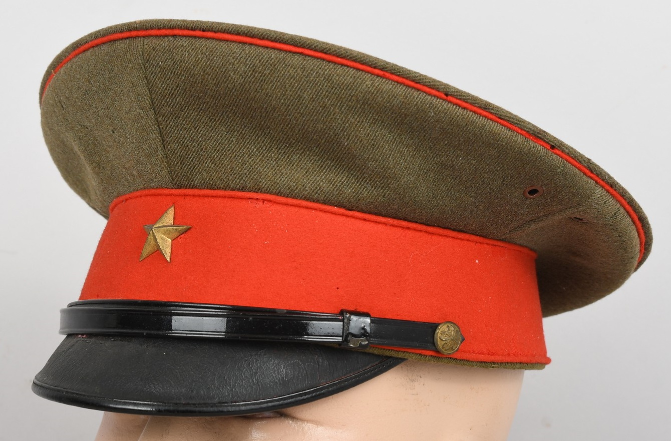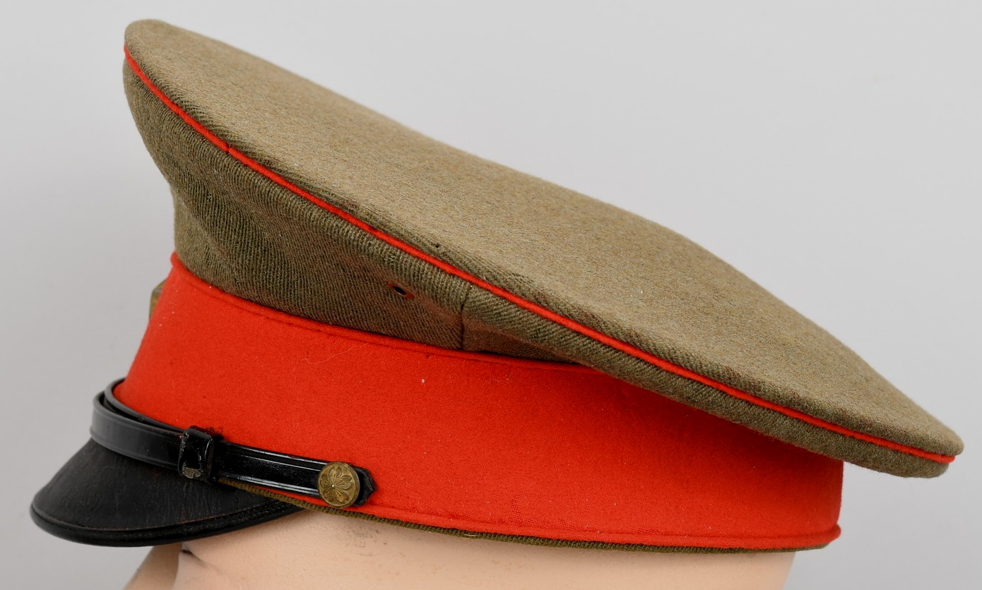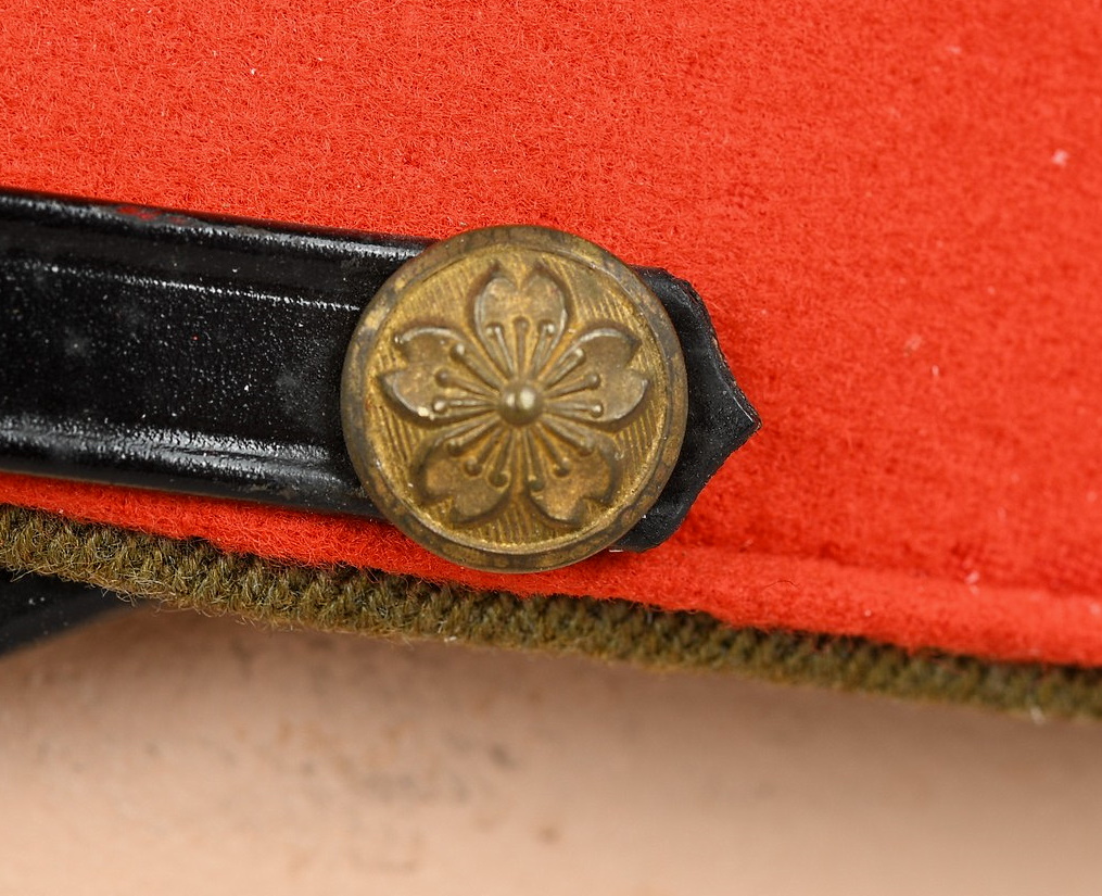 The cap is made of olive drab wool which matches army officer’s late war uniforms (Type 3), so the cap is considered a mid to late war example. Both the main wool body and the red wool band is clean and moth tracking is very light and hardly seen. The brass army star on the front is securely fixed and no crackilation can be seen on the lacquered chinstrap and visor. However, there are light signs of wear on the interior, especially on the ersatz leather sweat band and the olive green rayon lining. The cap is in good condition and is a high quality tailor-made one.