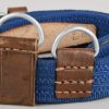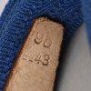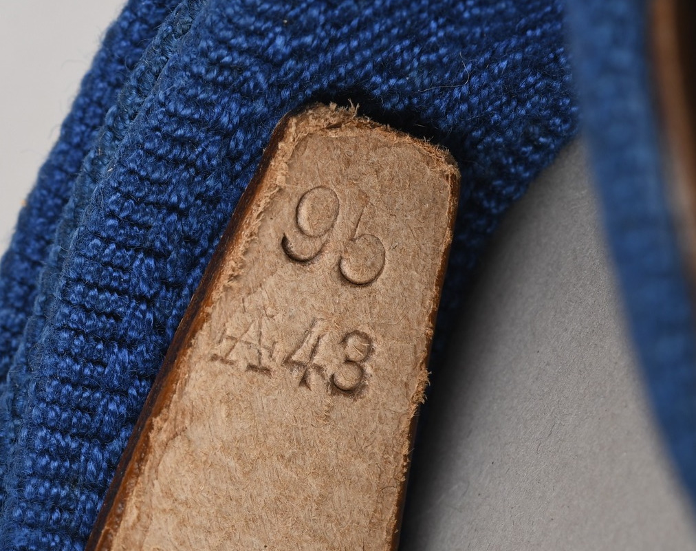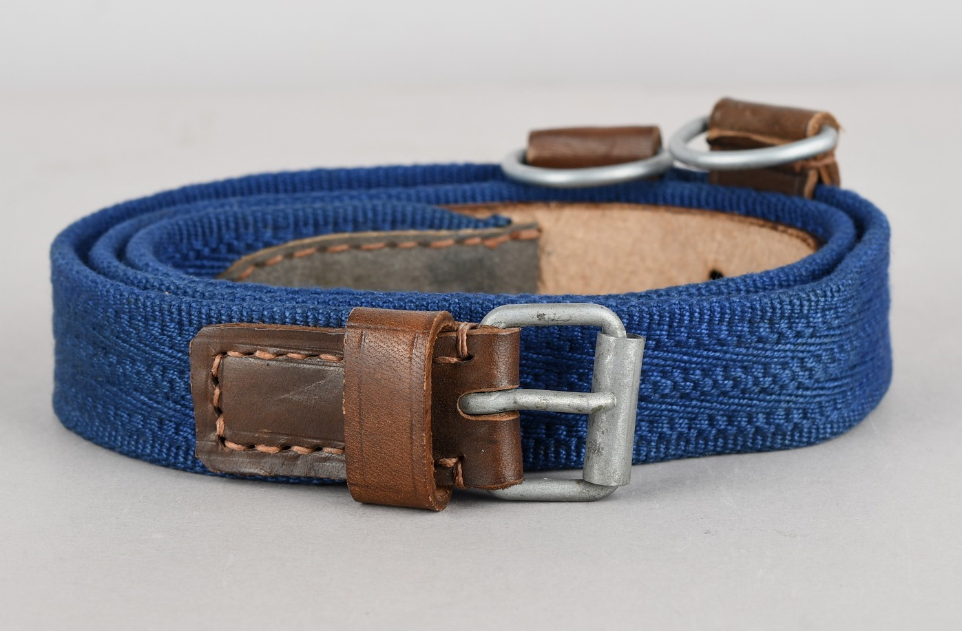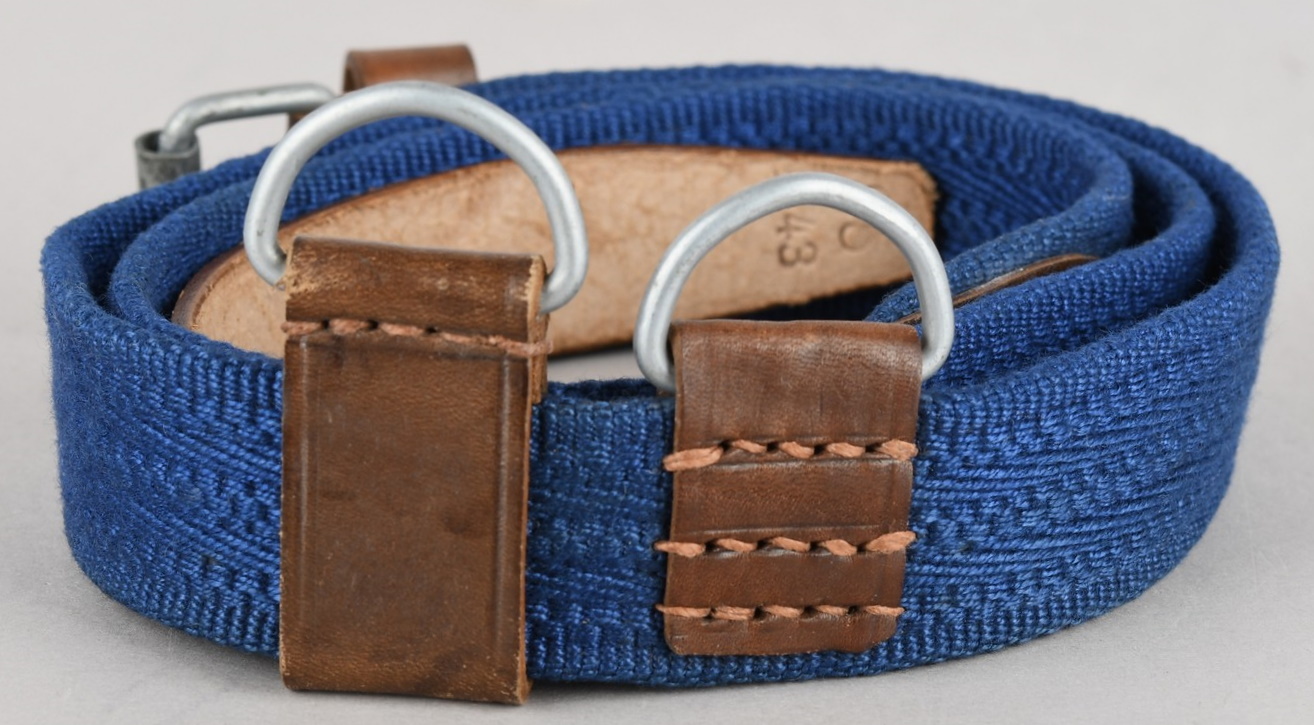 The belt is constructed of woven blue cotton with brown leather and sheet metal buckle. The belt is roughly 103cm long and 2.5cm wide. Both “D” rings are present. The buckle end of the belt has one fixed leather loop. It has logo “A” corresponding to the manufacture “F.W. Assmann & Söhne, Lüdenscheid”, and the year “1943”. The belt is in close to mint condition.