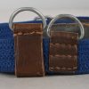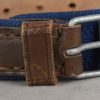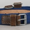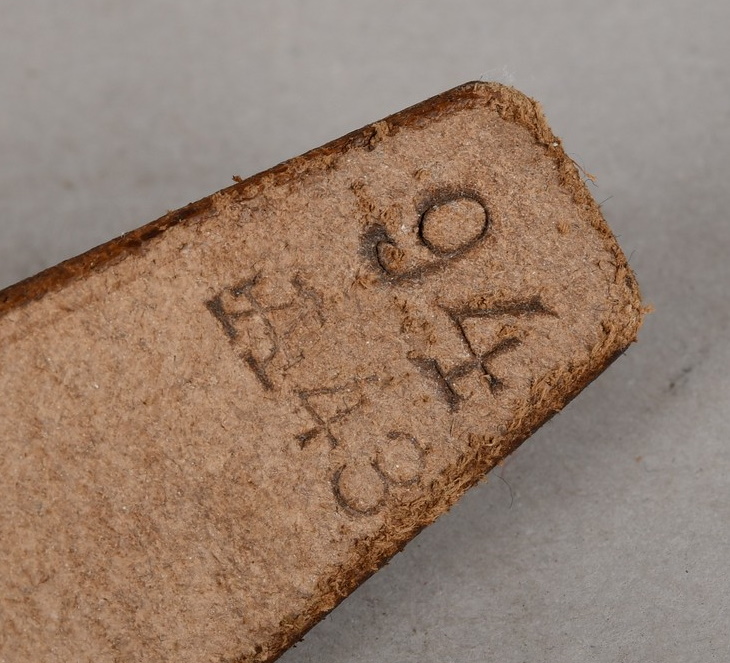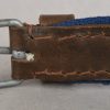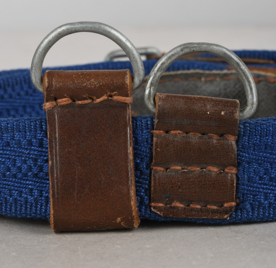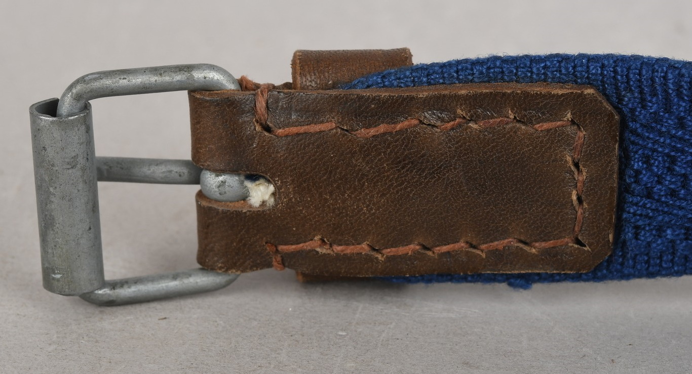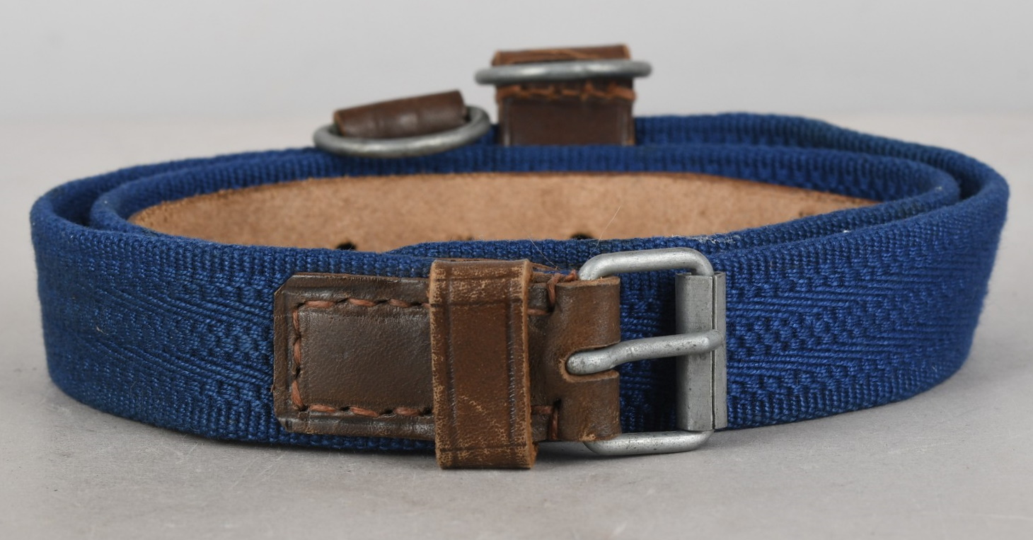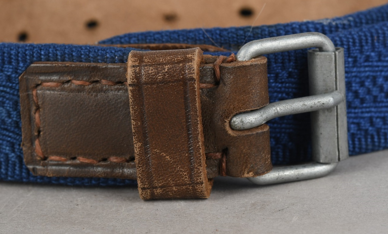 The belt is constructed of woven blue cotton with brown leather and sheet metal buckle. The belt is roughly 100cm long and 2.5cm wide. Both “D” rings are present. The buckle end of the belt has one fixed leather loop. It has logo “A” corresponding to the manufacture “F.W. Assmann & Söhne, Lüdenscheid”, and the year “1943”. The belt is in close to mint condition.