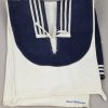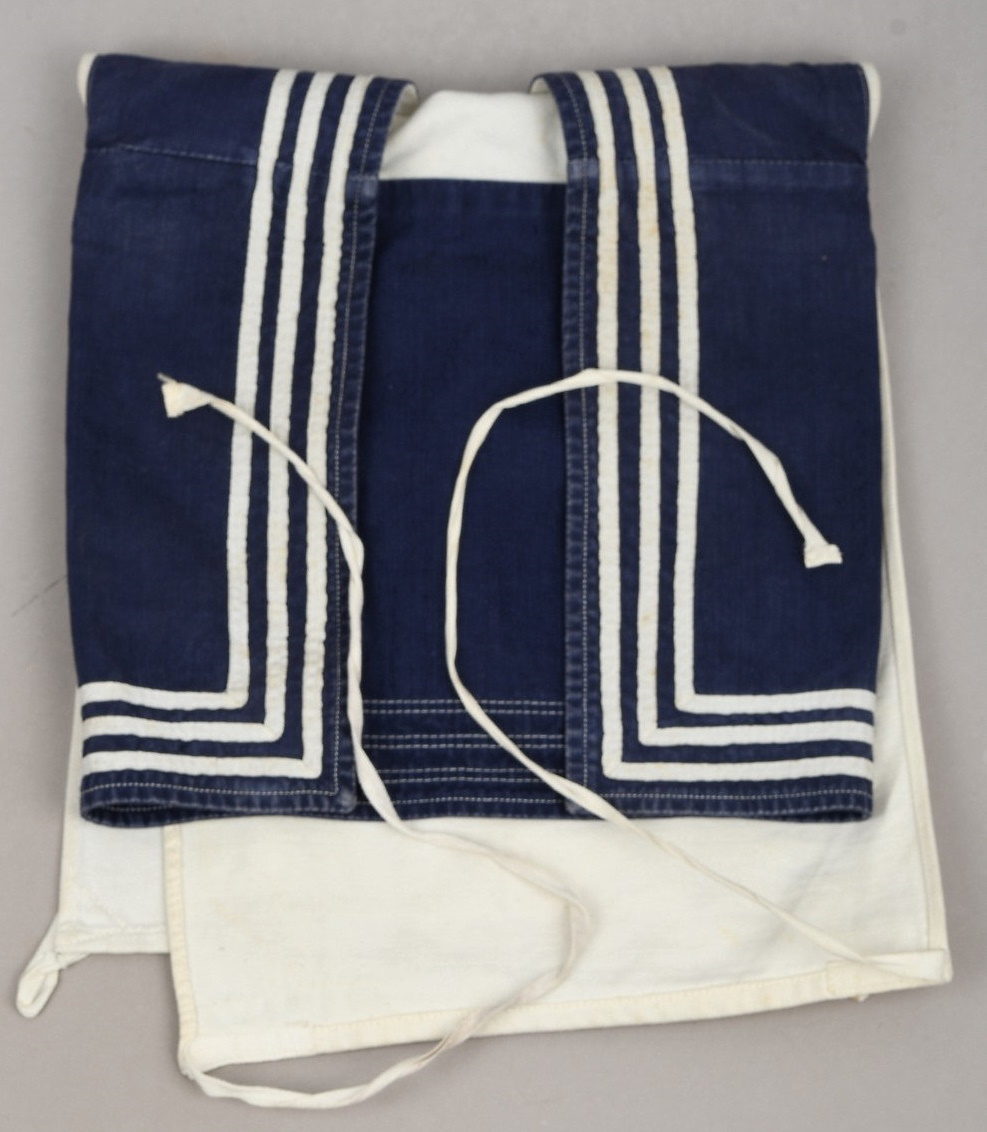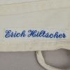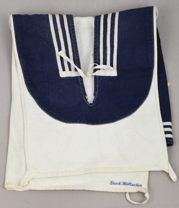 The collar dickie consists of a rectangular, white cotton construction, breast and back panels with a fold back mid-blue “nankeen” collar. The back panel has a tie tape to each bottom corner and the breast panel has two, small, tie tape loops allowing the dickie it to be tied around the wearer’s body underneath his shirt with the fold back collar hanging over the exterior back of the shirt. The upper breast panel also has two tie tapes situated at the top edges of the “V” slash to secure the neckerchief to the dickie. A name label is hand sewn in place it reads: “Erich Hiltscher”. In very good condition with minor signs of age and use.