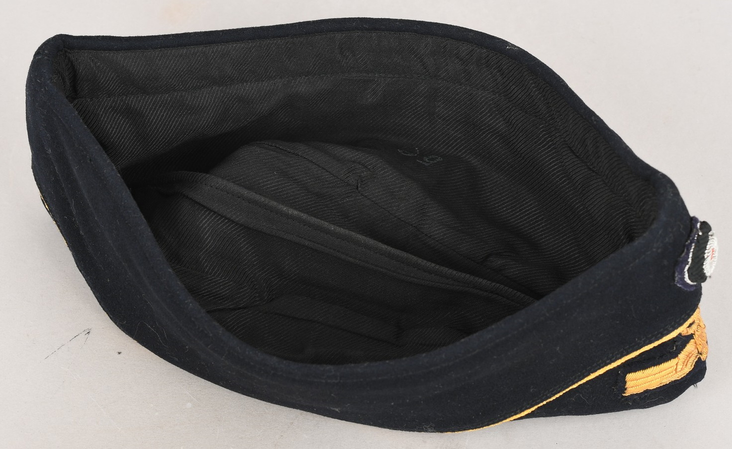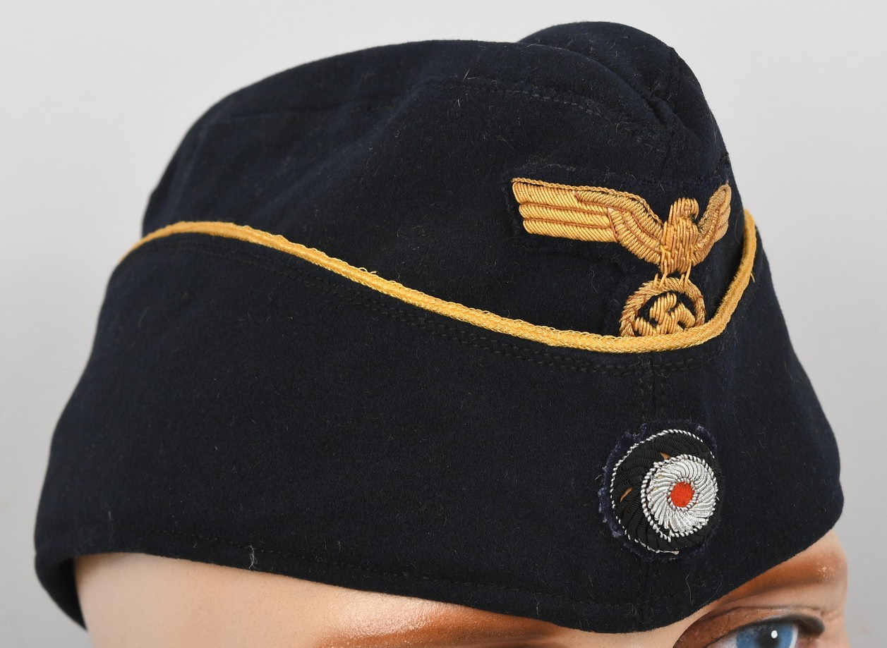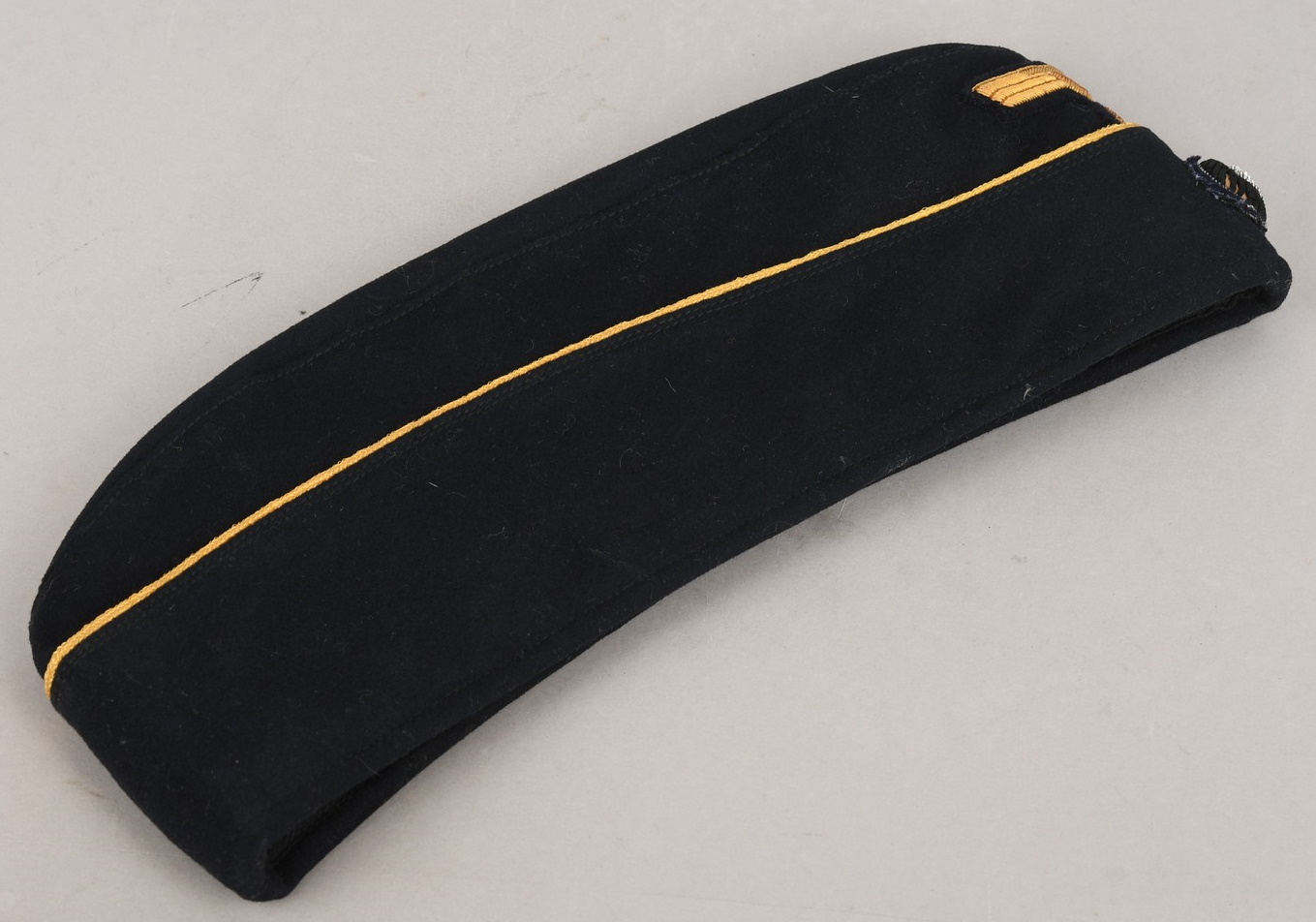 Private purchase, deep navy blue, fine doeskin construction cap with fold down side and back panels. The top edge of the fold down panels are trimmed in gold celleon wire piping. The front center of the cap has a hand embroidered national eagle in golden celleon threads on a navy blue wool base. The eagle is neatly handstitched to the cap. The front center of the fold down panels has a hand embroidered national tri-color cockade, in black, silver/aluminum and red threads on a dark green wool base. The cockade is neatly handstitched to the cap. The interior of the cap is fully lined in black crayon. Inside is size stamped “56” in white ink. The cap is in very good condition with light signs of age and use. No holes, rips or mendings.