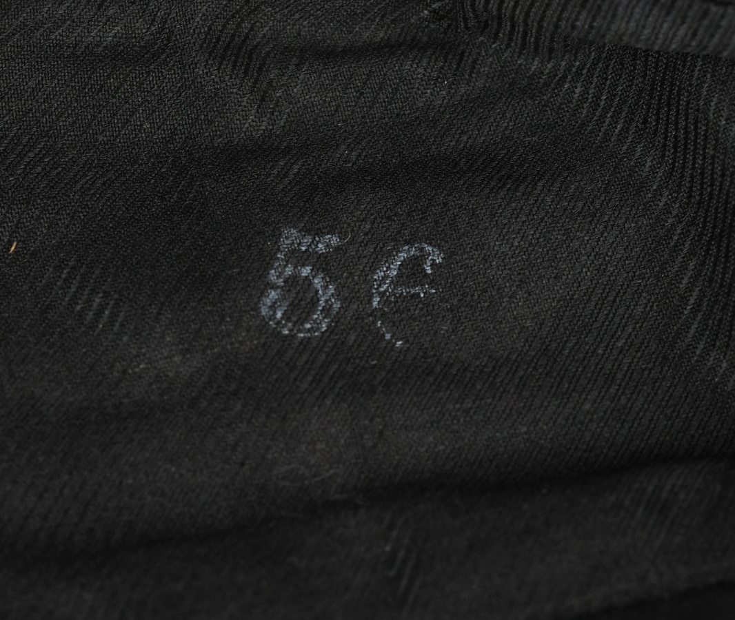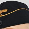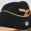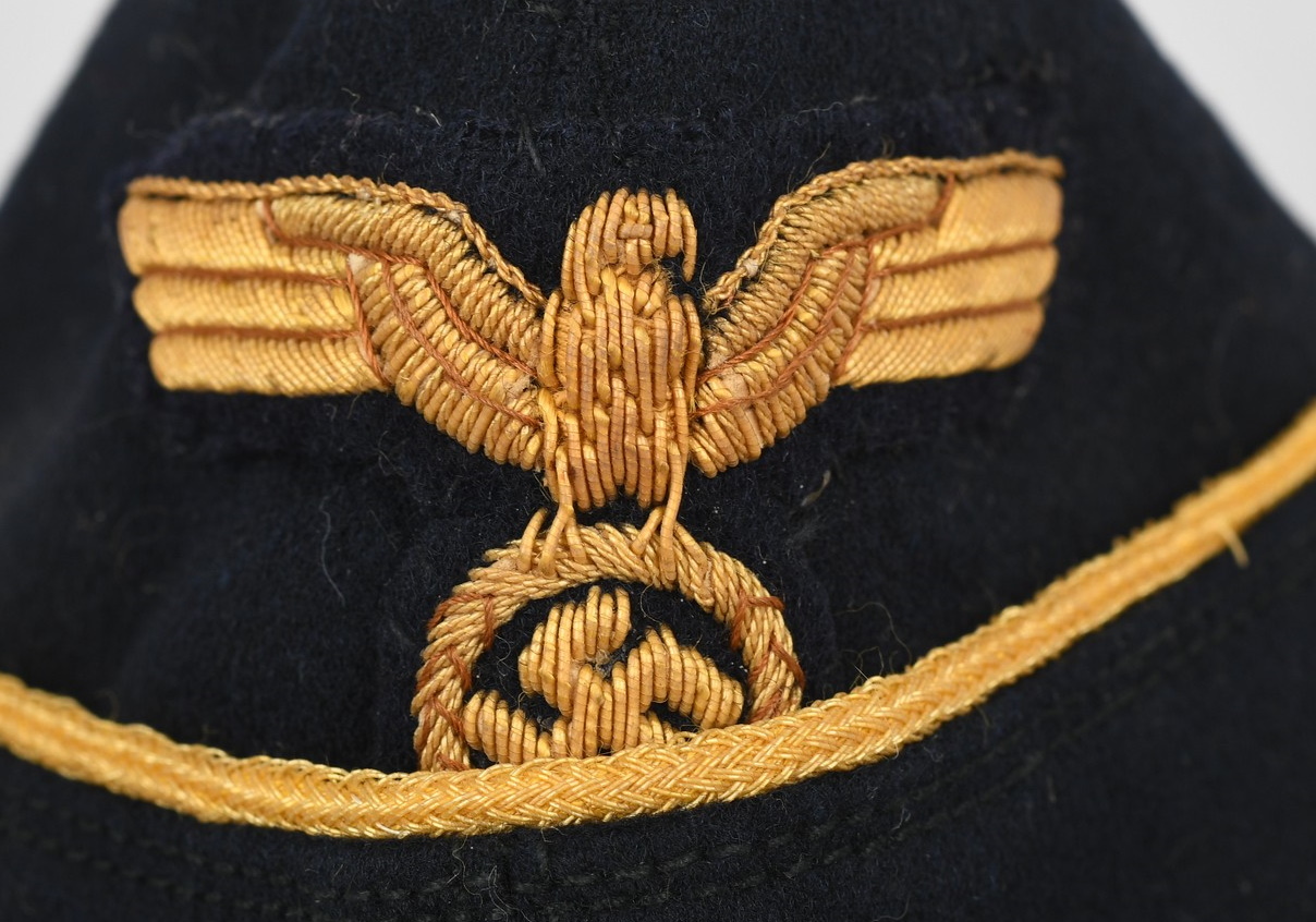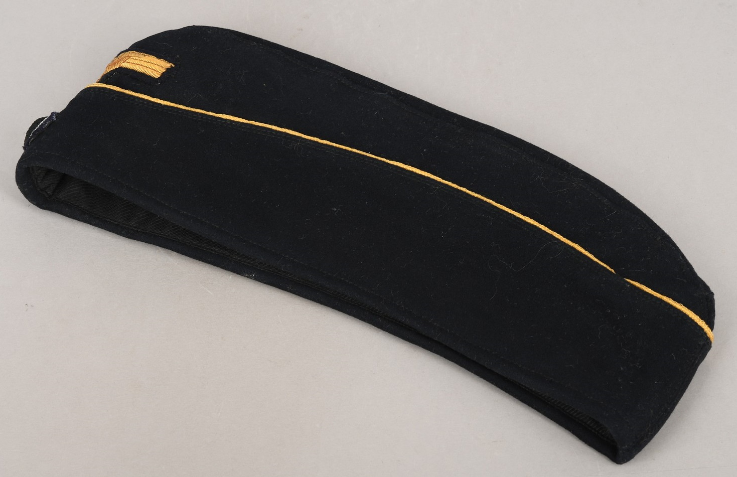 Private purchase, deep navy blue, fine doeskin construction cap with fold down side and back panels. The top edge of the fold down panels are trimmed in gold celleon wire piping. The front center of the cap has a hand embroidered national eagle in golden celleon threads on a navy blue wool base. The eagle is neatly handstitched to the cap. The front center of the fold down panels has a hand embroidered national tri-color cockade, in black, silver/aluminum and red threads on a dark green wool base. The cockade is neatly handstitched to the cap. The interior of the cap is fully lined in black crayon. Inside is size stamped “56” in white ink. The cap is in very good condition with light signs of age and use. No holes, rips or mendings.