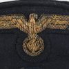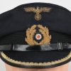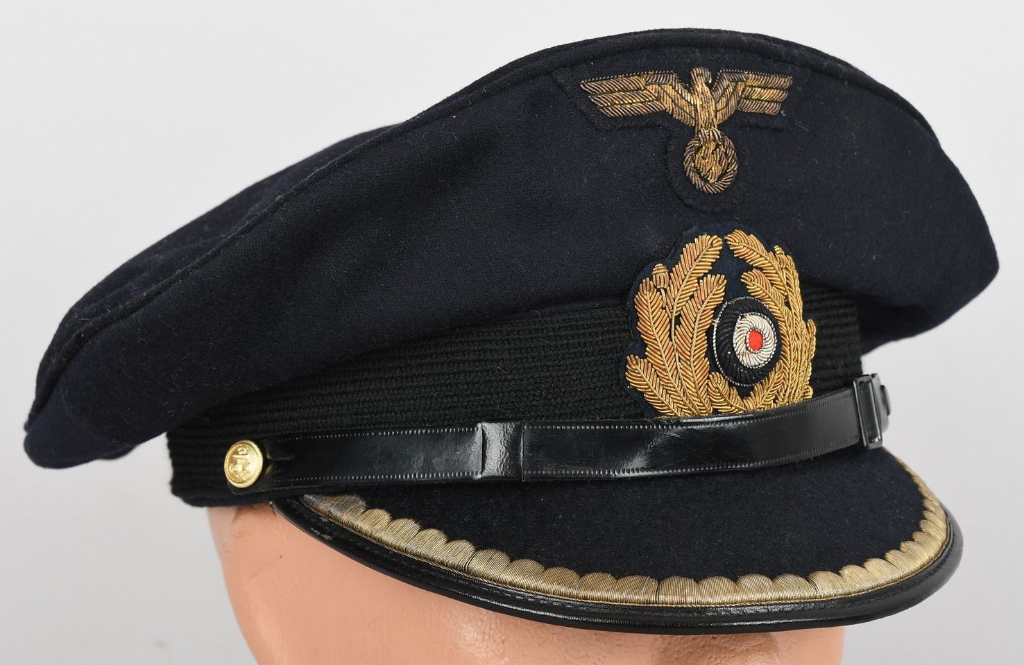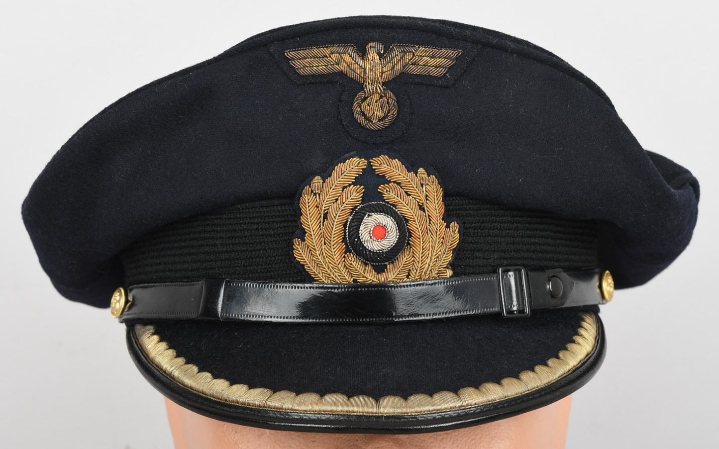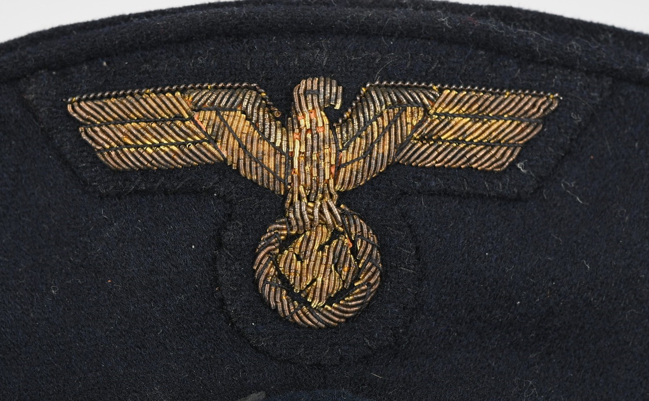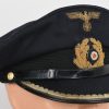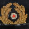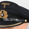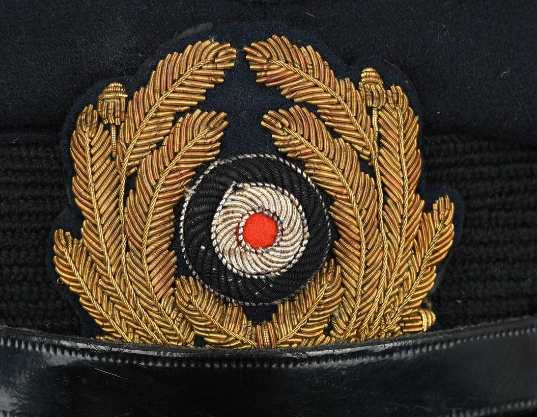 Hice quality dark blue, doeskin wool construction cap with a black, ribbed, centerband and a removable top. The front center of the cap has a hand embroidered national eagle in gilt wire threads, mounted on a cut-out navy blue wool base. The eagle is neatly handstitched to the cap. The front center of the centerband has a hand embroidered oak-leaf wreath in gilt wire encompassing a national tri-color cockade in black and silver wire threads with an red felt centerpiece. The wreath and cockade are mounted on a padded, navy blue wool base which is also neatly handsewn to the cap. The cap has a black, leather chinstrap. The chinstrap is secured to the cap by two, small, fire gilted sheet metal buttons. The cap has an extended, forward, black visor with a dark blue wool top covering to the top edge with a single row of scalloped edged, hand embroidery in gilt wire threads and simulated, black leather trim both positioned near the forward edge. The embroidery on the visor signifies that the owner was holding the rank of Leutnant zur See, Oberleutnant zur See or Kapitänleutnant. The interior of the cap is fully lined in ribbed blue rayon. The interior of the cap also has a intact leather sweatband and celluloid sweat shield. The cap is in very good condition with light signs of age and use. The matching set of bullion insignias shows a nice age patina. There is a couple of minor moth holes located to the reverse of the cap. Size is 59.
