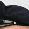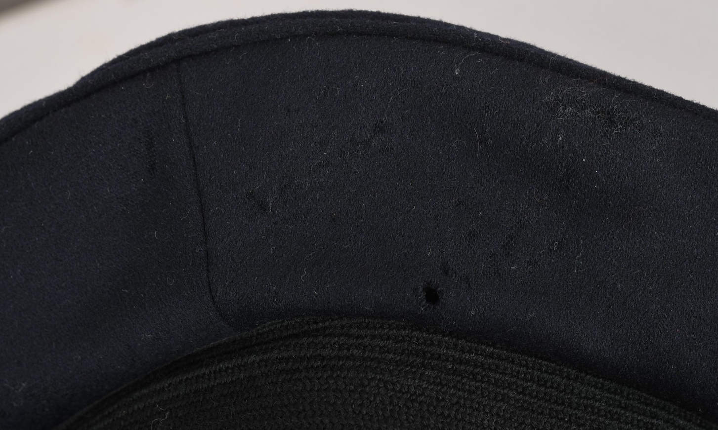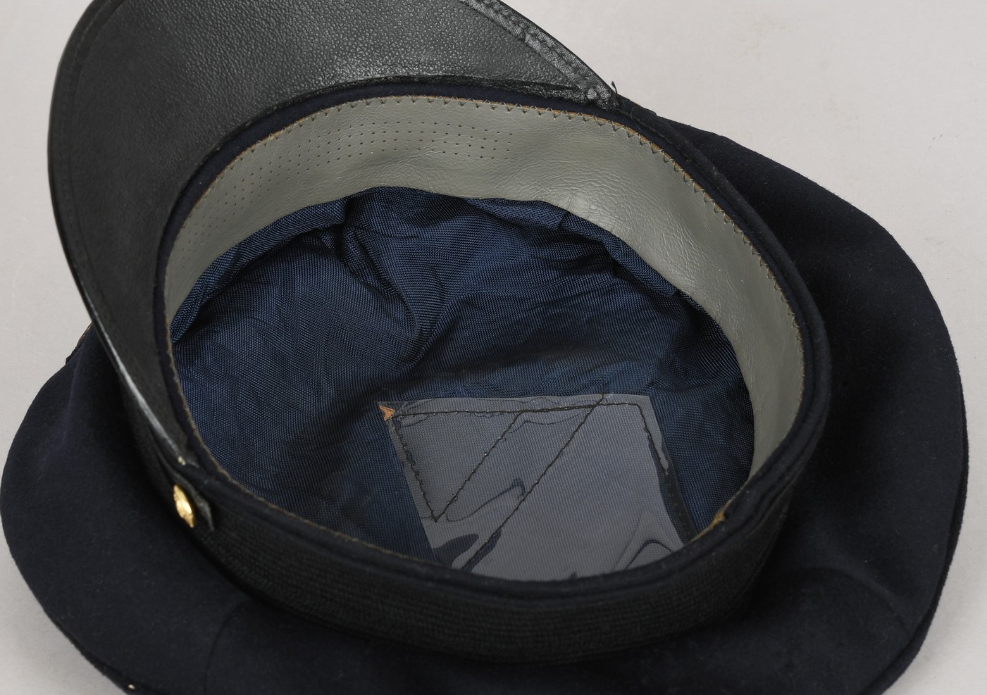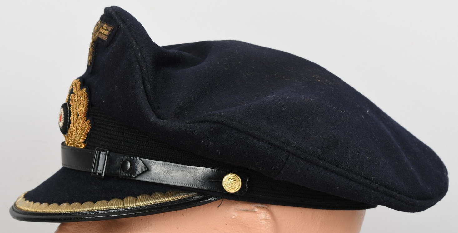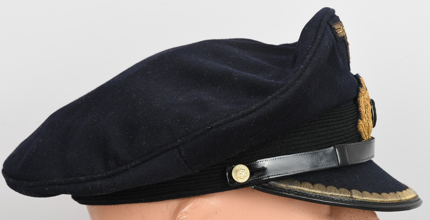 Hice quality dark blue, doeskin wool construction cap with a black, ribbed, centerband and a removable top. The front center of the cap has a hand embroidered national eagle in gilt wire threads, mounted on a cut-out navy blue wool base. The eagle is neatly handstitched to the cap. The front center of the centerband has a hand embroidered oak-leaf wreath in gilt wire encompassing a national tri-color cockade in black and silver wire threads with an red felt centerpiece. The wreath and cockade are mounted on a padded, navy blue wool base which is also neatly handsewn to the cap. The cap has a black, leather chinstrap. The chinstrap is secured to the cap by two, small, fire gilted sheet metal buttons. The cap has an extended, forward, black visor with a dark blue wool top covering to the top edge with a single row of scalloped edged, hand embroidery in gilt wire threads and simulated, black leather trim both positioned near the forward edge. The embroidery on the visor signifies that the owner was holding the rank of Leutnant zur See, Oberleutnant zur See or Kapitänleutnant. The interior of the cap is fully lined in ribbed blue rayon. The interior of the cap also has a intact leather sweatband and celluloid sweat shield. The cap is in very good condition with light signs of age and use. The matching set of bullion insignias shows a nice age patina. There is a couple of minor moth holes located to the reverse of the cap. Size is 59.