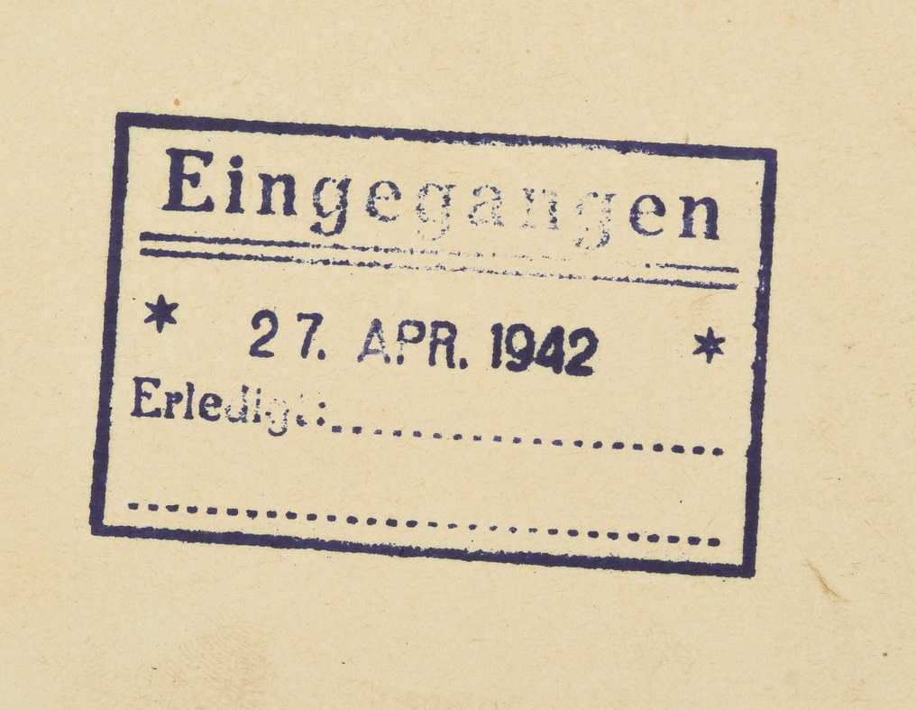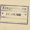 Large war time poster wich meassures 120cm x 82cm. Large motto “wir haben allle nur einen willen, sieg um jeden preis!” which translates to: “we all only have one will, victory at any cost!”. The poster has still clear colors but has heavy folds with partly broken paper. This poster has to be handled with care in the future to avoid a complete break. Best option is to frame it. Anyway, the poster displays great with as said still strong colors. The reverse is stamped “eingeganged 27 apr 1942”. Which freely translates to: “was delivered or received 27 April 1942”.