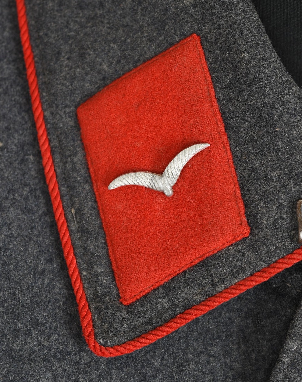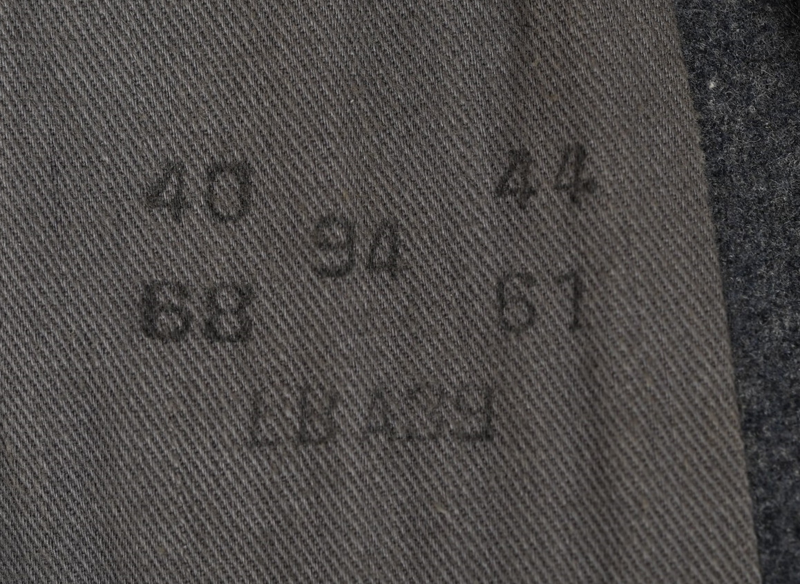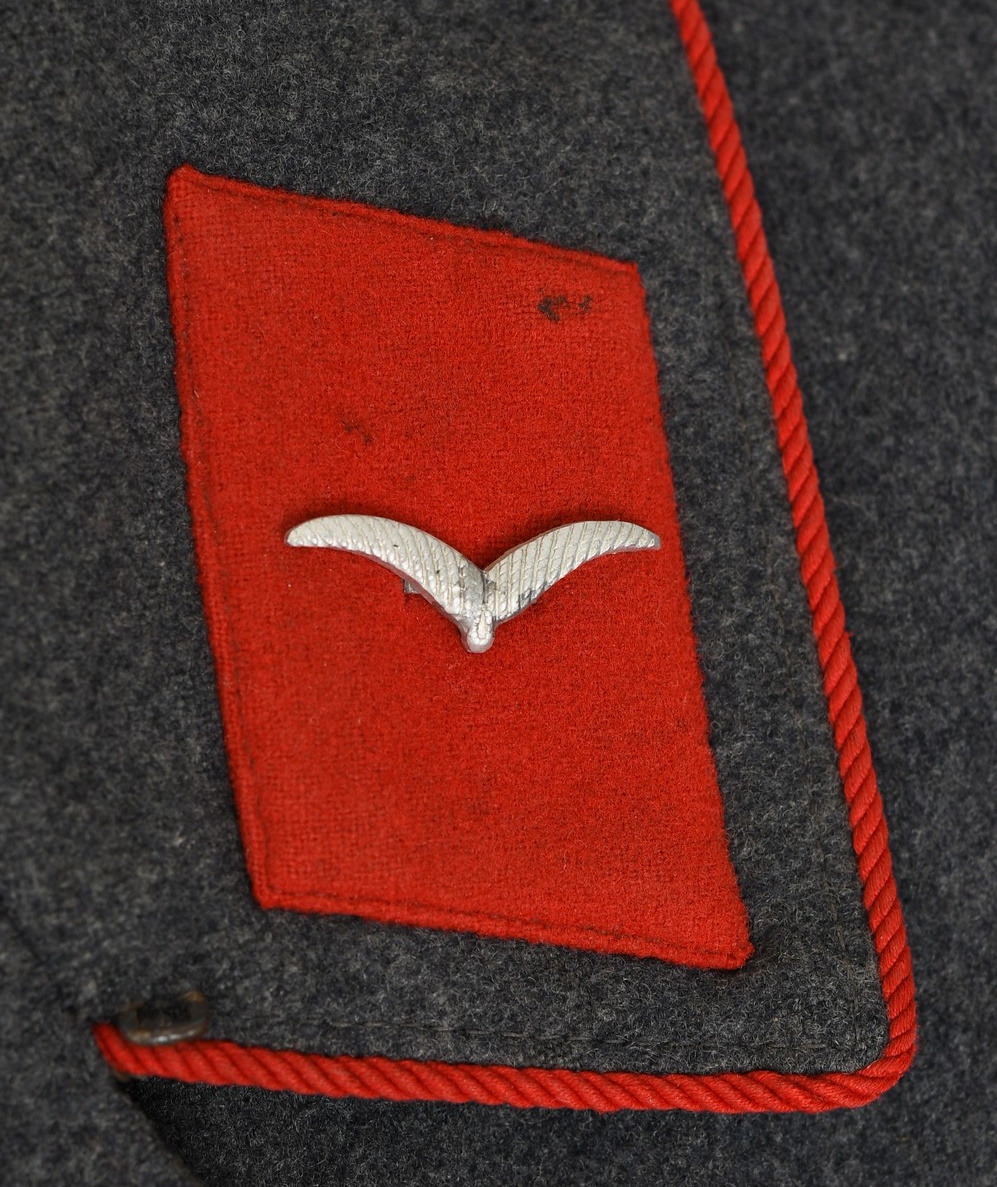 Tunic is in the standard configuration for a Luftwaffe Tuchrock, open collar, with four button front closure, four pleated patch pockets and turn back cuffs. Sew-in shoulder board with red wool piping and chain stitched embroidery “7”. The lower collar edge is piped in red colored twisted cord. To the collar is red wool collar tabs with one alloy metal “seagull” pinned in place. The collar tabs are machine sewn in place. Above the right breast pocket is a 2’nd pattern machine sewn in place, through the lining. The eagle is in our opinion added after the war. To the upper left sleeve is a luftwaffe obergefreiter rank chevron neatly hand sewn in place. Further down the same sleeve is a very nice rangefinder speciality badge with golden cord for 1 year service, neatly hand sewn in place. Above the left breast pocket is a two place ribbon bar (east front medal and KvK 2’class) pinned in place. Inside is lined with grey colored brushed cotton. The lining is stamped LBA 39 and also size stamped, all in black ink.