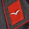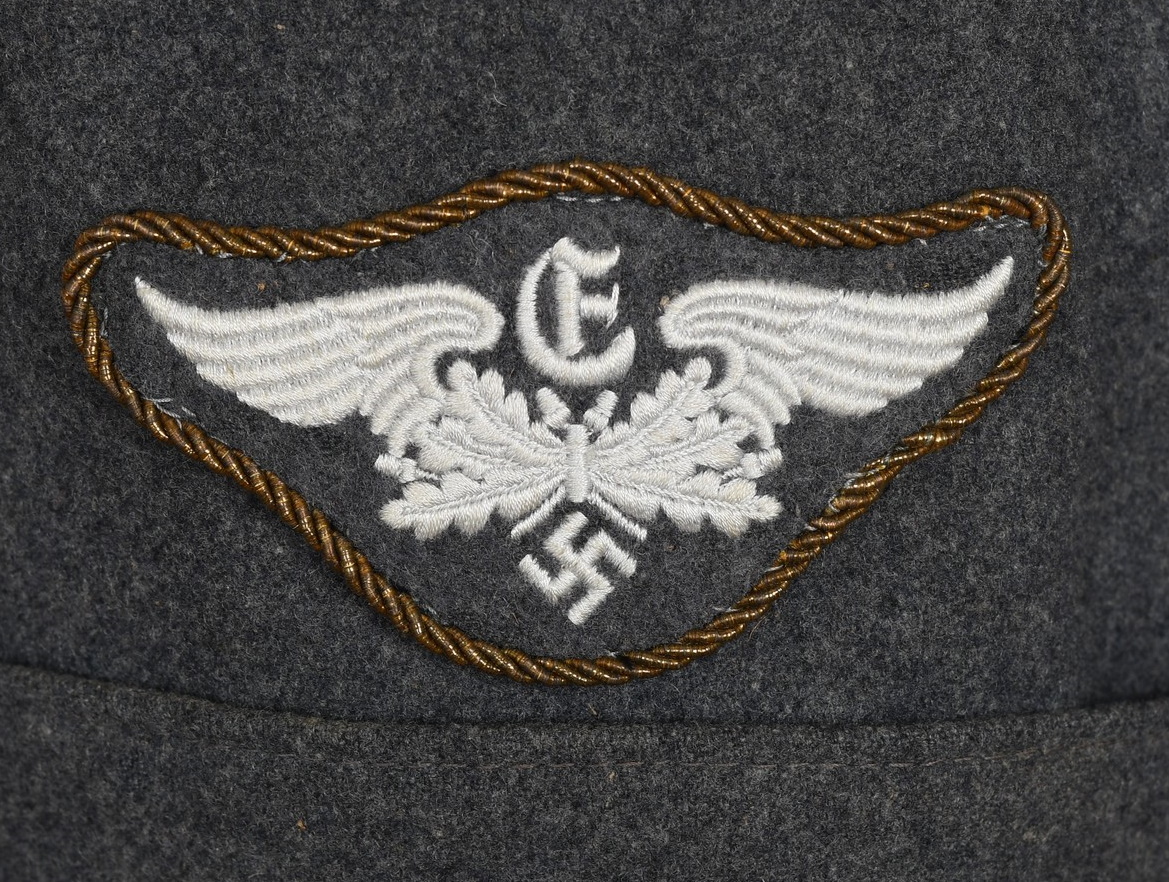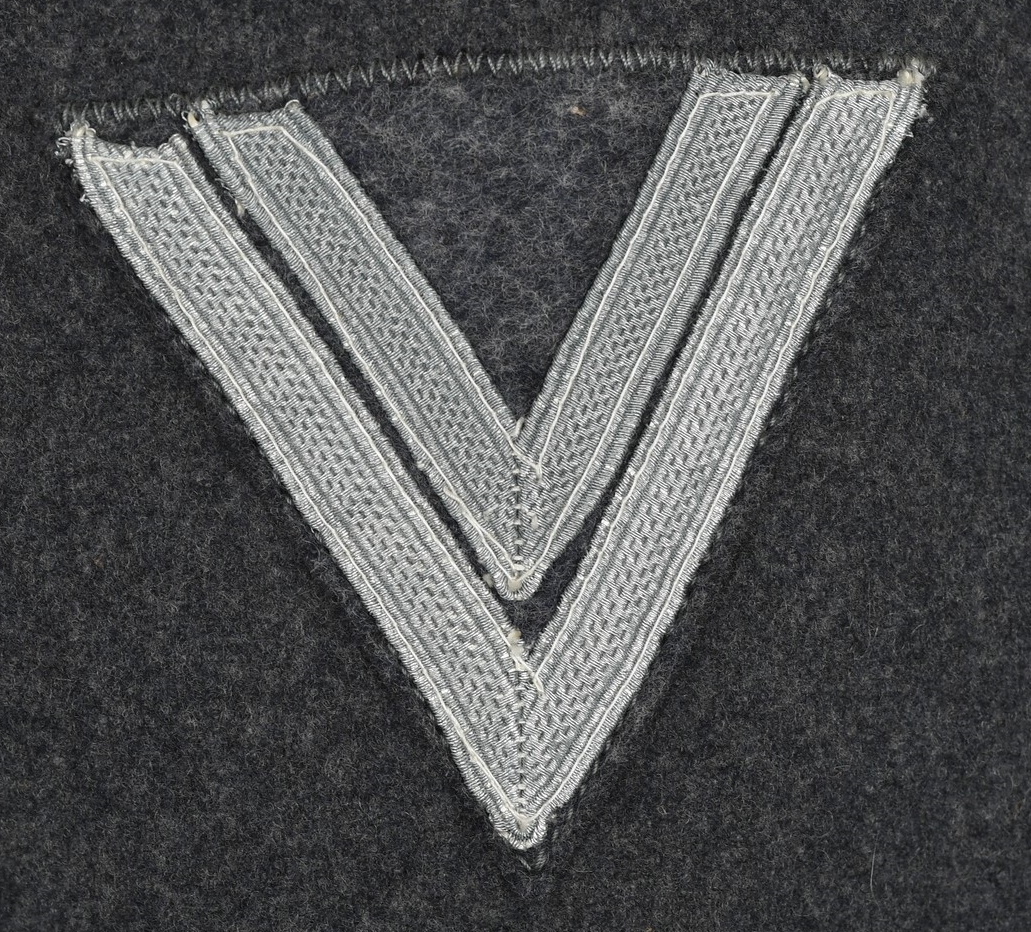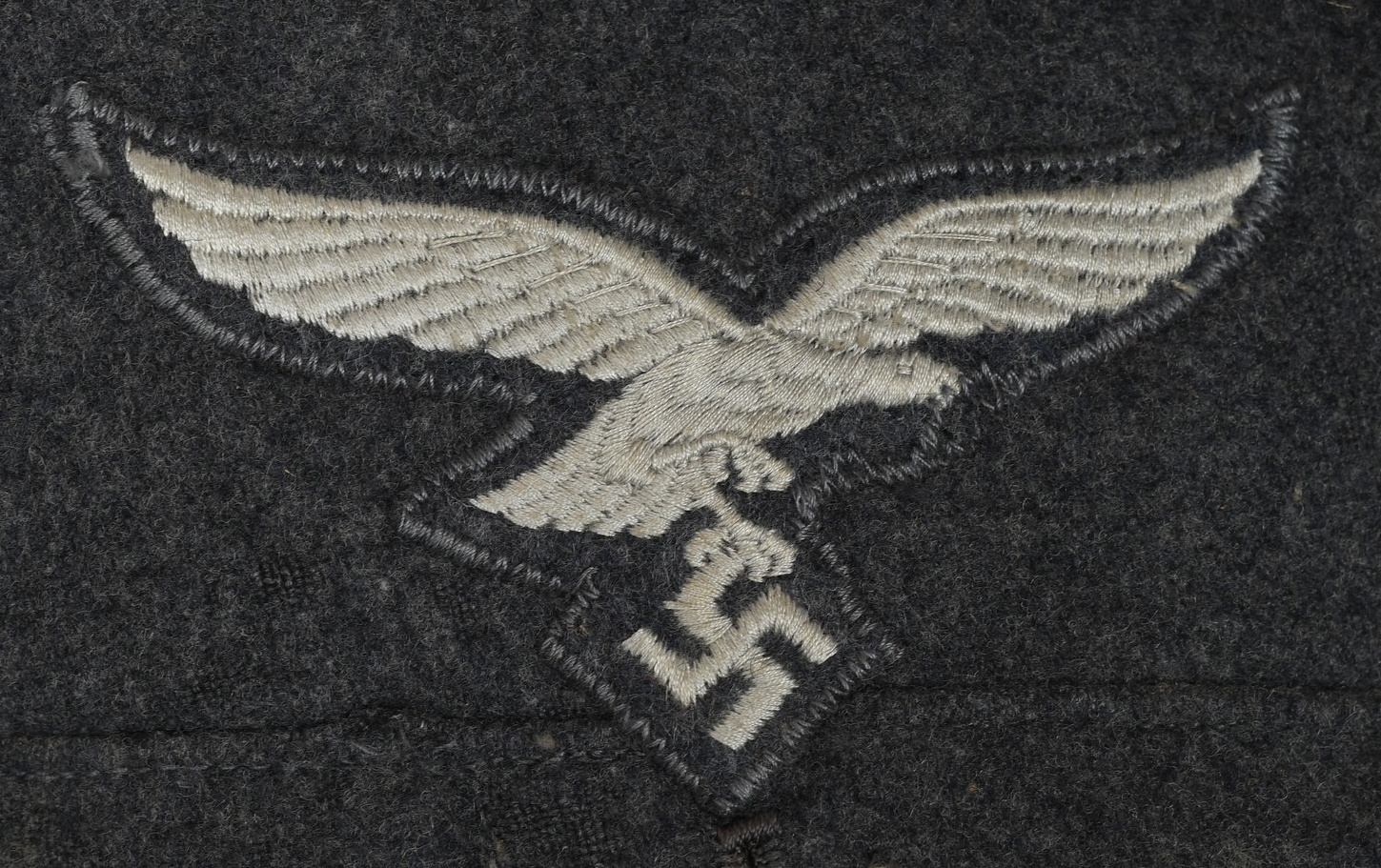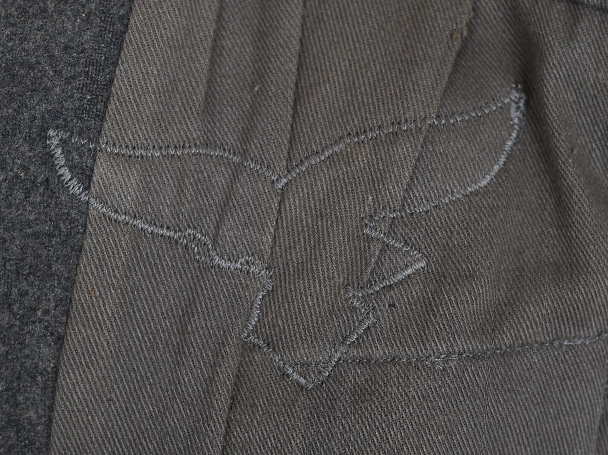 Tunic is in the standard configuration for a Luftwaffe Tuchrock, open collar, with four button front closure, four pleated patch pockets and turn back cuffs. Sew-in shoulder board with red wool piping and chain stitched embroidery “7”. The lower collar edge is piped in red colored twisted cord. To the collar is red wool collar tabs with one alloy metal “seagull” pinned in place. The collar tabs are machine sewn in place. Above the right breast pocket is a 2’nd pattern machine sewn in place, through the lining. The eagle is in our opinion added after the war. To the upper left sleeve is a luftwaffe obergefreiter rank chevron neatly hand sewn in place. Further down the same sleeve is a very nice rangefinder speciality badge with golden cord for 1 year service, neatly hand sewn in place. Above the left breast pocket is a two place ribbon bar (east front medal and KvK 2’class) pinned in place. Inside is lined with grey colored brushed cotton. The lining is stamped LBA 39 and also size stamped, all in black ink.