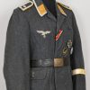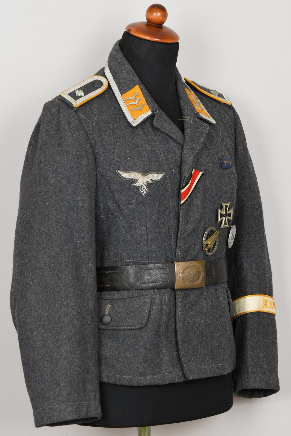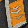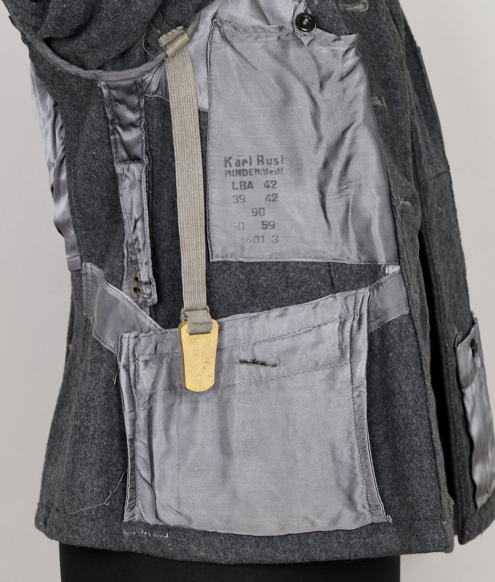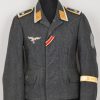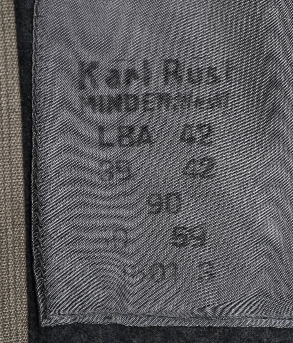 Issued Luftwaffe blue/grey,wool construction tunic features a four button front closure. Small fold back lapels and a lay down collar. The flight blouse has two slash, front hip pockets. The right breast has a machine embroidered EM/NCO’s Luftwaffe national eagle machine sewn in place. Collar with silver/aluminum luftwaffe pattern rank tress and yellow cloth collar tabs with three “sea gulls” pinned in place to each. The collar tabs are machine sewn in place. To the shoulder are slip-on shoulder straps slided and buttoned in place. The shoulder straps have yellow trimmed wool branch of service piping, rank tresse all arround and one silver washed rank pip pinned in place. The upper, left panel of the front closure has an Iron Cross 2’nd class ribbon handstitched in place. There is also award loops sewn for three badges and loops sewn for a 3-4 place ribbon bar, all to the left side chest area. To the upper left sleeve is a NARVIK campaign shield in non ferrous metal hand sewn in place. Further down the same sleeve is a KRETA campaign cuff band hand sewn in place. The interior of the flight blouse is lined in silver/blue/grey rayon. Lining is also well stamped with manufacturers name and location, size and also LBA 42. 42 is for the year of production: 1942. Sewn to the armpit is a dagger hanger which corresponds with a later made opening situated to the inside of the left hip pocket.