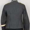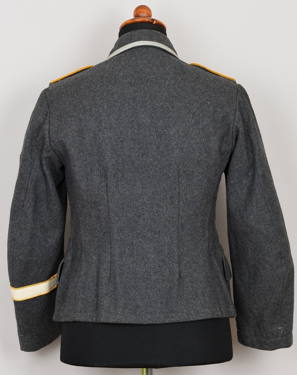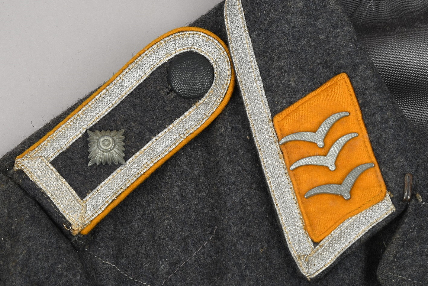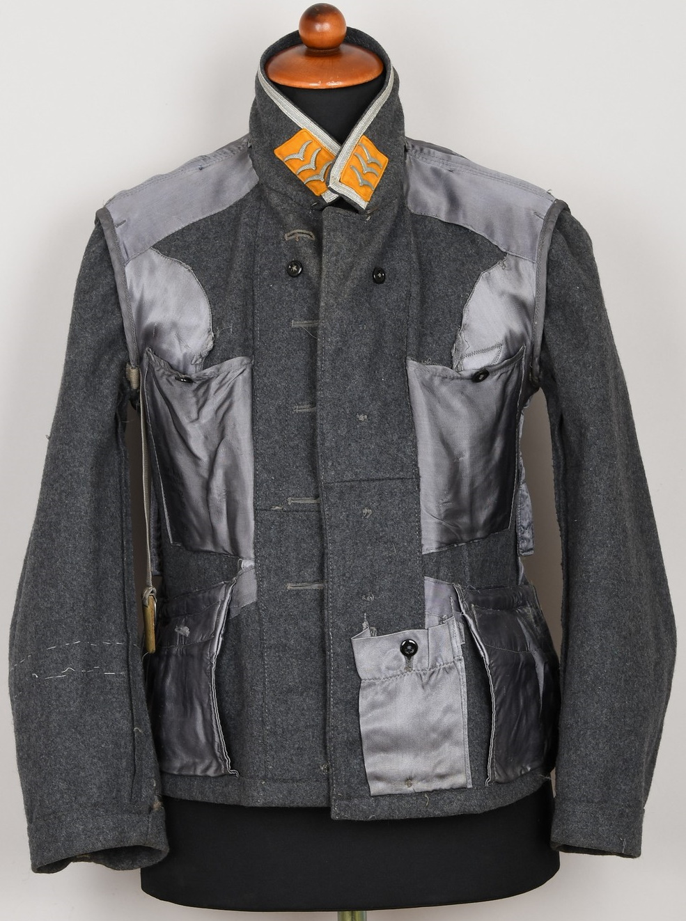 Issued Luftwaffe blue/grey,wool construction tunic features a four button front closure. Small fold back lapels and a lay down collar. The flight blouse has two slash, front hip pockets. The right breast has a machine embroidered EM/NCO’s Luftwaffe national eagle machine sewn in place. Collar with silver/aluminum luftwaffe pattern rank tress and yellow cloth collar tabs with three “sea gulls” pinned in place to each. The collar tabs are machine sewn in place. To the shoulder are slip-on shoulder straps slided and buttoned in place. The shoulder straps have yellow trimmed wool branch of service piping, rank tresse all arround and one silver washed rank pip pinned in place. The upper, left panel of the front closure has an Iron Cross 2’nd class ribbon handstitched in place. There is also award loops sewn for three badges and loops sewn for a 3-4 place ribbon bar, all to the left side chest area. To the upper left sleeve is a NARVIK campaign shield in non ferrous metal hand sewn in place. Further down the same sleeve is a KRETA campaign cuff band hand sewn in place. The interior of the flight blouse is lined in silver/blue/grey rayon. Lining is also well stamped with manufacturers name and location, size and also LBA 42. 42 is for the year of production: 1942. Sewn to the armpit is a dagger hanger which corresponds with a later made opening situated to the inside of the left hip pocket.