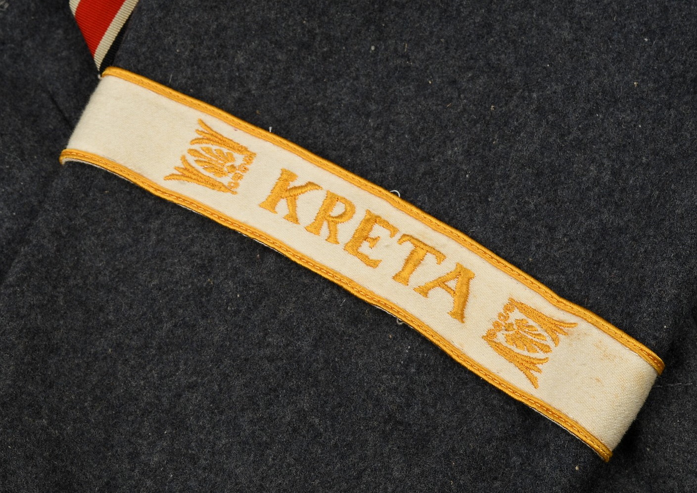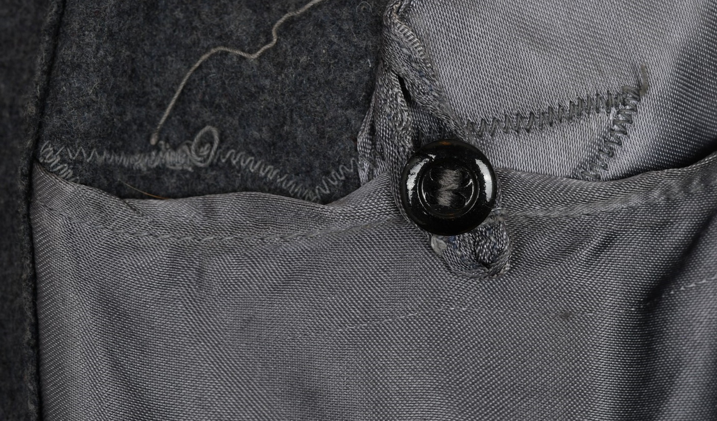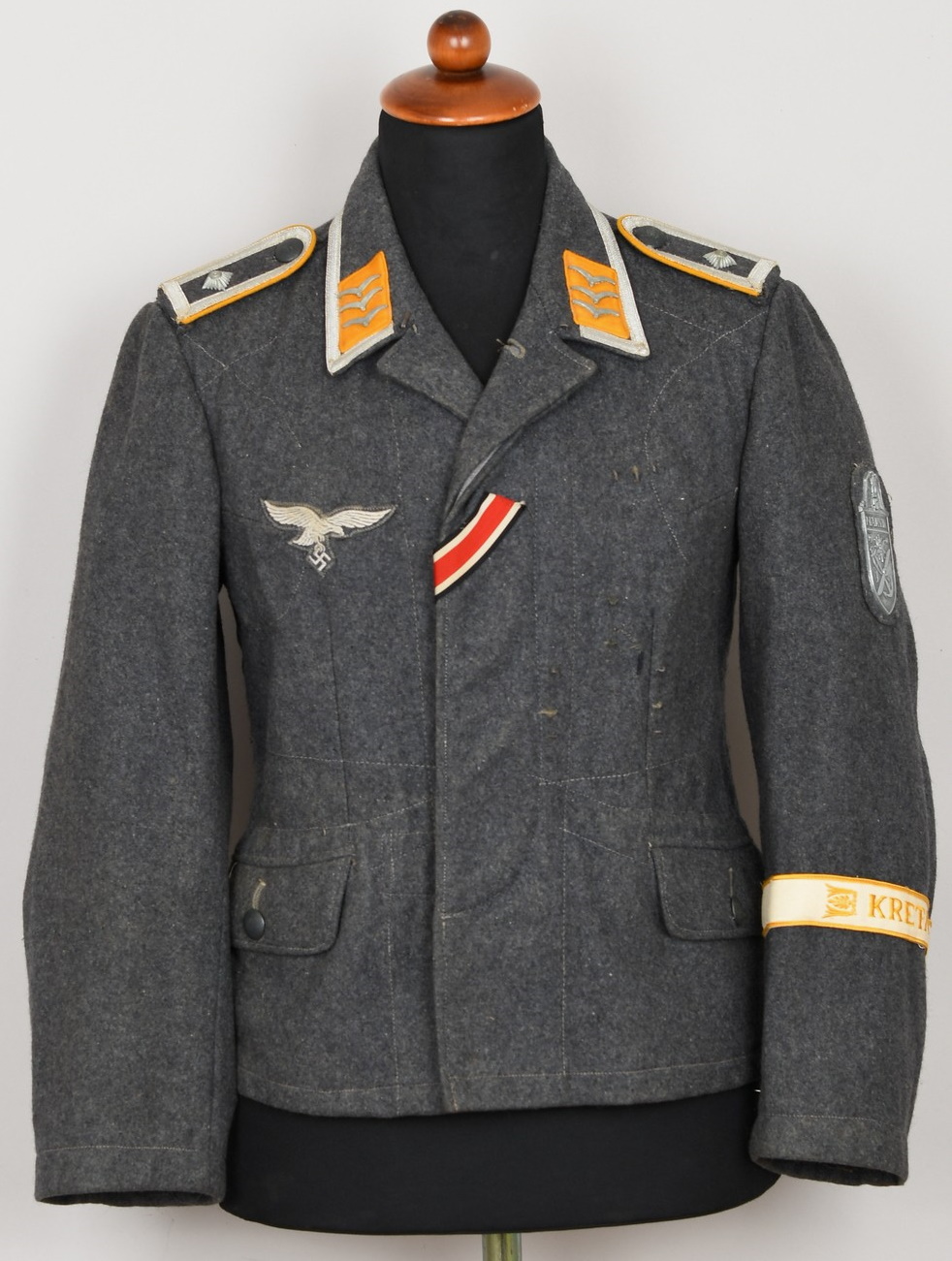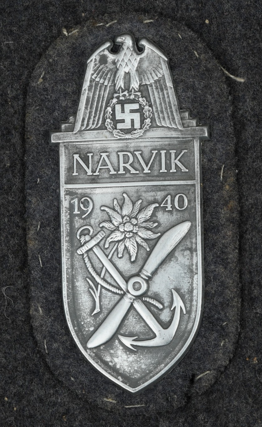 The tunic shows signs of age and real use. The KRETA cuff band, NARVIK campaign shield and Iron Cross ribbon has all been attached in a rather crude manner. The sewing artist was not one with great skills, most likely the soldier himself. Award loops was sewn with different threads and there is traces left from a flight or paratrooper cloth award. All looks war-time made.