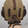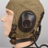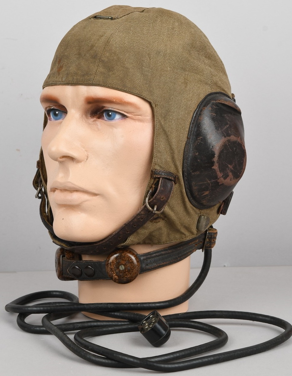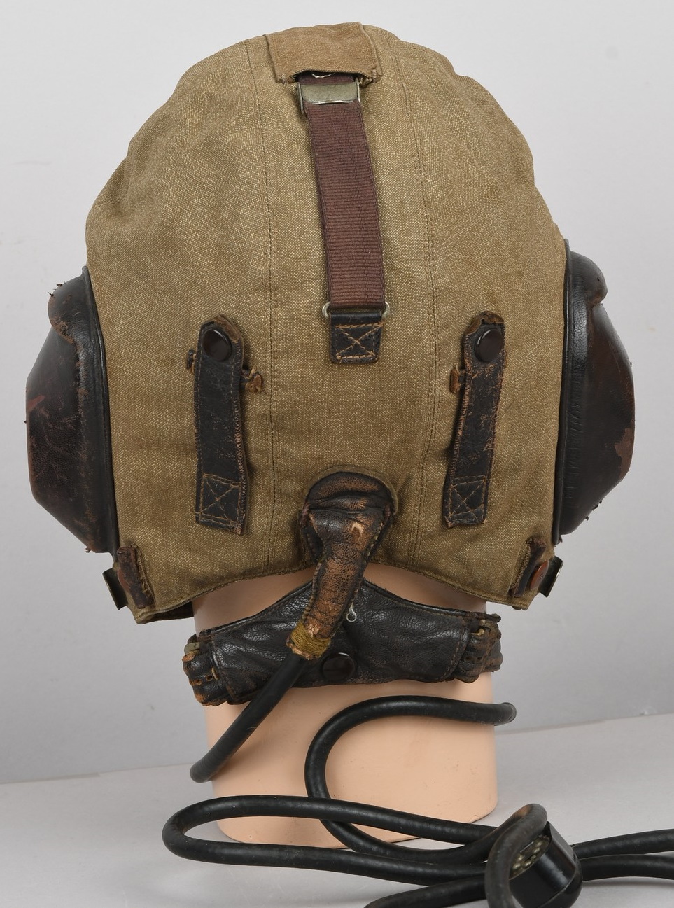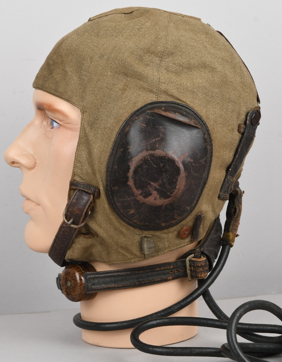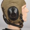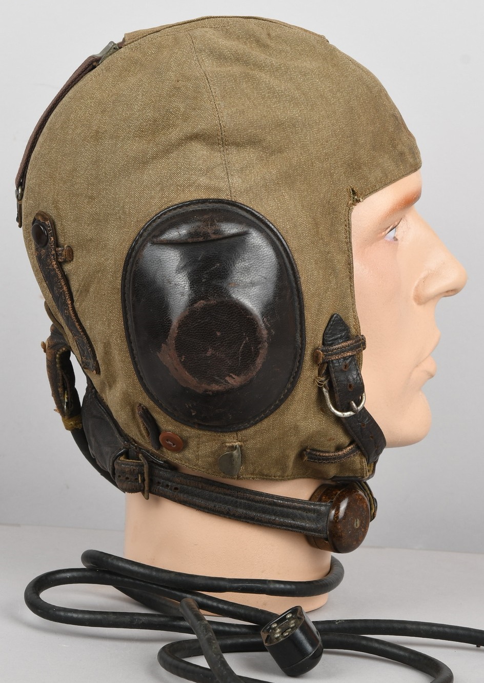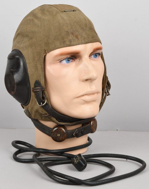 Five panel, slightly mottled, tan linen construction summer flight helmet. All complete. Manufacturers tag is sewn to the interior denoting model, etc. Throat mic also still intact. In very good condition with light signs of age and use.