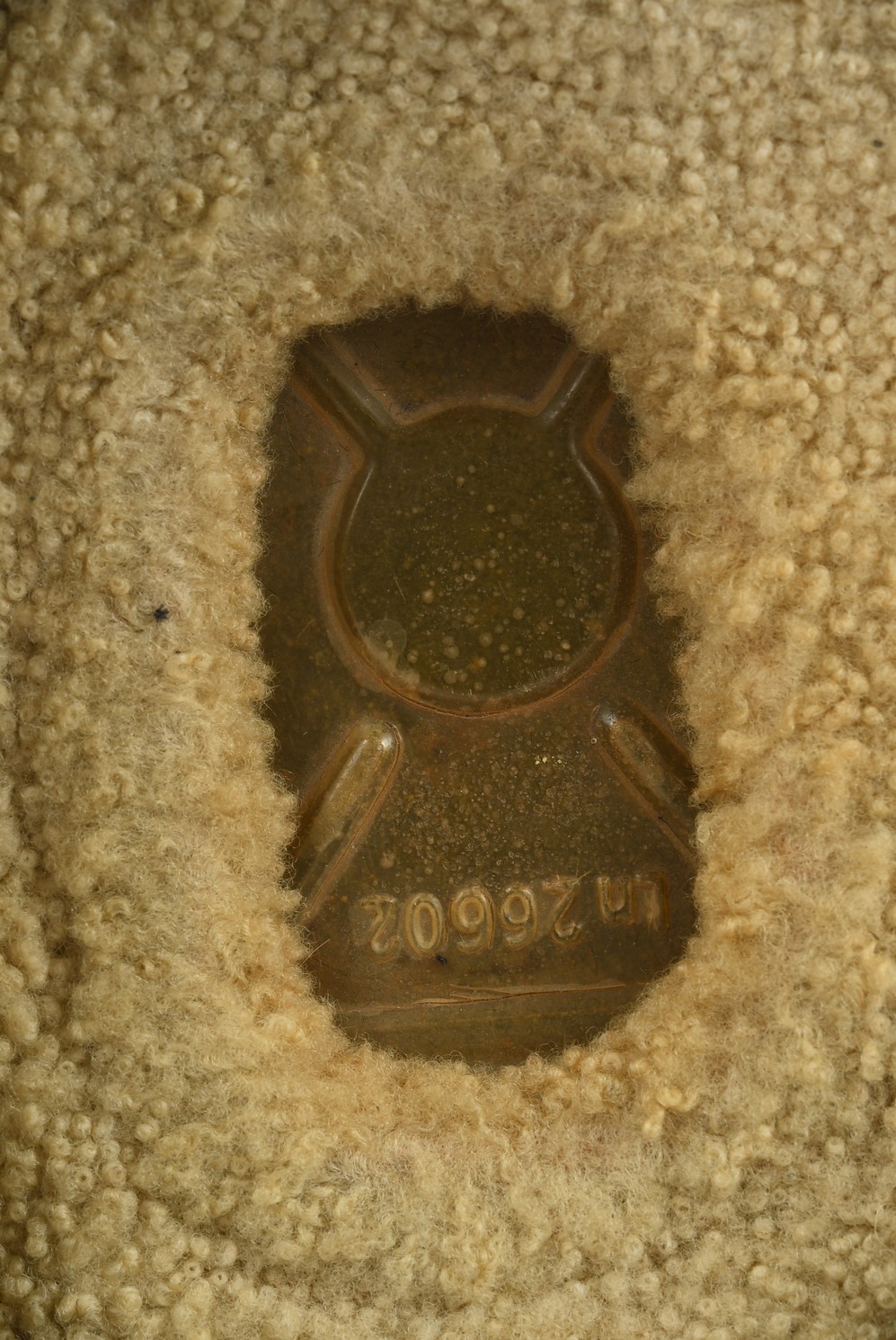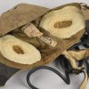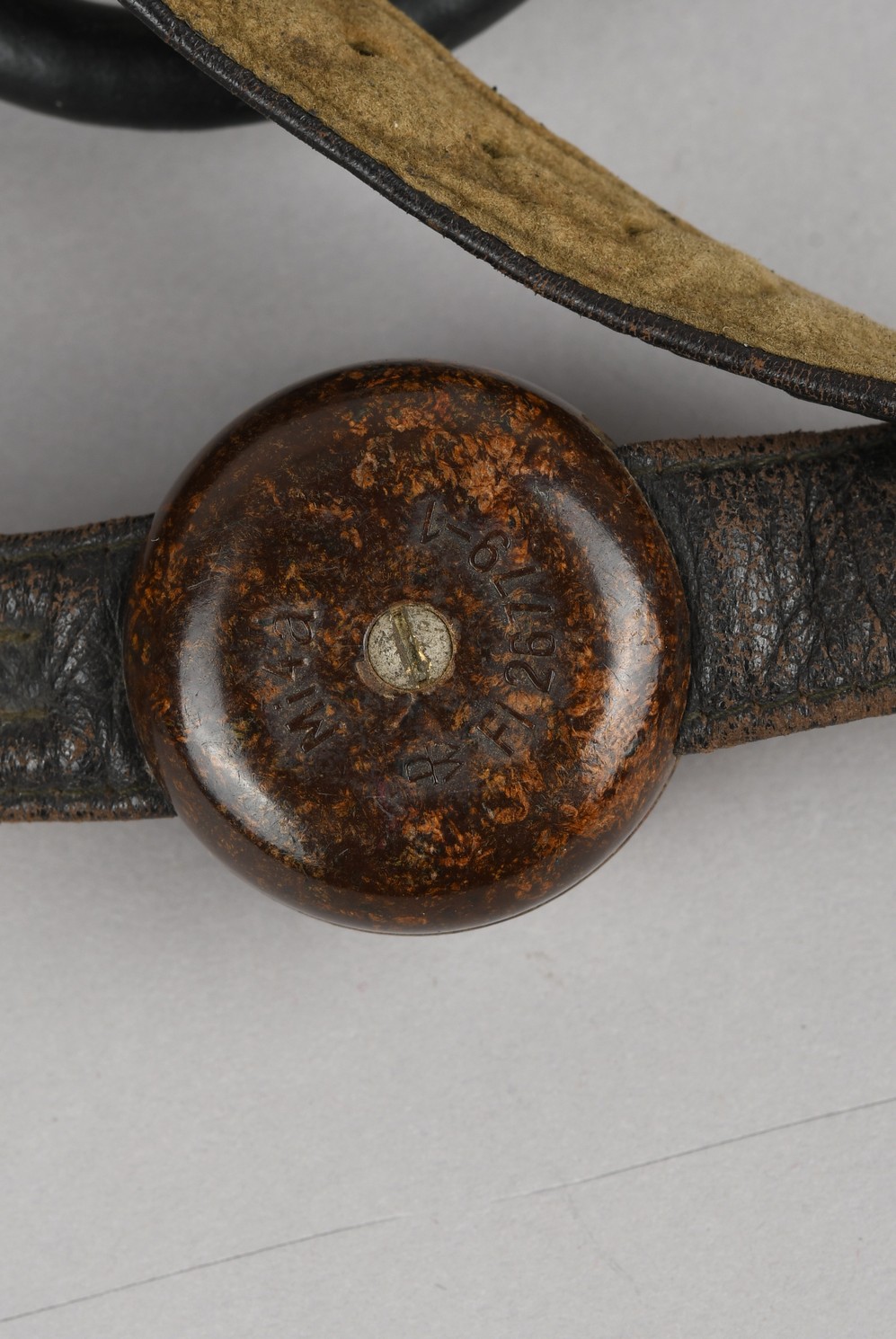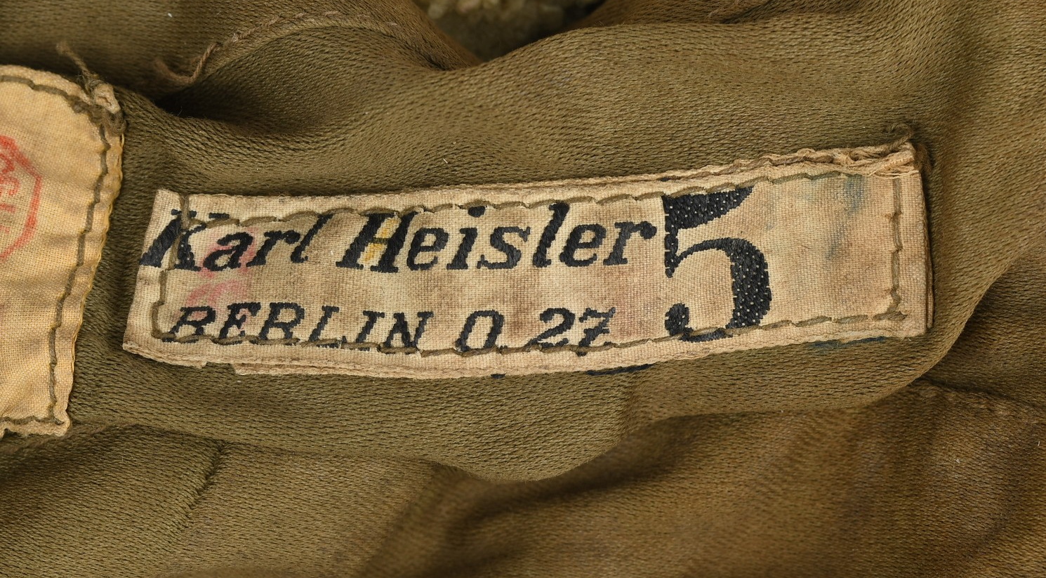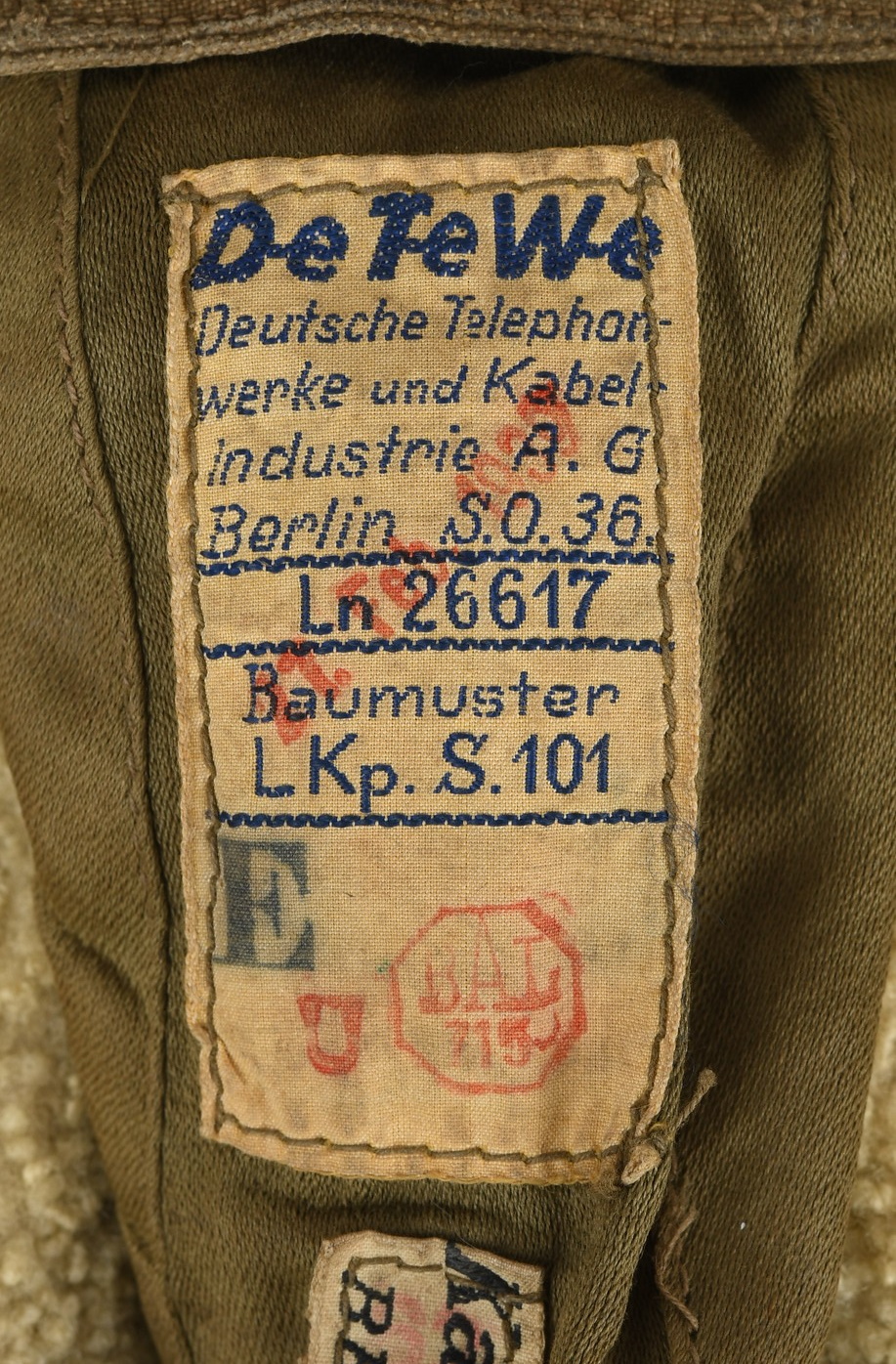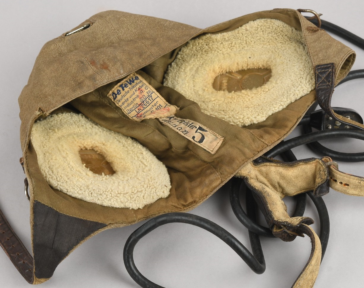Five panel, slightly mottled, tan linen construction summer flight helmet. All complete. Manufacturers tag is sewn to the interior denoting model, etc. Throat mic also still intact. In very good condition with light signs of age and use.
