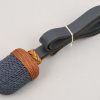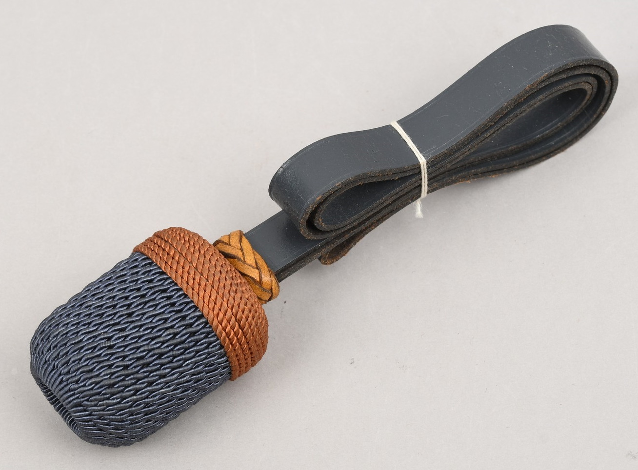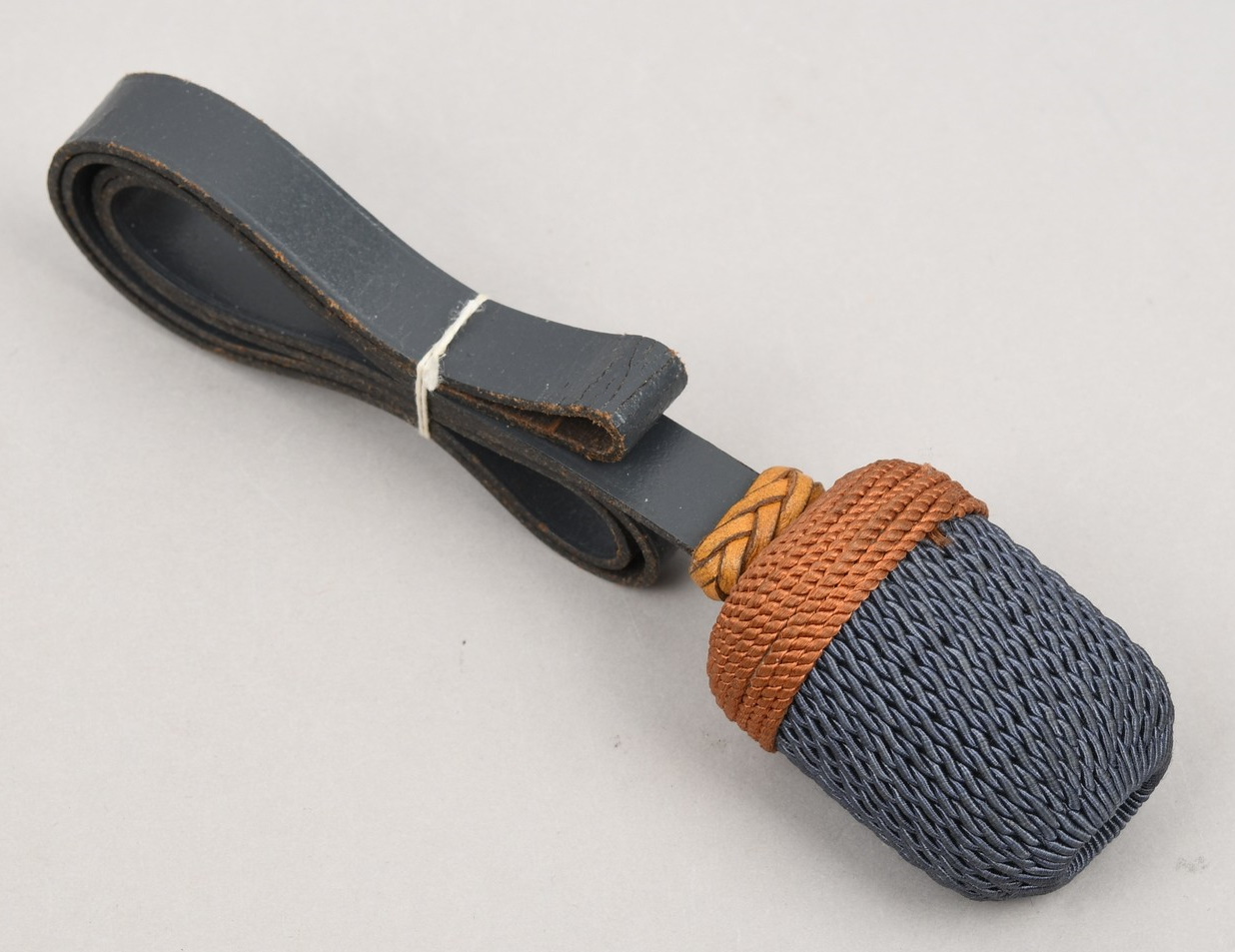 This troddel is equipped with fine grey leather strapping. The stem is a woven brown leather. The acorn cap is of signal brown yarnlike material and the lower ball is blue/grey yarnlike material. The stuffing is a grey/blue fabric. In close to mint condition!
