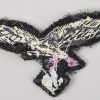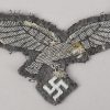 Hand embroidered, second pattern breast eagle in silver/aluminum wire threads, with bright silver bullion and off-white accent threads, on a cut-out Luftwaffe blue/grey wool base. Uniform removed with clear signs of age and use.