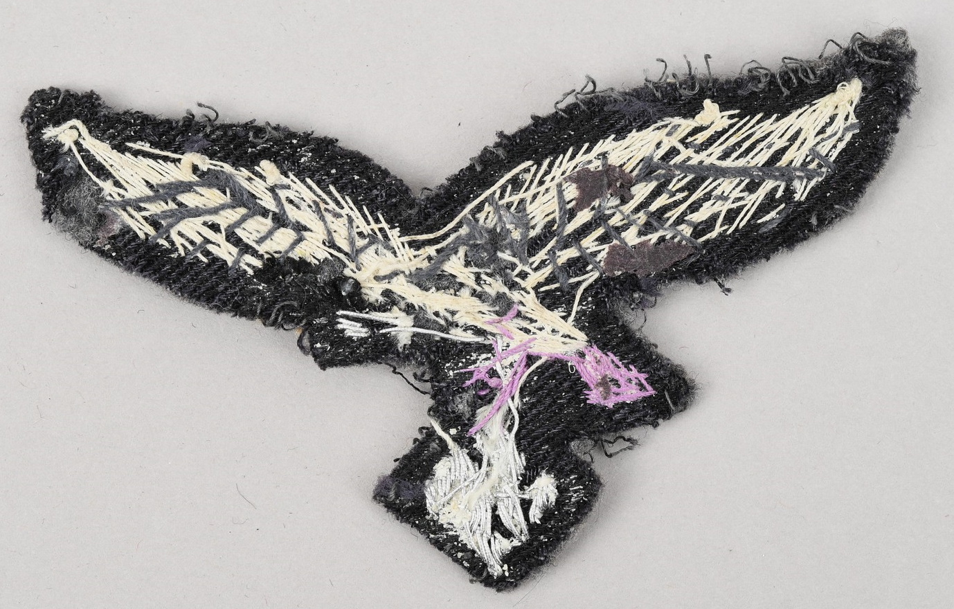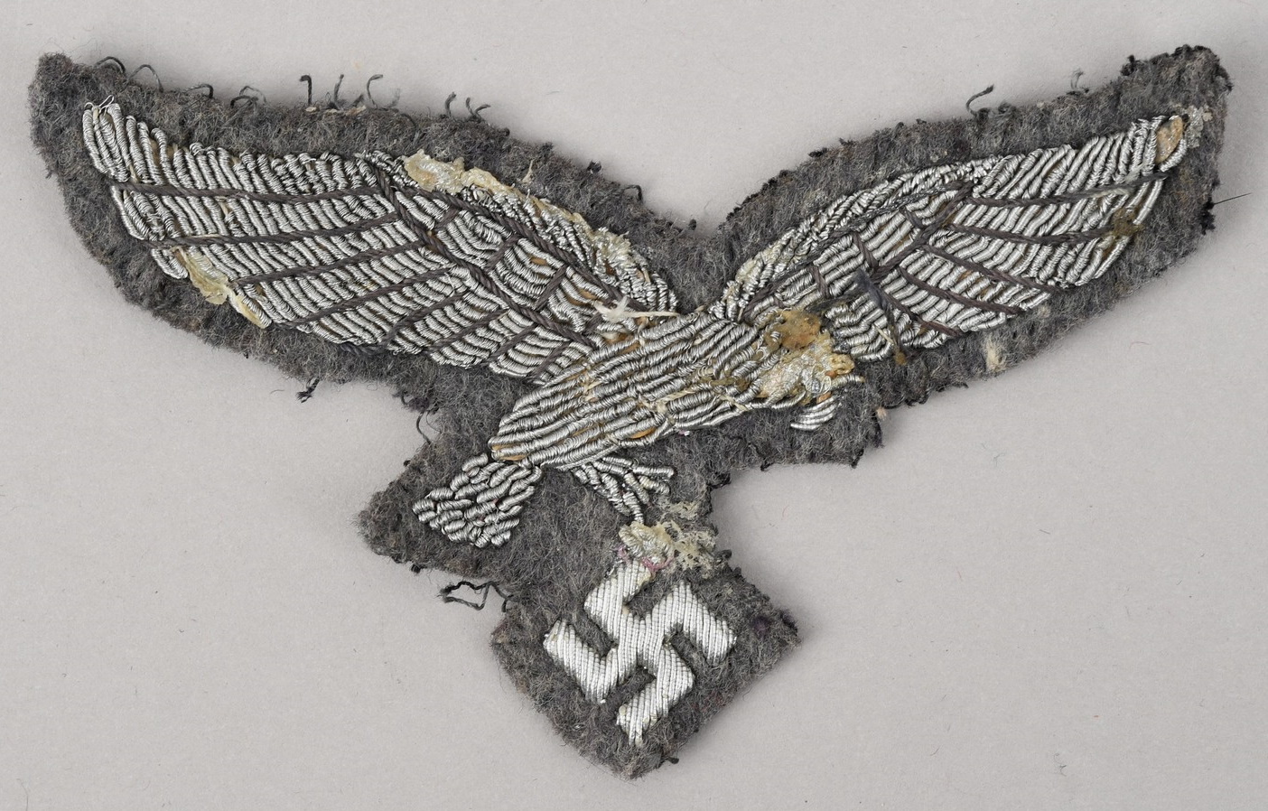 Hand embroidered, second pattern breast eagle in silver/aluminum wire threads, with bright silver bullion and off-white accent threads, on a cut-out Luftwaffe blue/grey wool base. Uniform removed with clear signs of age and use.