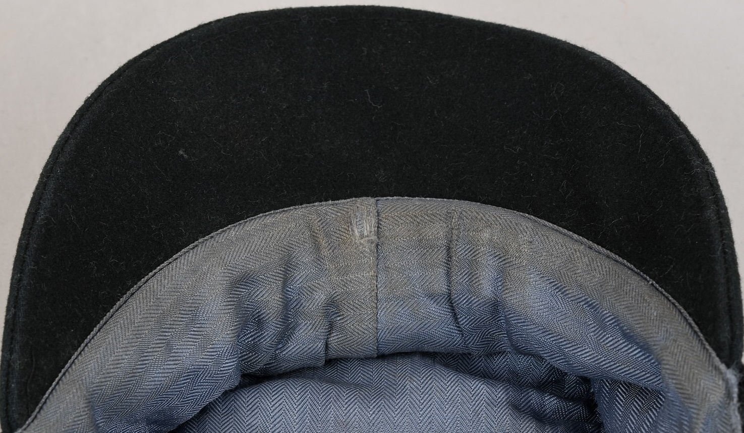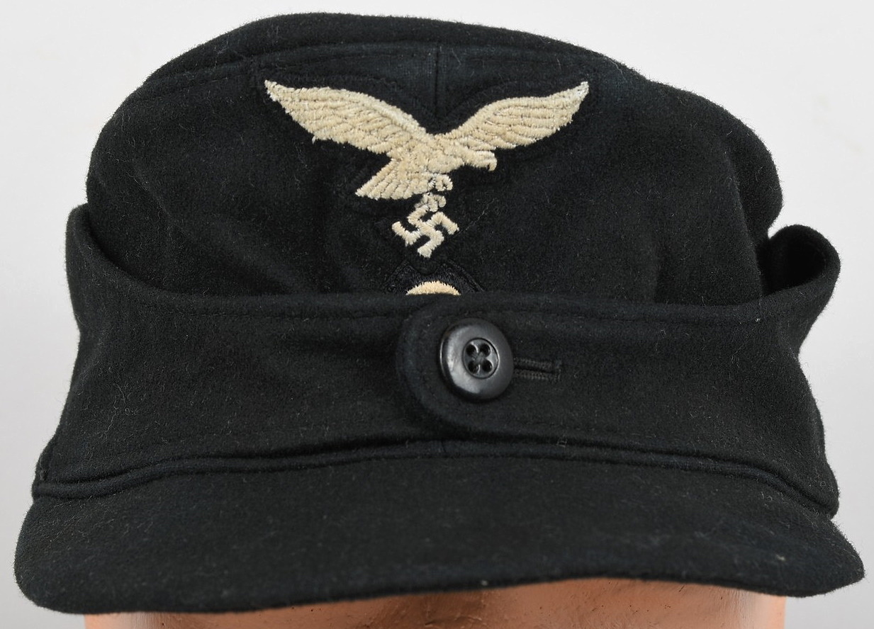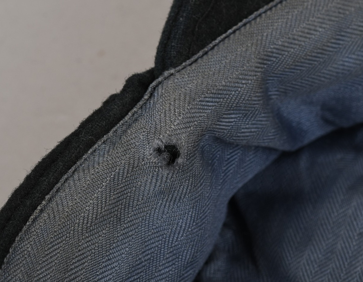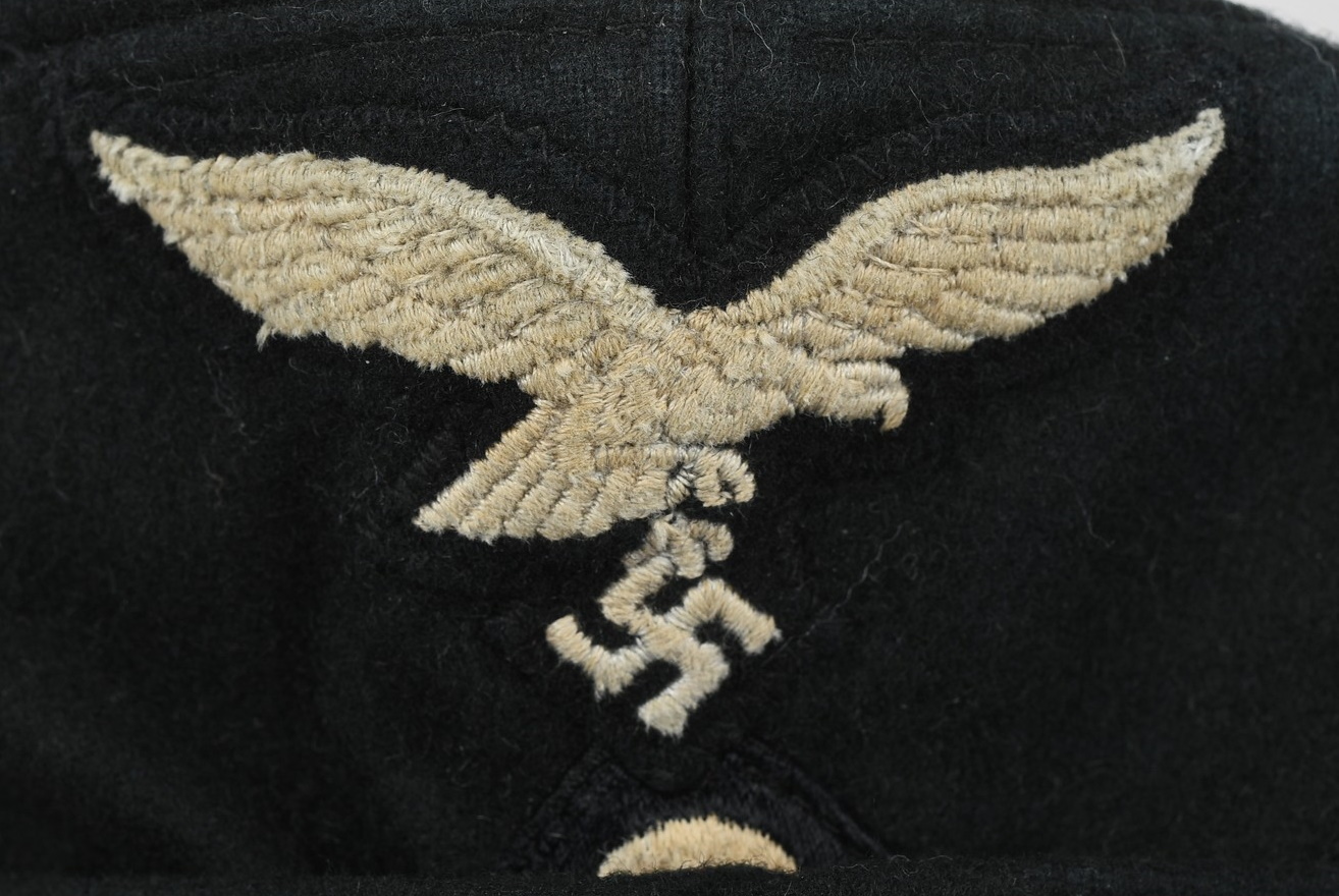 The cap is constructed of high quality black wool. Fold-down side panels, scalloped at the front, offering optional ear and neck protection to the wearer. The panels are secured in place with a single bakelite button. The cap has an extended, cloth covered, forward visor with an internal stiffener with a subtly raised lip to the top of the forward edge and a single row of reinforcement stitching to the bottom of the forward edge. Machine sewn to the front peak of the cap is a second pattern Luftwaffe, second pattern national eagle in silver grey threads on black cloth. Directly underneath the eagle is a machine-embroidered cockade on black rayon. The cockade is machine sewn in place. Inside is fully lined with blue-grey “fishbone” rayon. Inside has a very faint rbnr stamp in black ink. Size is about 57. The cap shows clear signs of real use with sweat stains to the lining, wear marks and one small hole, see pictures. Outside is rather clean with some build-up storage and wear dirt. No holes, tears or mendings.