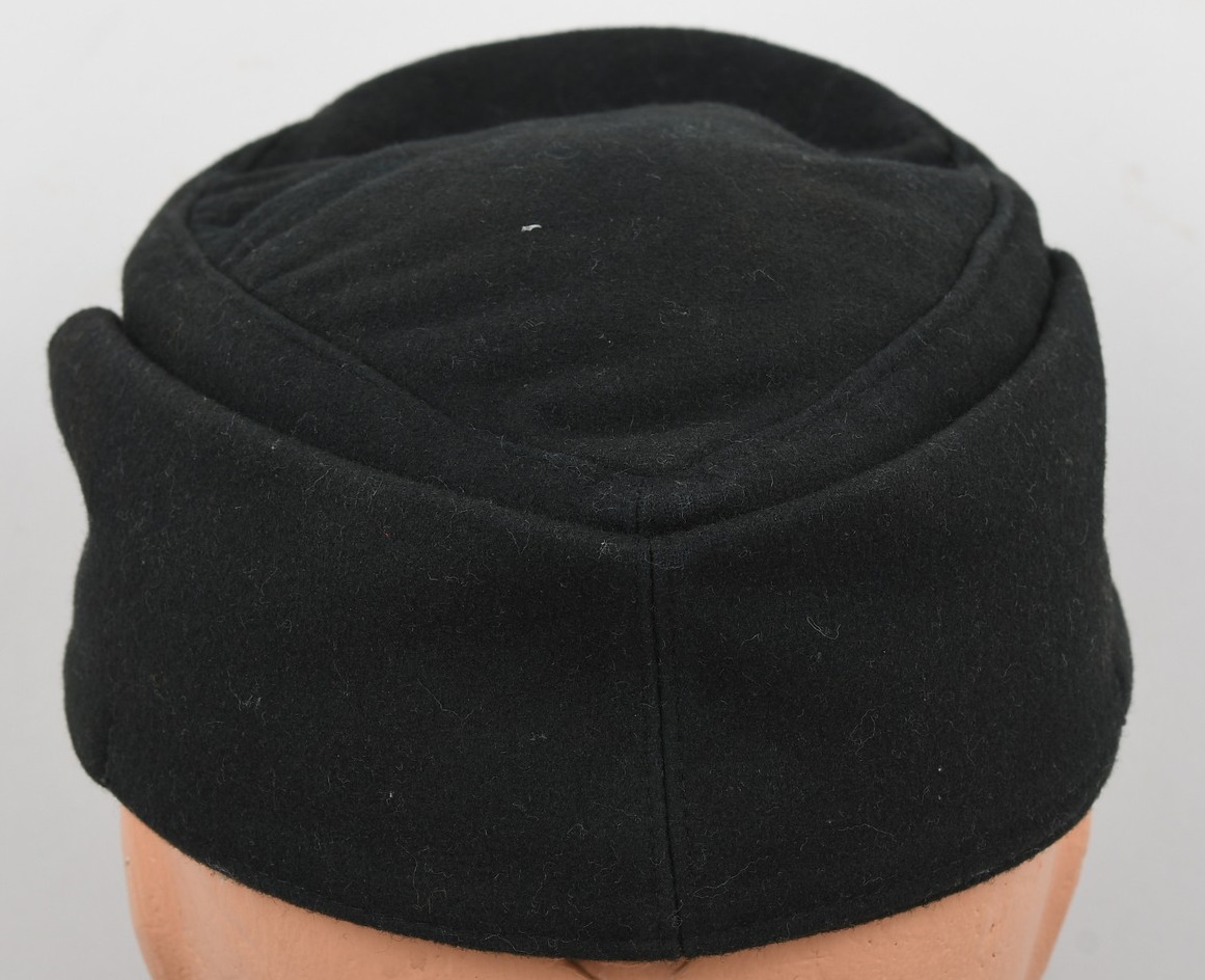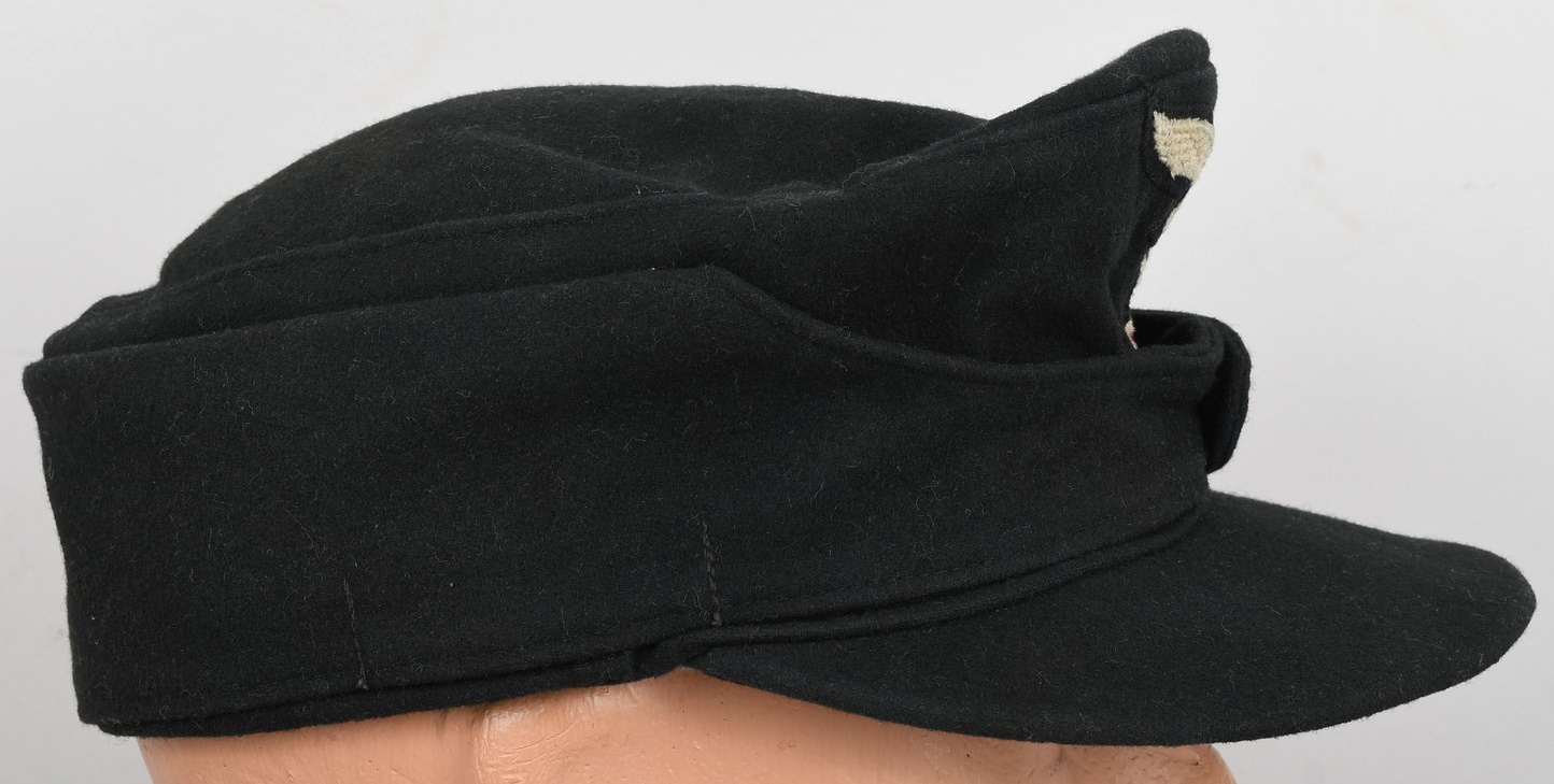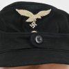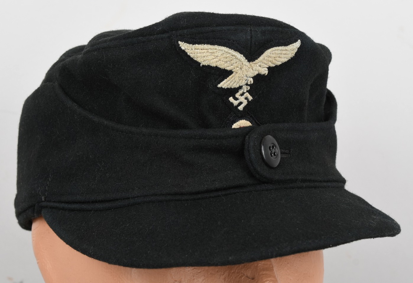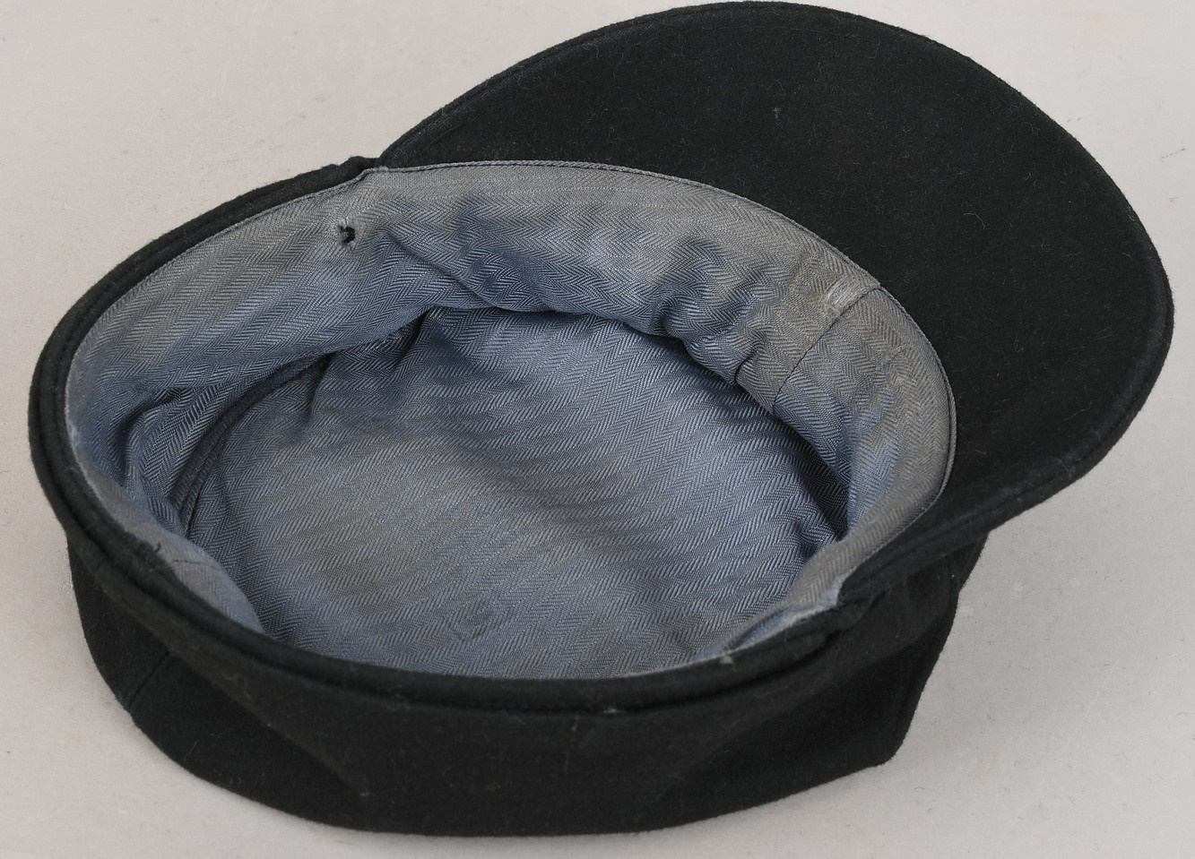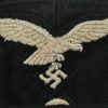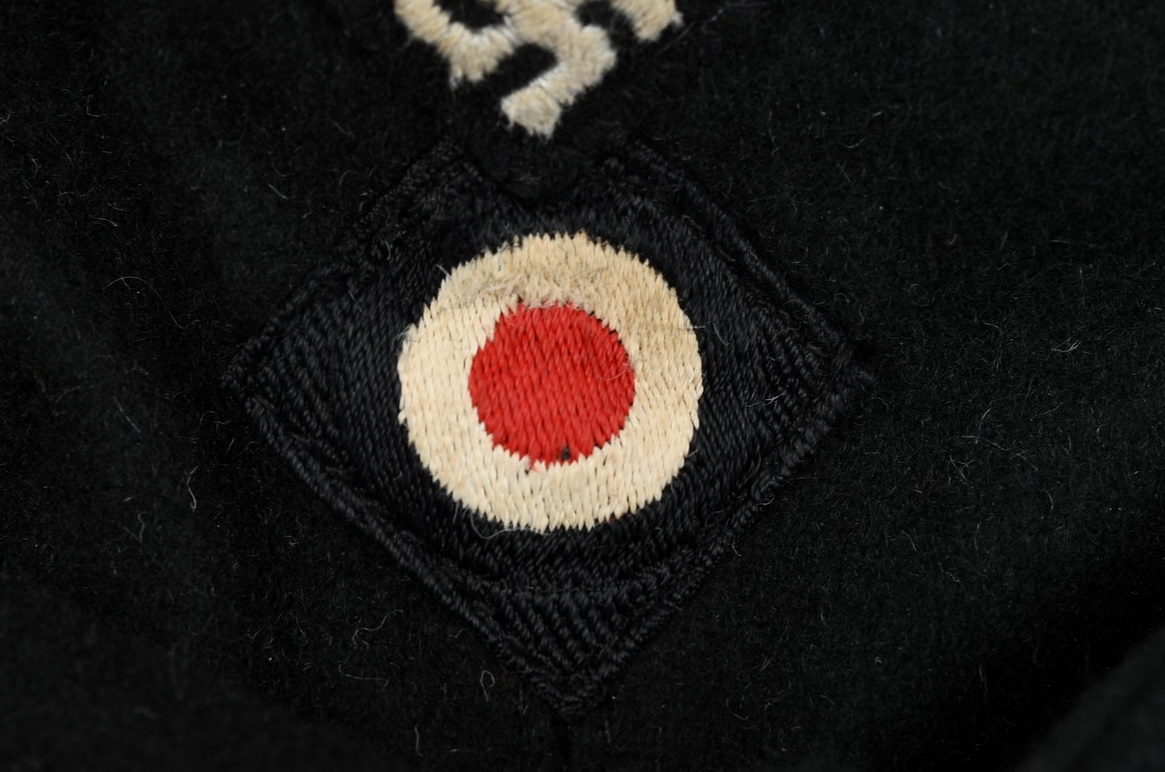 The cap is constructed of high quality black wool. Fold-down side panels, scalloped at the front, offering optional ear and neck protection to the wearer. The panels are secured in place with a single bakelite button. The cap has an extended, cloth covered, forward visor with an internal stiffener with a subtly raised lip to the top of the forward edge and a single row of reinforcement stitching to the bottom of the forward edge. Machine sewn to the front peak of the cap is a second pattern Luftwaffe, second pattern national eagle in silver grey threads on black cloth. Directly underneath the eagle is a machine-embroidered cockade on black rayon. The cockade is machine sewn in place. Inside is fully lined with blue-grey “fishbone” rayon. Inside has a very faint rbnr stamp in black ink. Size is about 57. The cap shows clear signs of real use with sweat stains to the lining, wear marks and one small hole, see pictures. Outside is rather clean with some build-up storage and wear dirt. No holes, tears or mendings.
