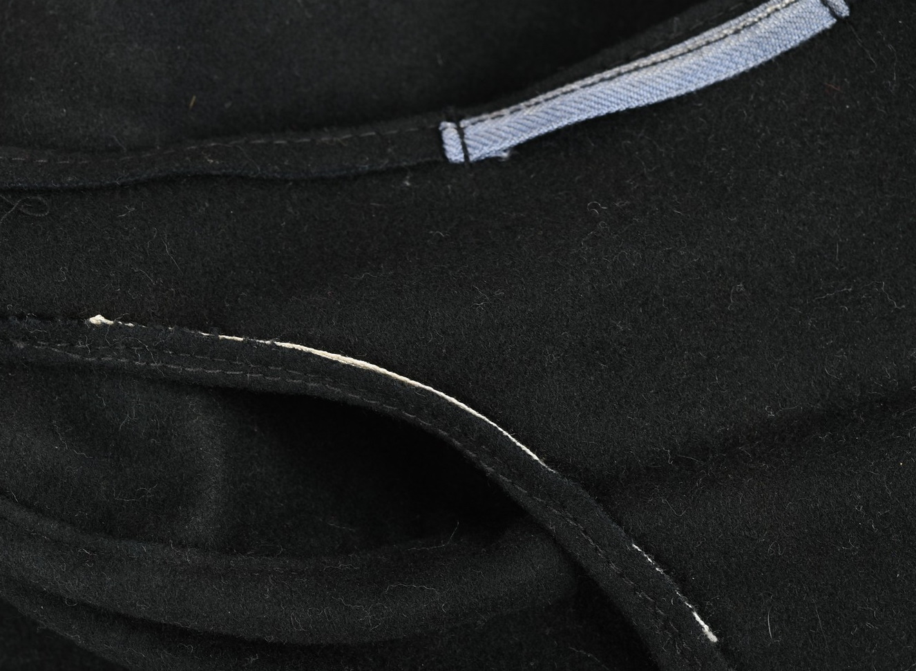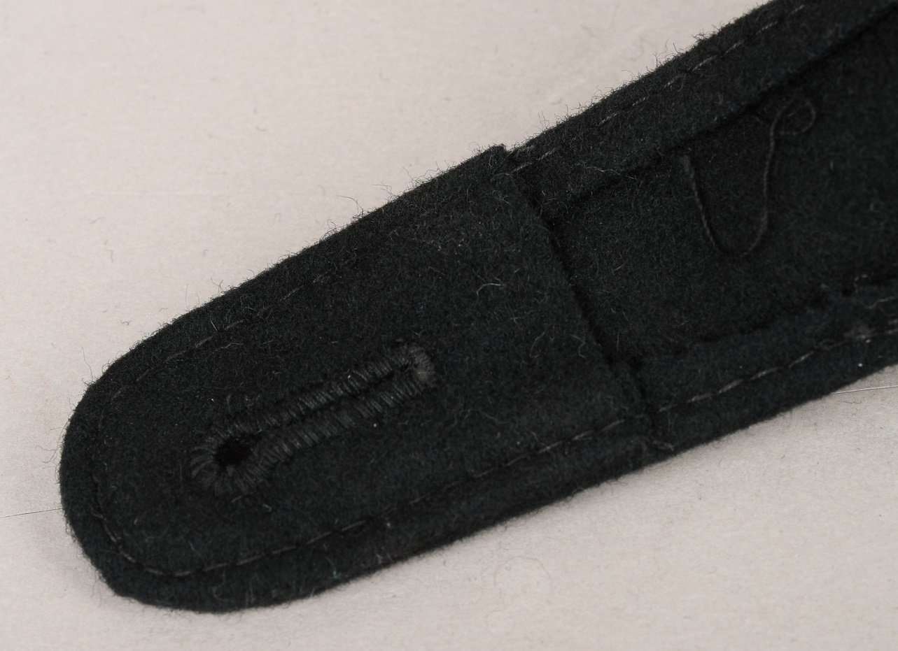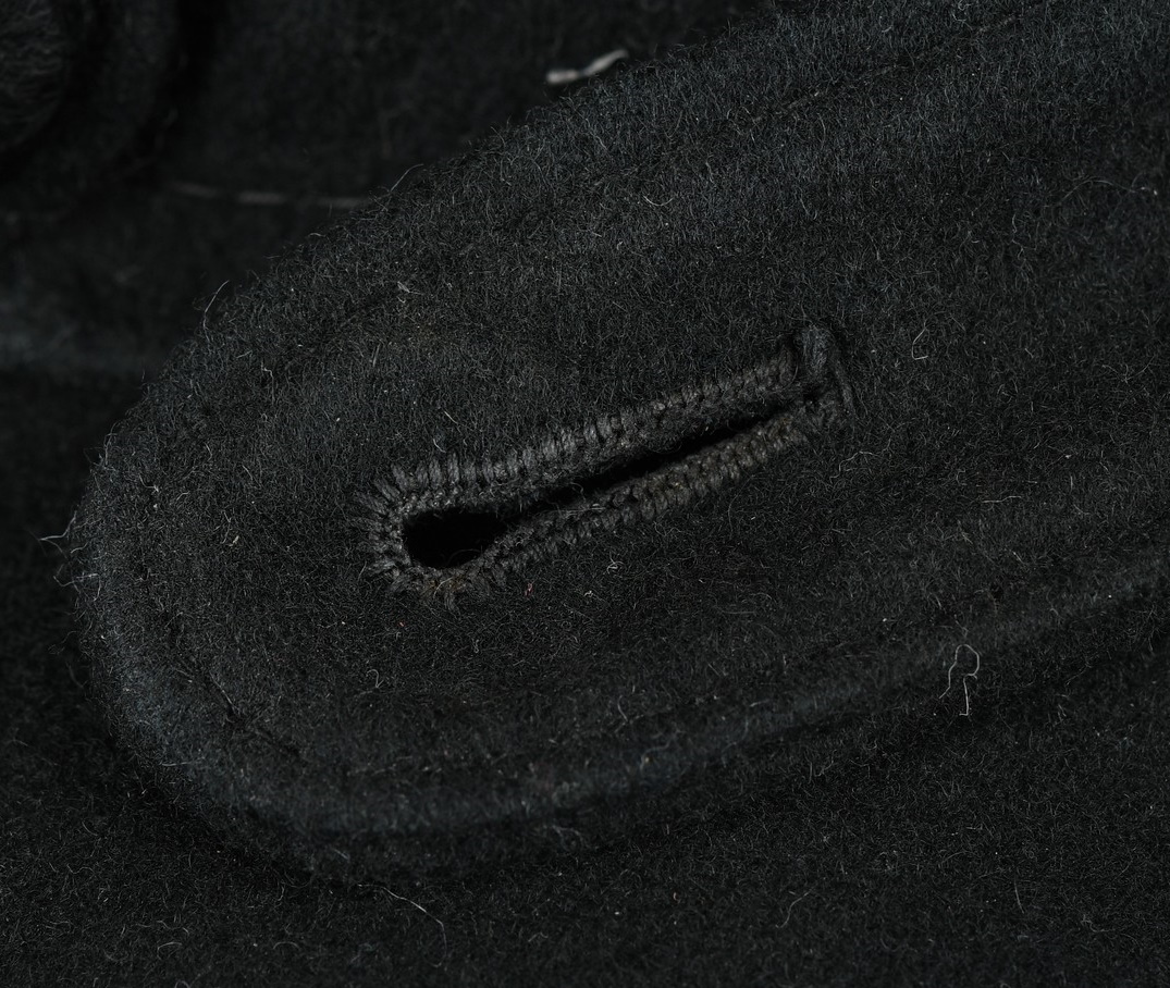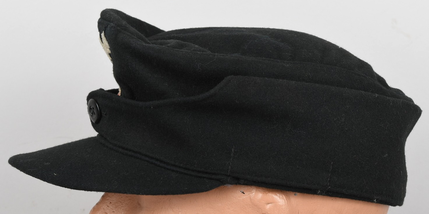 The cap is constructed of high quality black wool. Fold-down side panels, scalloped at the front, offering optional ear and neck protection to the wearer. The panels are secured in place with a single bakelite button. The cap has an extended, cloth covered, forward visor with an internal stiffener with a subtly raised lip to the top of the forward edge and a single row of reinforcement stitching to the bottom of the forward edge. Machine sewn to the front peak of the cap is a second pattern Luftwaffe, second pattern national eagle in silver grey threads on black cloth. Directly underneath the eagle is a machine-embroidered cockade on black rayon. The cockade is machine sewn in place. Inside is fully lined with blue-grey “fishbone” rayon. Inside has a very faint rbnr stamp in black ink. Size is about 57. The cap shows clear signs of real use with sweat stains to the lining, wear marks and one small hole, see pictures. Outside is rather clean with some build-up storage and wear dirt. No holes, tears or mendings.