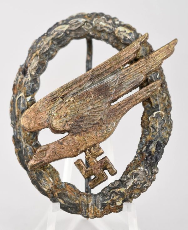 Luftwaffe paratrooper badge maker marked “A” to the reverse for “Assmann & Söhne, Lüdenscheid”. Late war die injection mold zinc Assmann wreath with silver finished Assmann marked eagle. Two piece construction with both rivets still intact. Soldered on hinge and catch intact as well as the pin. The badge shows clear signs of age with some pitting and there is a small damage to the wreath.