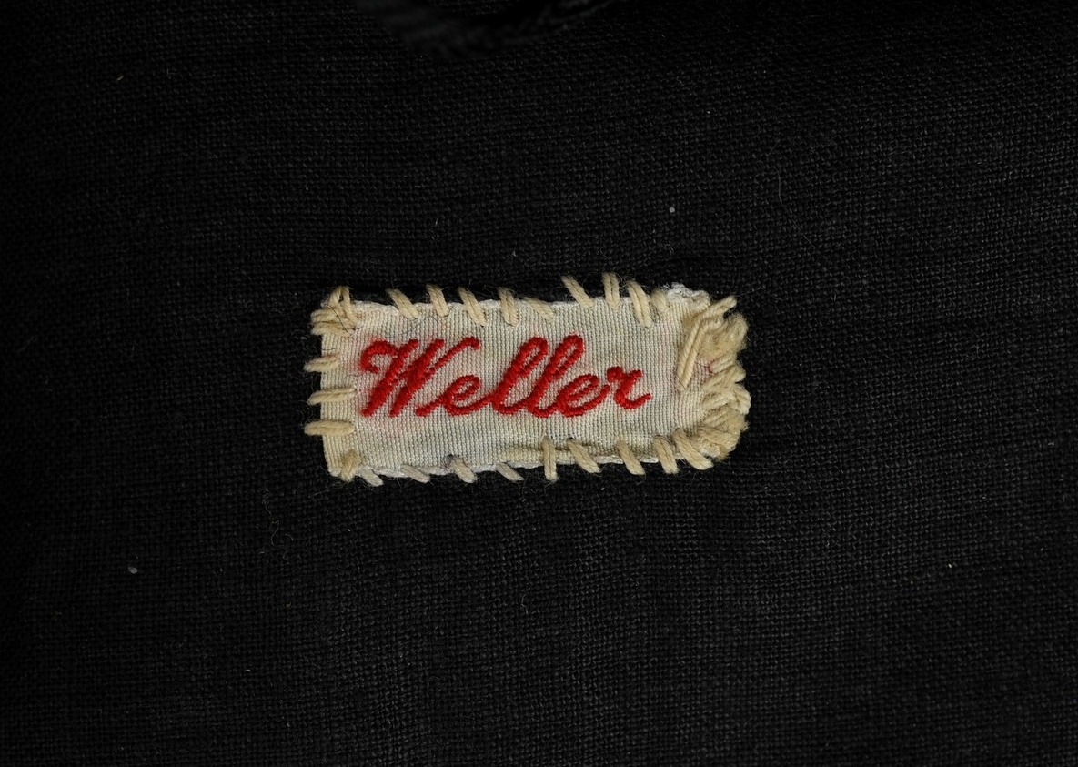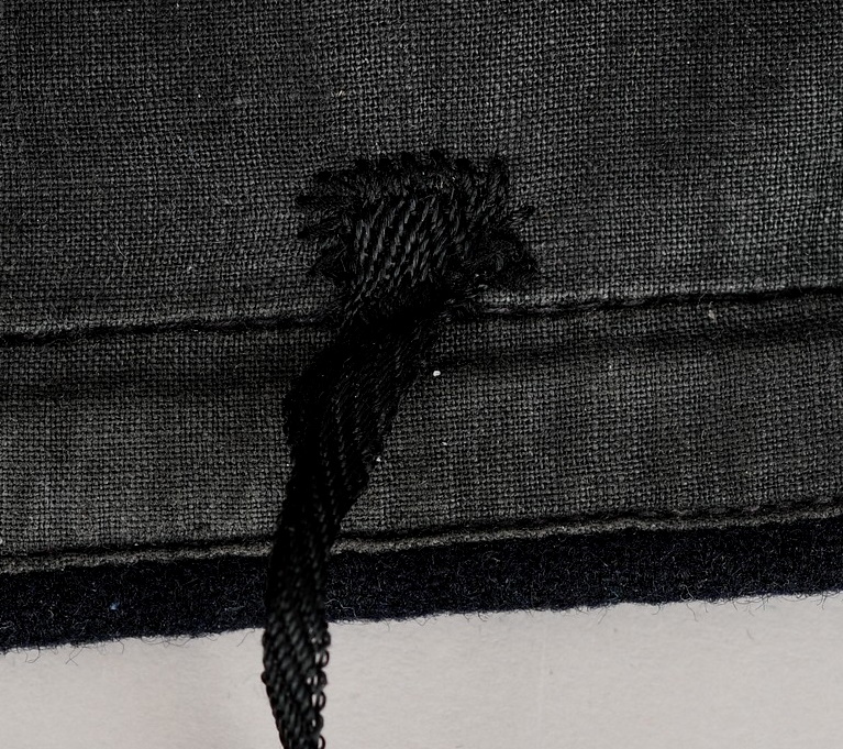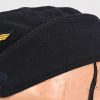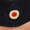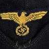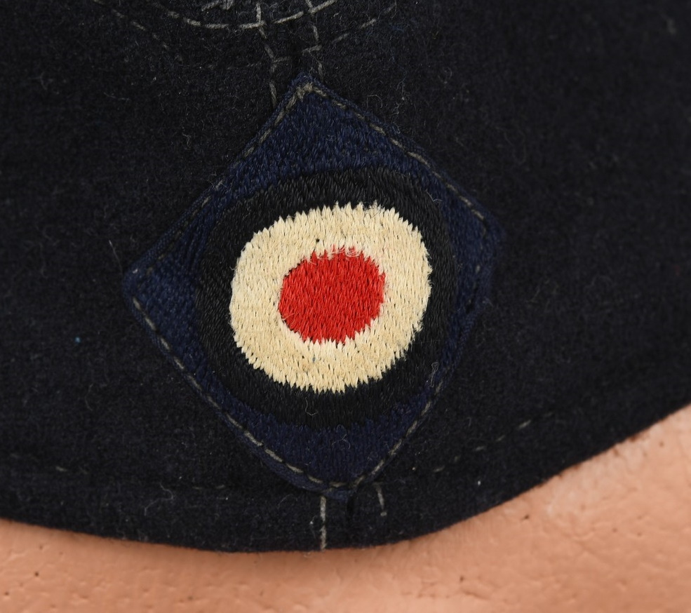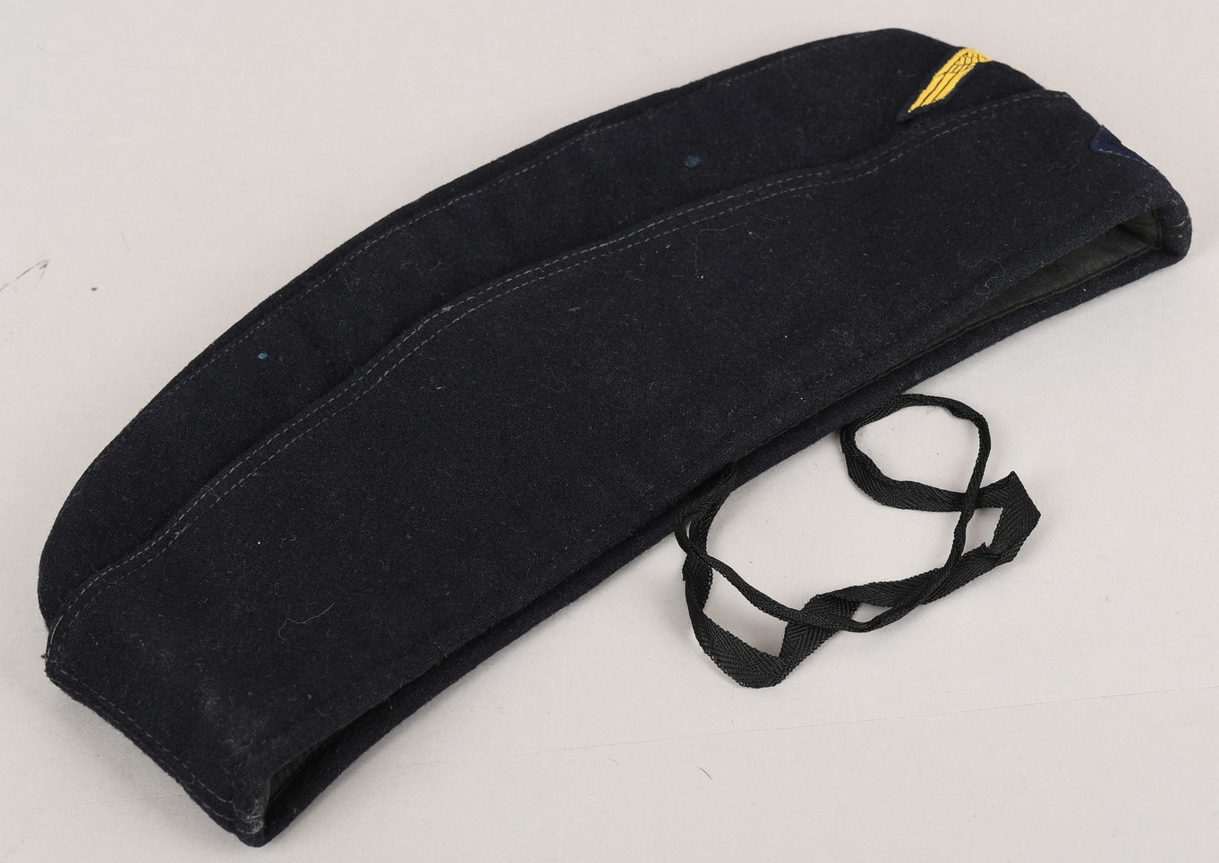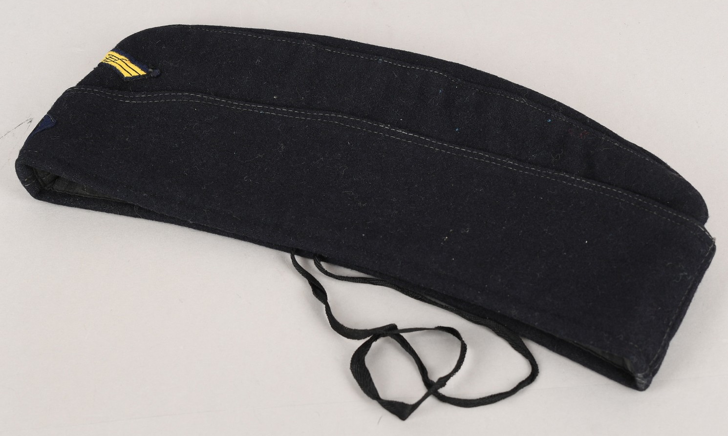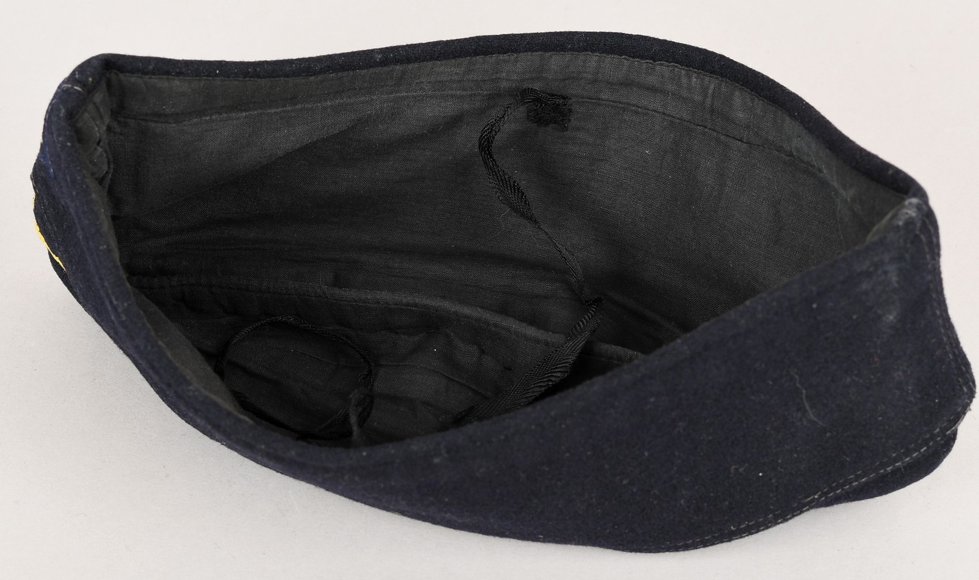 1939 pattern cap, produced of blue wool with fold down side and back panels. The front center of the cap has a machine woven national eagle in golden yellow threads on a navy blue, rayon base. The front center of the fold down panels has a machine woven national tri-color cockade, on a woven, navy blue, rayon diamond shaped base. The eagle was hand sewn in place and the cockarde machine sewn, both original to the cap. The interior of the cap is fully lined in light weight black cotton. Inside with original name tag sewn in place. The cap also has a blue/black rayon chin strap sewn in place. A clever solution to keep the cap in place during a stormy night at sea. The cap is in good condition with light signs of age and use. No holes, rips or mendings.