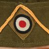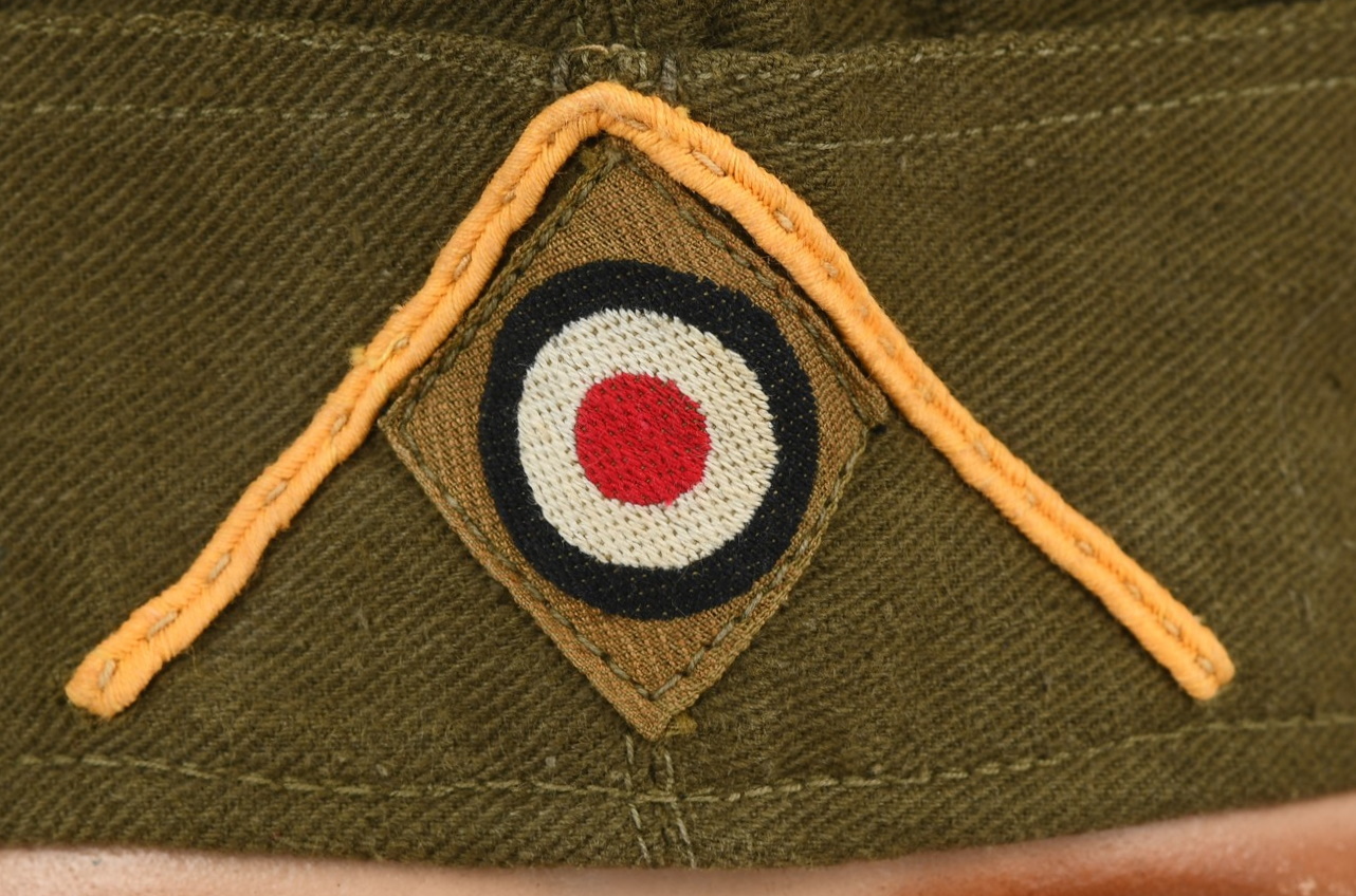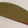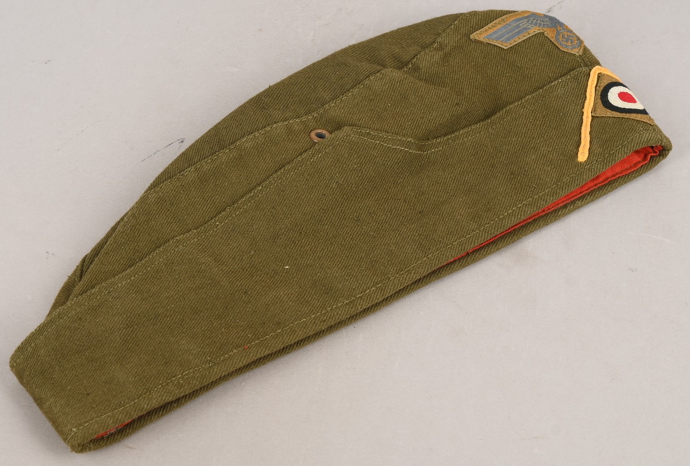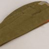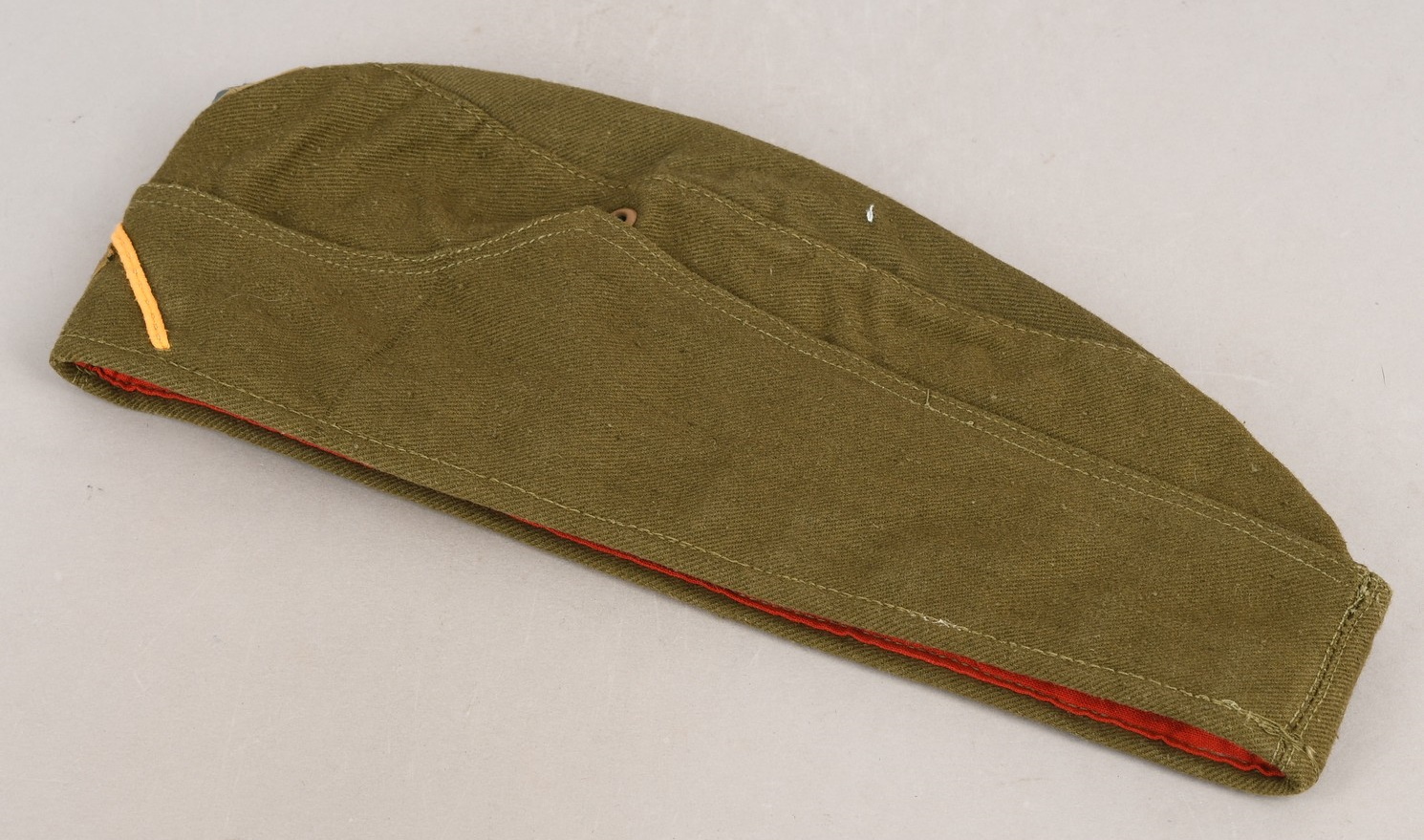 Ribbed olive/khaki, cotton twill construction cap with fold down side and back panels with gently sloping, downward scallops to the front and the forward sides. As is typical the fold down panels are handstitched in the upright position at the front center of the cap. The cap has a tan painted, metal alloy ventilation grommet to both sides situated just below the crown edge. The cap grommets retain all of their original tan paint. The top center seam is correctly stitched right through the interior liner, for added strength. The front center of the cap has a machine woven, national eagle in light blue/grey cotton threads, on a cut-out, woven, tan rayon base. The front center of the fold down panels has a machine woven, national tri-color cockade on a woven, tan, diamond shaped, rayon base. Both the eagle and the cockade are machine sewn to the cap. The tri-color cockade is flanked by an inverted “V”, in golden yellow rayon branch of service soutache. The soutache has been applied in the correct manner, being machine stitched in place and inserted through two small puncture holes near the bottom edge of the cap. The interior of the cap is fully lined in light weight red cotton. The lining is well marked with a black size inkstamp, “57” and a manufacturer code “1142”. There is also a blacked out square, could be the manufacturers name or the former owners name. The cap is in very good condition with light signs of age.