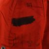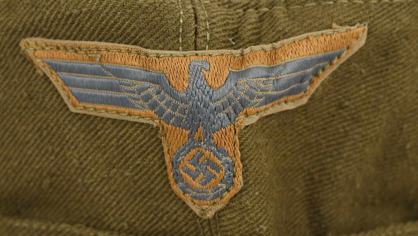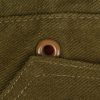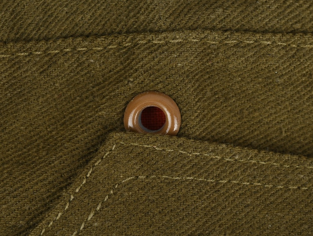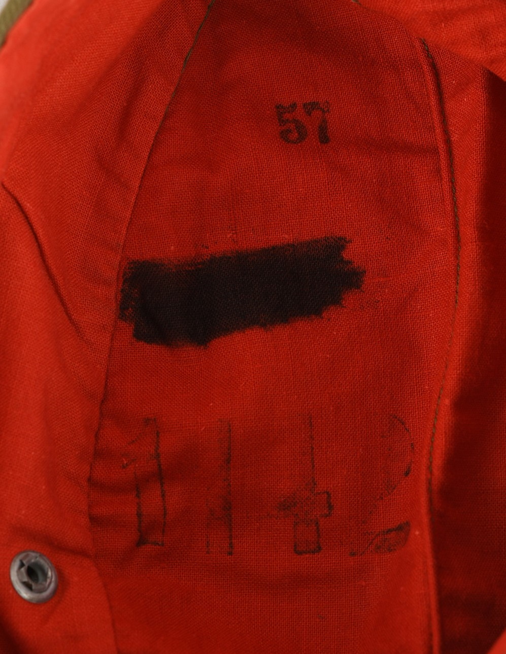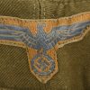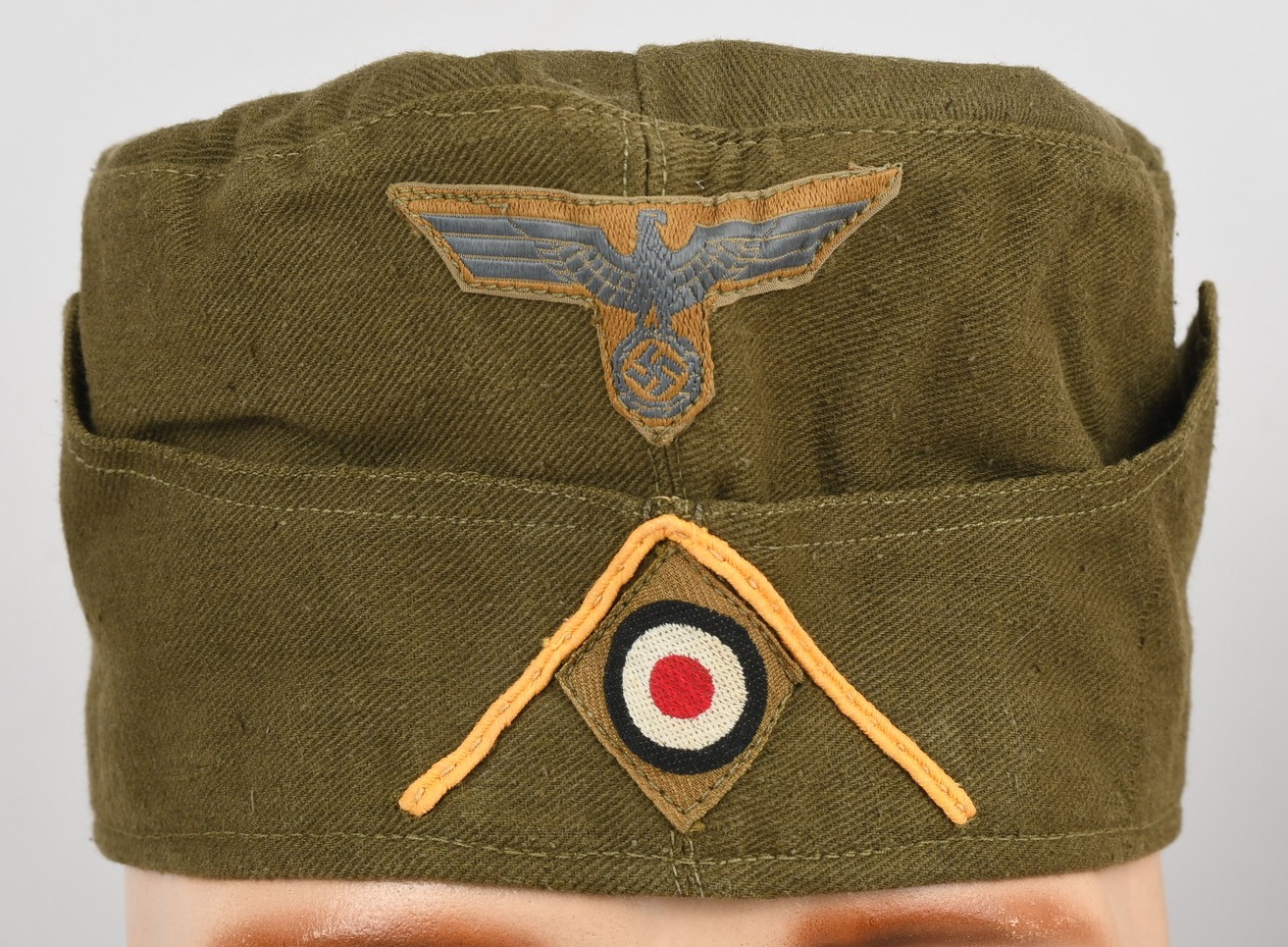 Ribbed olive/khaki, cotton twill construction cap with fold down side and back panels with gently sloping, downward scallops to the front and the forward sides. As is typical the fold down panels are handstitched in the upright position at the front center of the cap. The cap has a tan painted, metal alloy ventilation grommet to both sides situated just below the crown edge. The cap grommets retain all of their original tan paint. The top center seam is correctly stitched right through the interior liner, for added strength. The front center of the cap has a machine woven, national eagle in light blue/grey cotton threads, on a cut-out, woven, tan rayon base. The front center of the fold down panels has a machine woven, national tri-color cockade on a woven, tan, diamond shaped, rayon base. Both the eagle and the cockade are machine sewn to the cap. The tri-color cockade is flanked by an inverted “V”, in golden yellow rayon branch of service soutache. The soutache has been applied in the correct manner, being machine stitched in place and inserted through two small puncture holes near the bottom edge of the cap. The interior of the cap is fully lined in light weight red cotton. The lining is well marked with a black size inkstamp, “57” and a manufacturer code “1142”. There is also a blacked out square, could be the manufacturers name or the former owners name. The cap is in very good condition with light signs of age.
