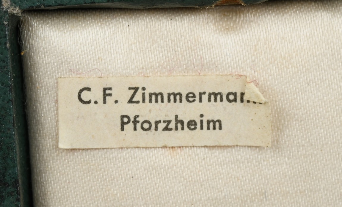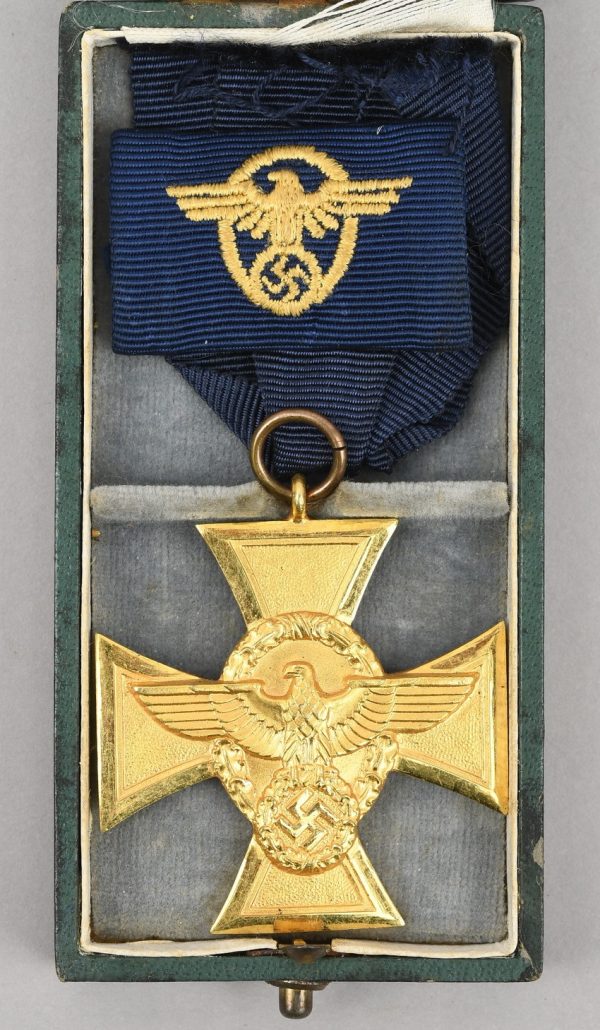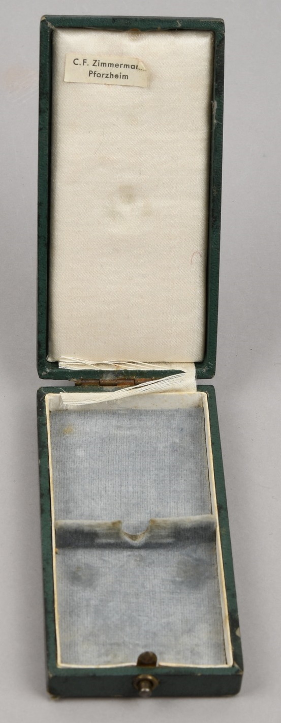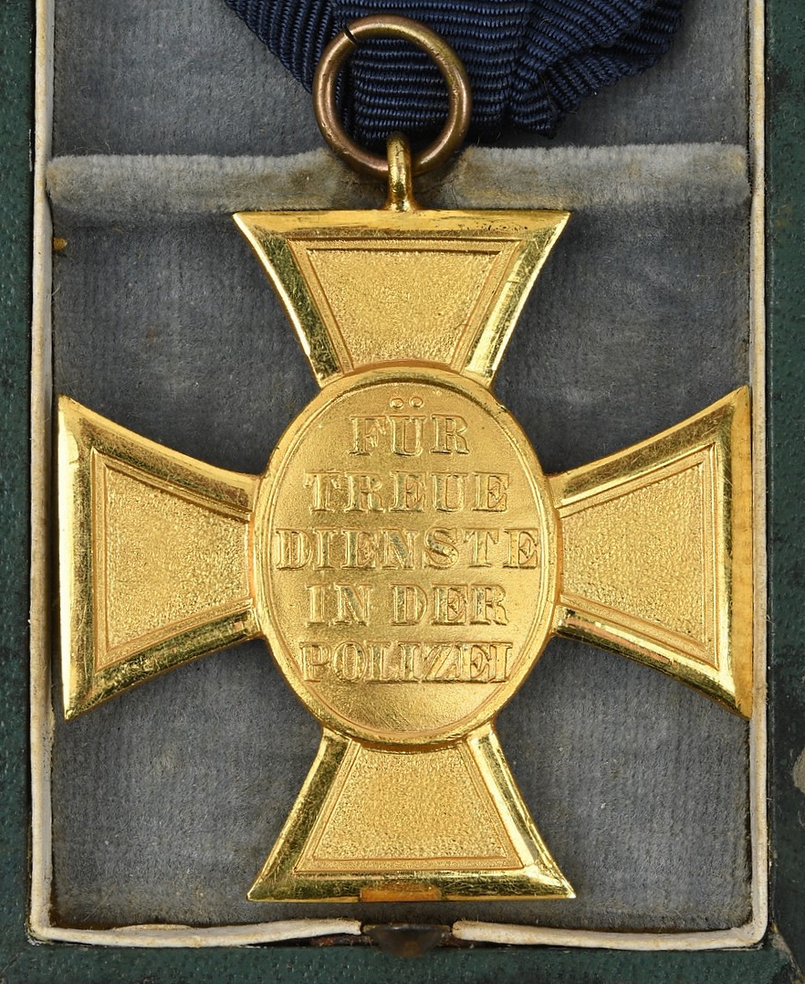 First class, die struck alloy award with a fire gilt finish for twenty-five years service. The fire gilt finish is fully retained and still quite bright. Ribbon suspension loop and ring both intact. The award comes complete with its original cornflower blue, ribbed rayon ribbon. The medal also comes with a machine embroidered, wreathed police eagle in golden yellow threads mounted on a ribbon. Award comes housed it’s original case with mid-green simulated leather cover. Top lid has an impressed oak-leaf wreath encompassing the numeral, “25”. Internal bar hinge still functions nicely. Interior with white satin lining to top with manufacturers sticker label still in place, it reads: “C.F. Zimmermann Pforzheim”. Bottom with grey velvet lining with raised retaining arm with cut-out recess to hold the award in place. The medal is in close to mint condition, the case shows clear signs of age.