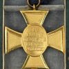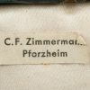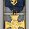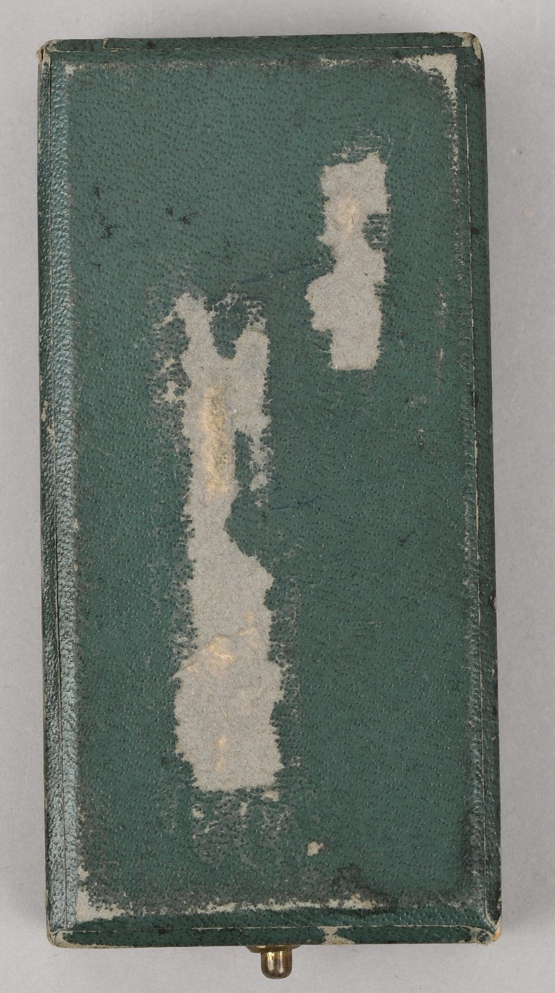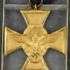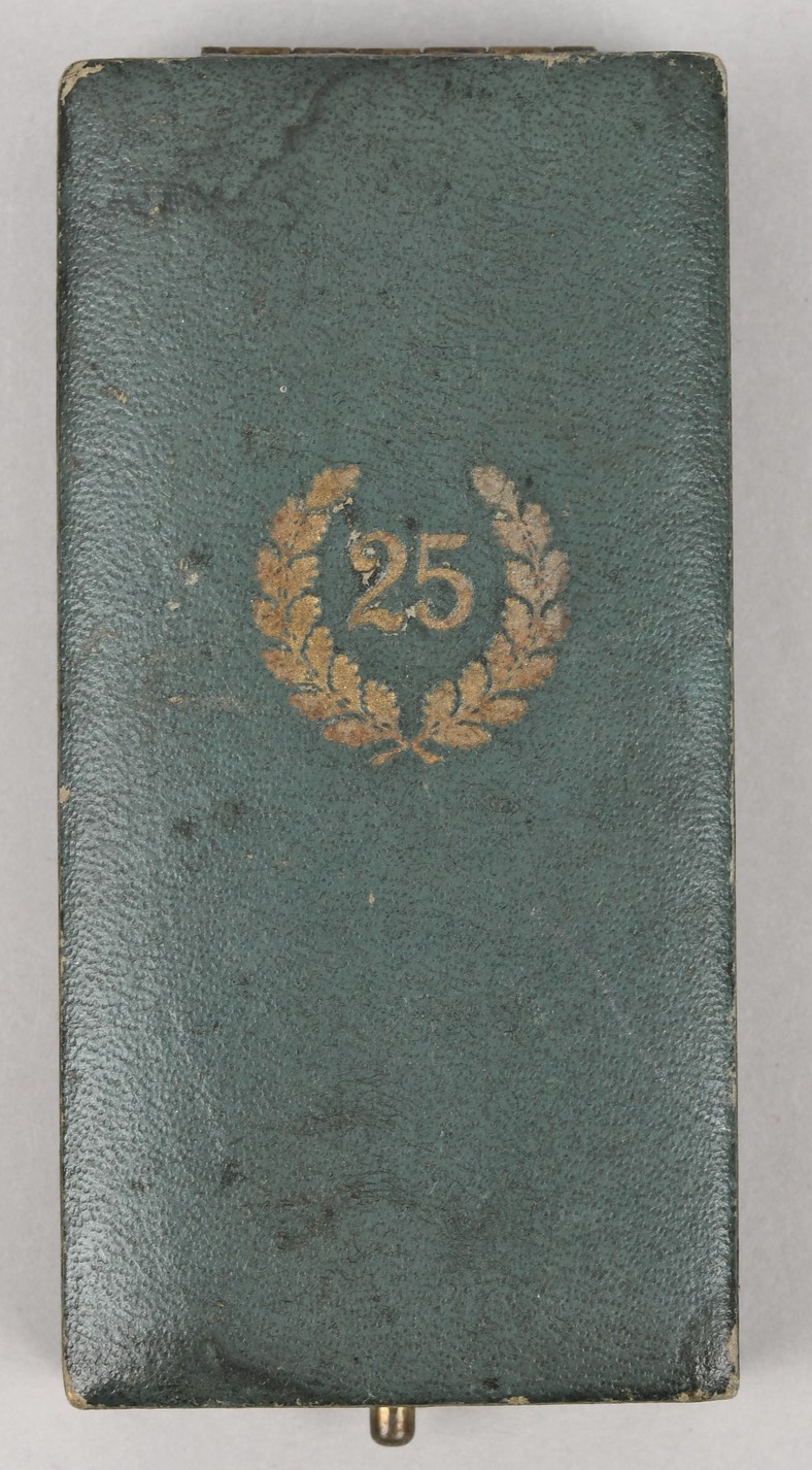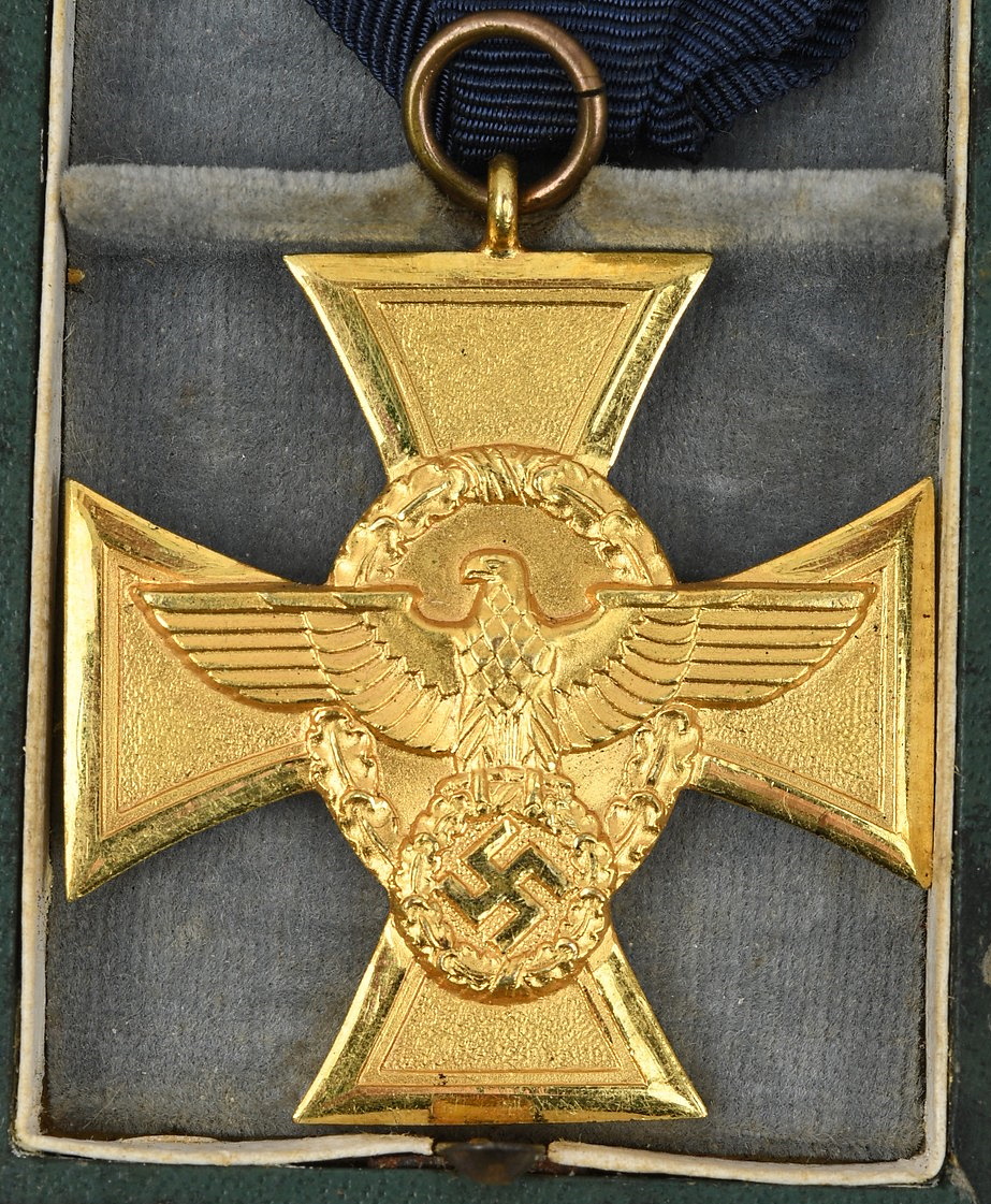 First class, die struck alloy award with a fire gilt finish for twenty-five years service. The fire gilt finish is fully retained and still quite bright. Ribbon suspension loop and ring both intact. The award comes complete with its original cornflower blue, ribbed rayon ribbon. The medal also comes with a machine embroidered, wreathed police eagle in golden yellow threads mounted on a ribbon. Award comes housed it’s original case with mid-green simulated leather cover. Top lid has an impressed oak-leaf wreath encompassing the numeral, “25”. Internal bar hinge still functions nicely. Interior with white satin lining to top with manufacturers sticker label still in place, it reads: “C.F. Zimmermann Pforzheim”. Bottom with grey velvet lining with raised retaining arm with cut-out recess to hold the award in place. The medal is in close to mint condition, the case shows clear signs of age.